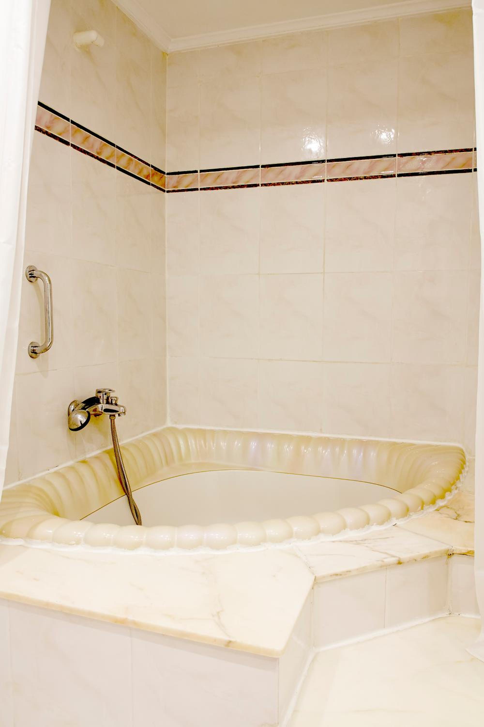 Upon checking in, we were giving the keys to our room and first thing we noticed was the tape on the electrical wire for the television, which we later found out did not work. The bath was lined with a blue liquid and the plug area was chipped and rusting…