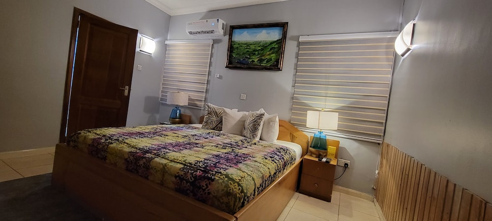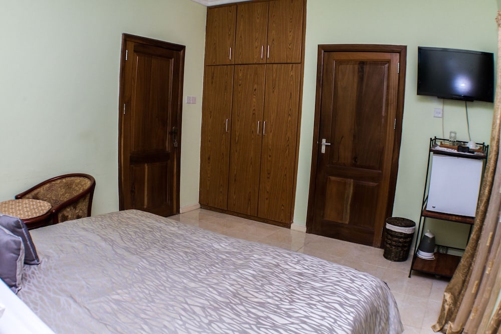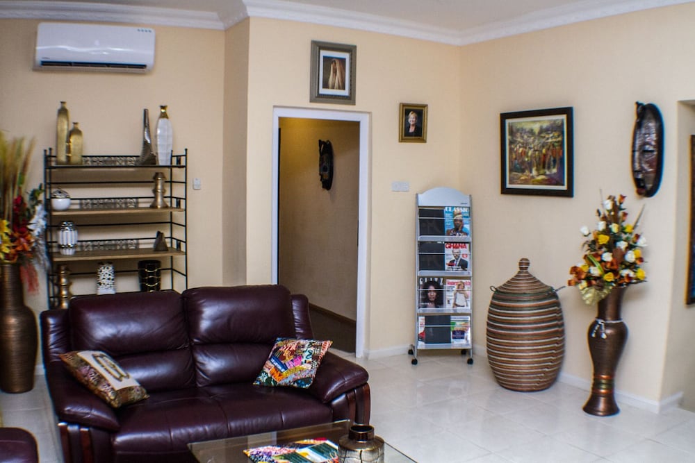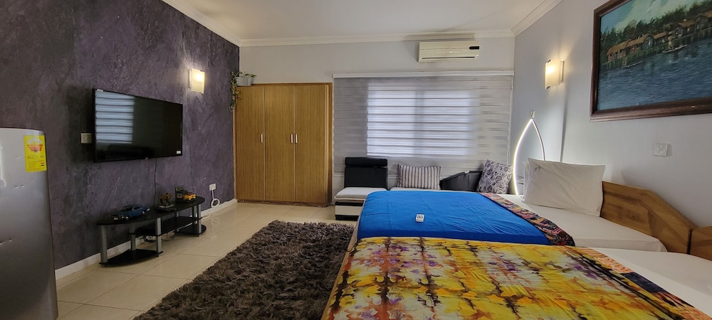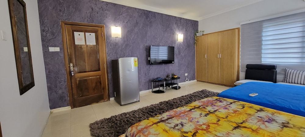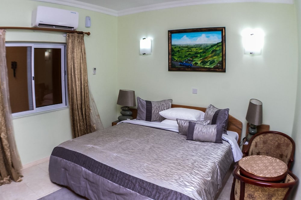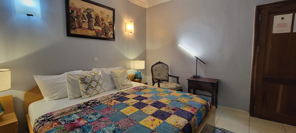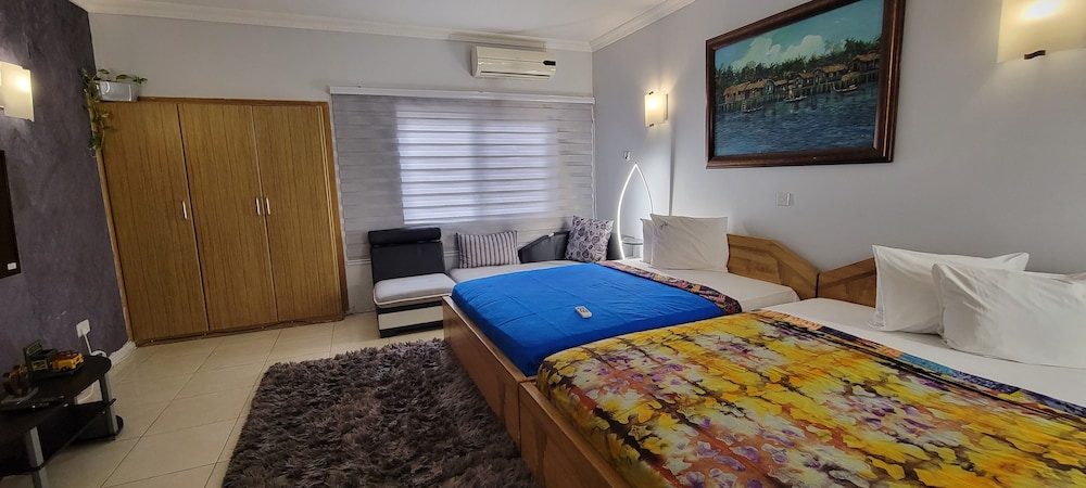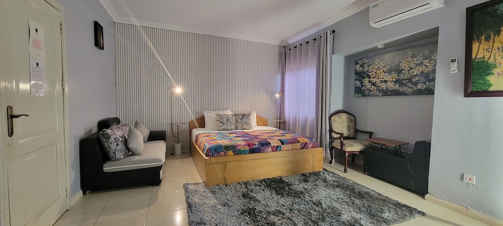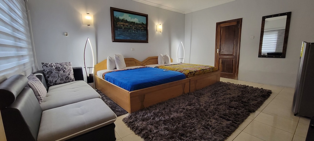 Stayed with my wife and 3 kids in a family room. Hotel is small but well furnished, great AC to keep cool, and clean bathrooms. Generally better than the impression the photos give! Unfortunately broken shower (electrical fault) and broken wifi while we were there, but this is generally unsurprising for us in Ghana. Staff were really kind to my youngest son who had bad earache overnight, and were happy to head out and get us medicine and water bottles. They arranged a reasonable airport transfer van which was on-time and reliable. Overall good value and we had a great night's sleep in comfy beds. Breakfast options a little limited, but there are pancake, cupcake, yoghurt bar places less than a hundred yards down the road, as well as an Italian and Turkish restaurants.