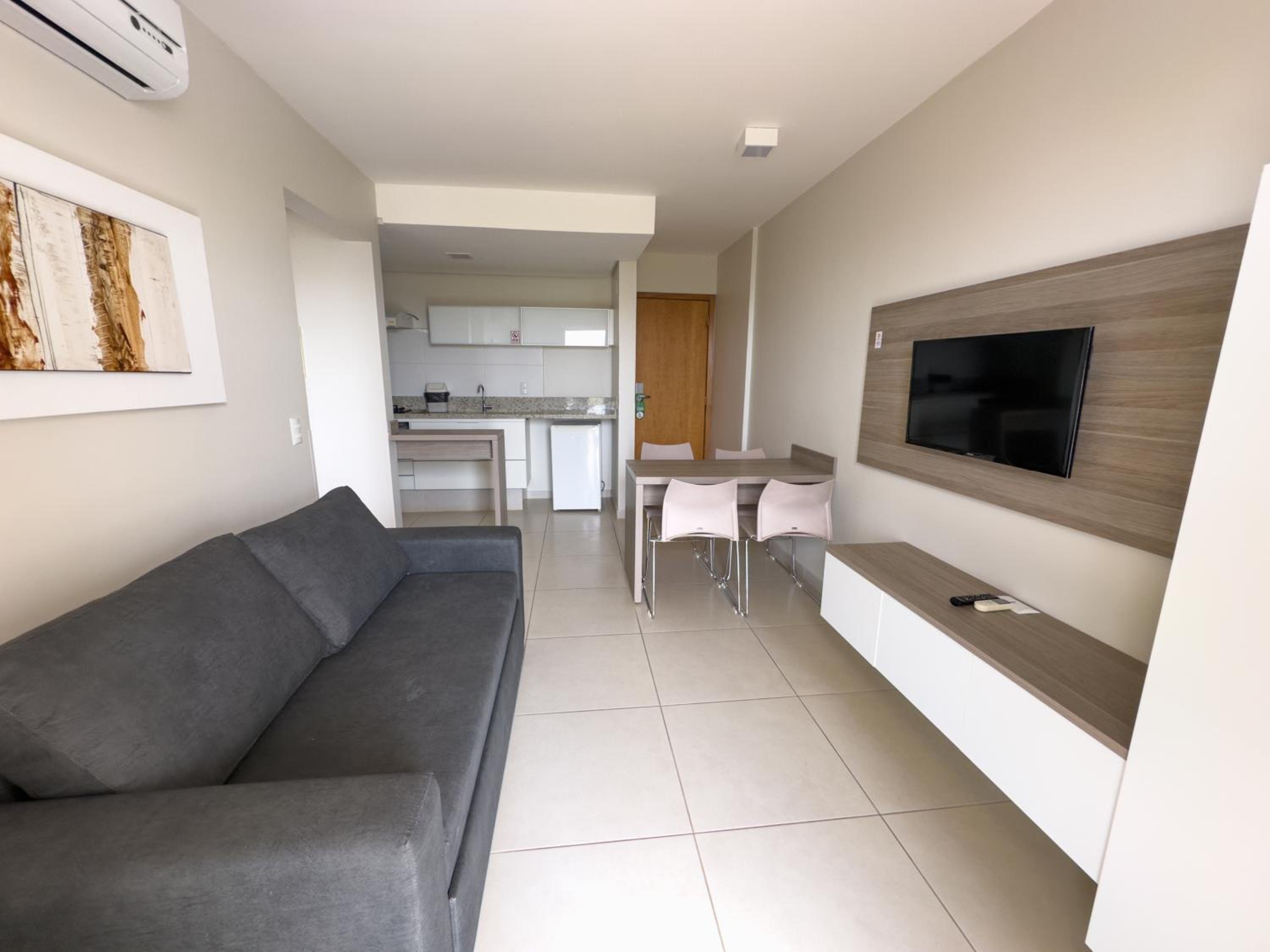 Experience comfort and convenience at Privê Atrium Thermas Residence Service in Caldas Novas. Our rooms feature air conditioning, free WiFi, and a kitchenette complete with a minibar and microwave. Each unit also boasts a living room with a flat-screen TV for your entertainment.