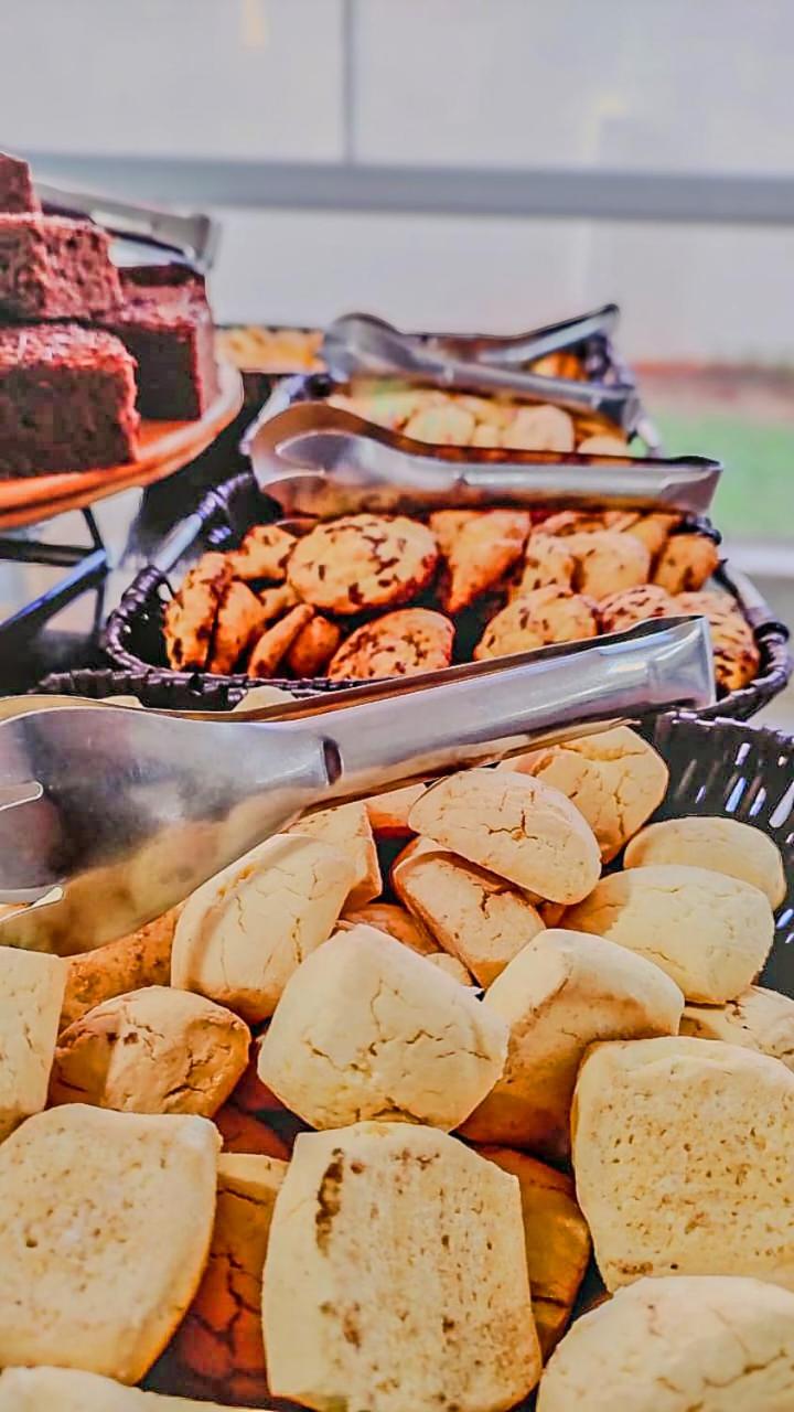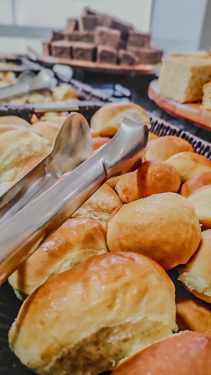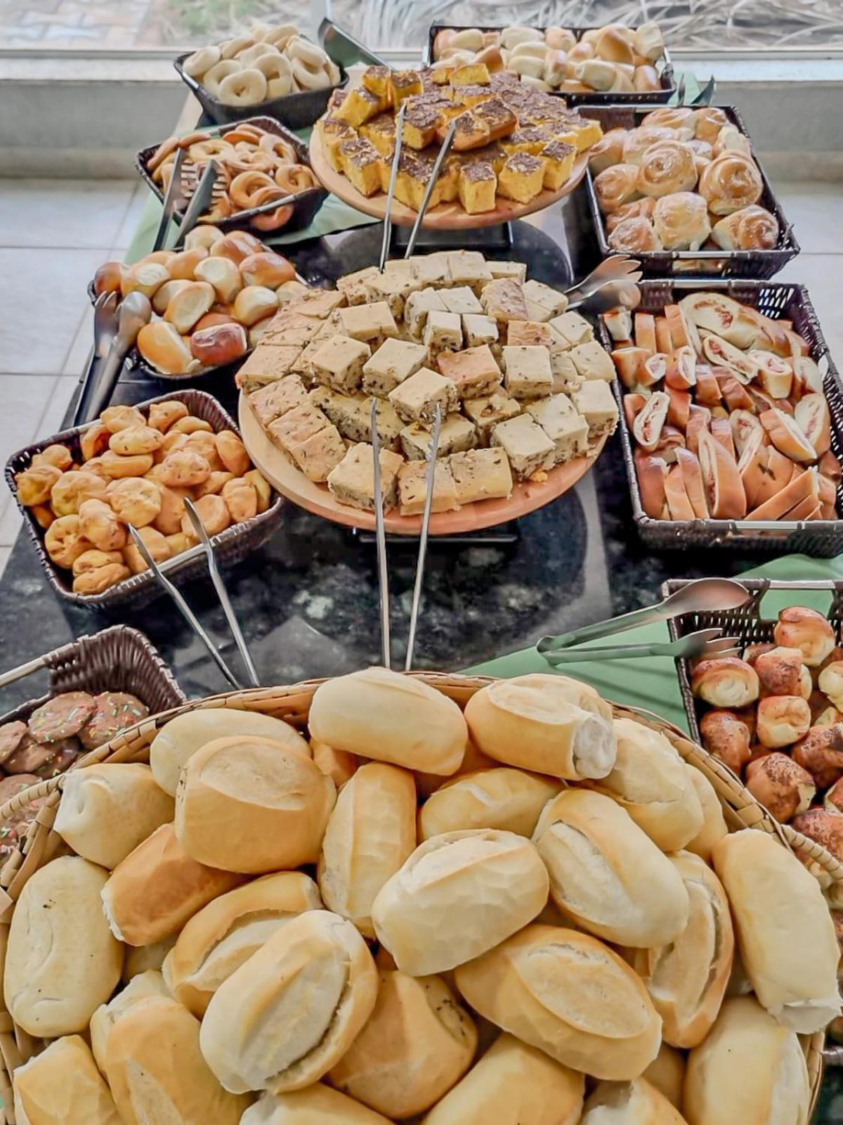 Café da manhã, pães dormidos e bolo ruim.