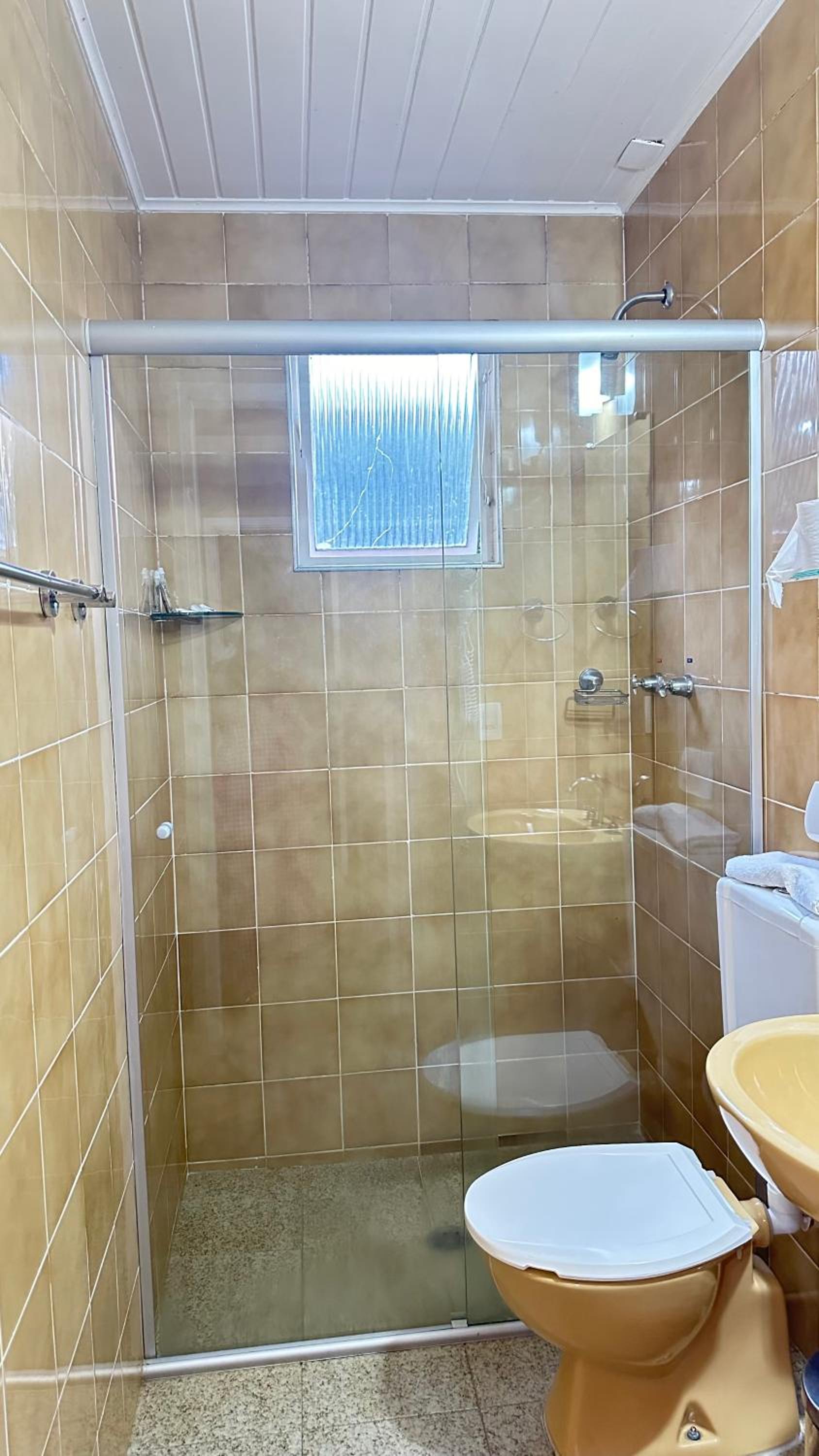 Quarto muito pequeno, abafado, banheiro com uma janela pequena e enferrujada, não abria, nem sabonete na pia para lavar as maõs, somente líquido fixo no Box. Café médio.