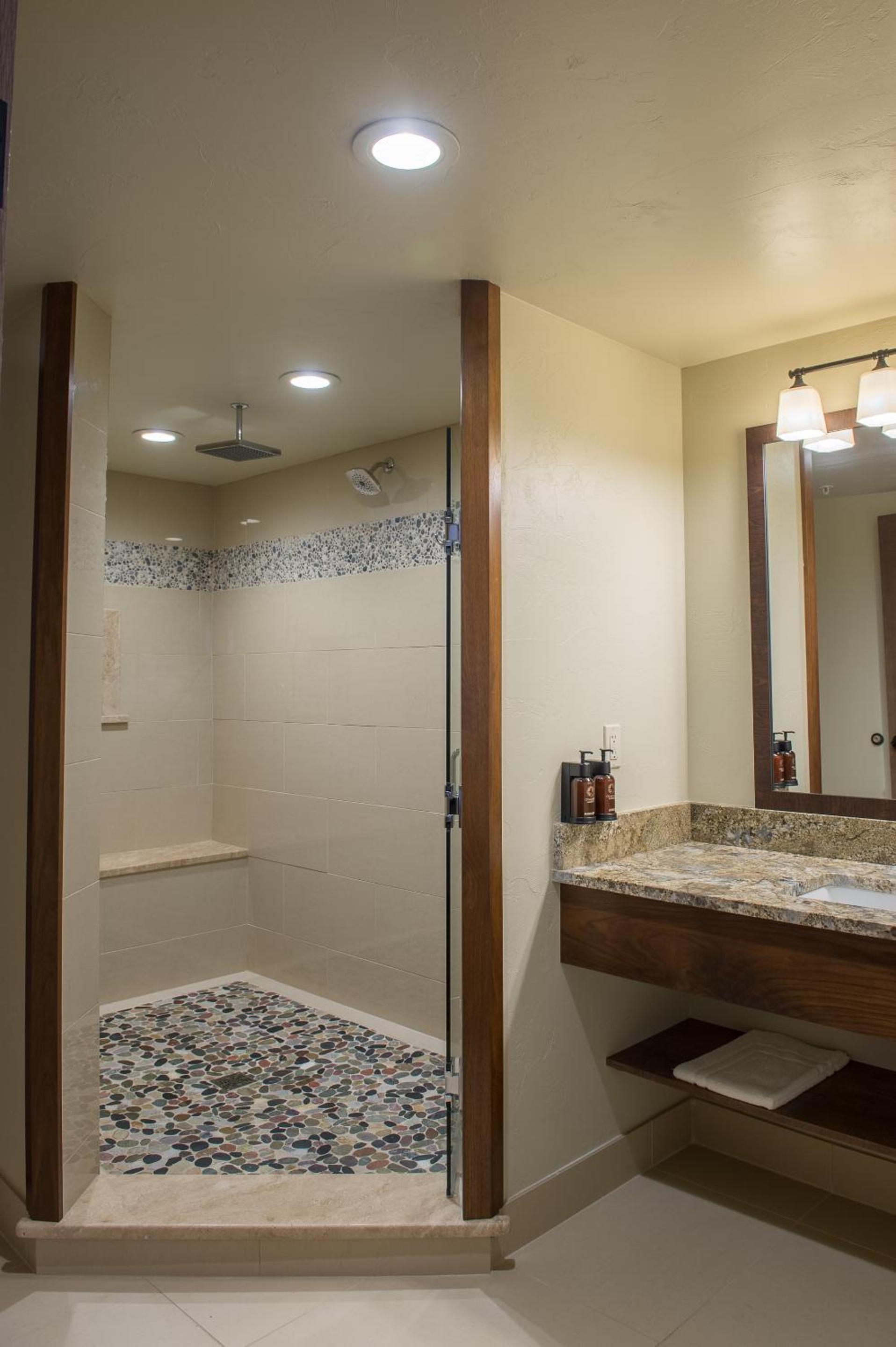 This lodge was like a dream come true. It was gorgeous and welcoming, and so comfortable yet very classy. Every detail was thought of and provided without having to ask for anything. The room on the third floor had a gorgeous view, and was so peaceful and quiet. Everything that was needed was supplied and more… There were Five trash cans … You never had to go looking for a trashcan to throw something away. The room was provided with the largest towels I have ever seen in a hotel. There were literally was nothing that we needed that was not provided. They even provided ceramic coffee, mugs, and glasses were glass and not plastic. They provided an adequate amount of towels for our three day stay and we never had to ask for additional. There was a large mirror/Magnetic mirror attached to the wall conveniently. The bedding was delightful, and the bed was very comfortable. It seemed that everything that you could possibly need was already provided.
