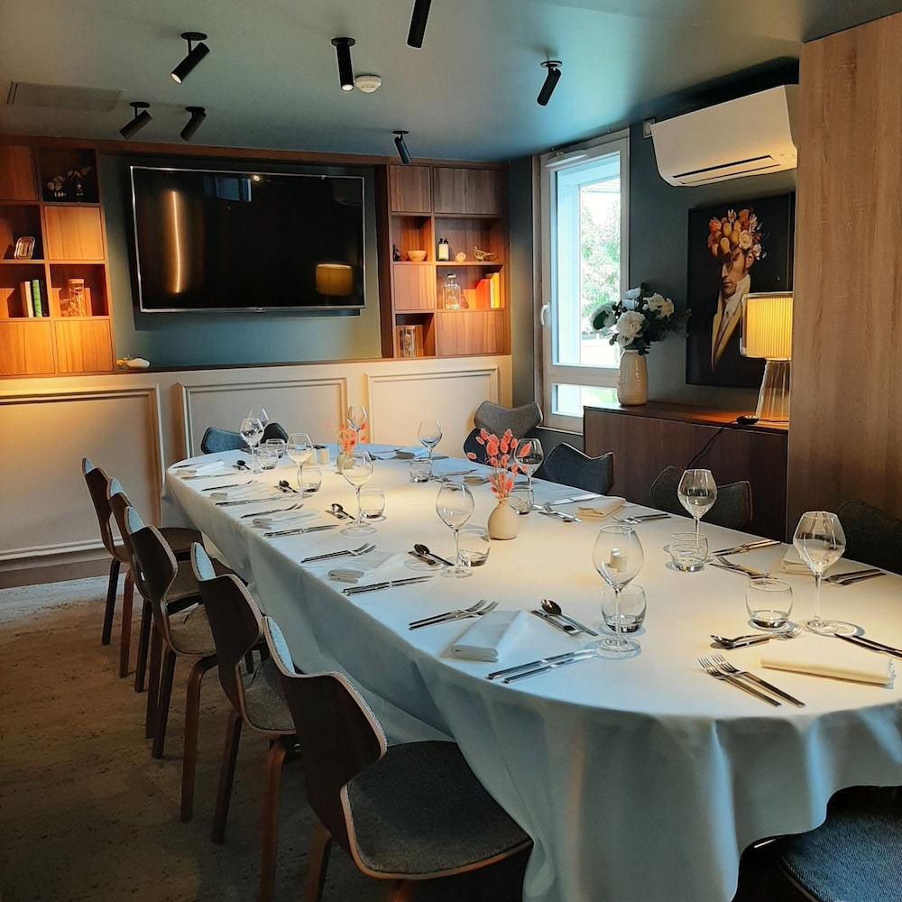 Pleasant overnight stay. Spacious rooms, friendly welcome. We arrived late and didn’t eat at the restaurant but were still able to go for a swim because the (warm) pool is open until 10 pm! Breakfast a bit underwhelming given the price and how fancy the restaurant is. Charging stations. Location a bit odd past the airport but quiet.