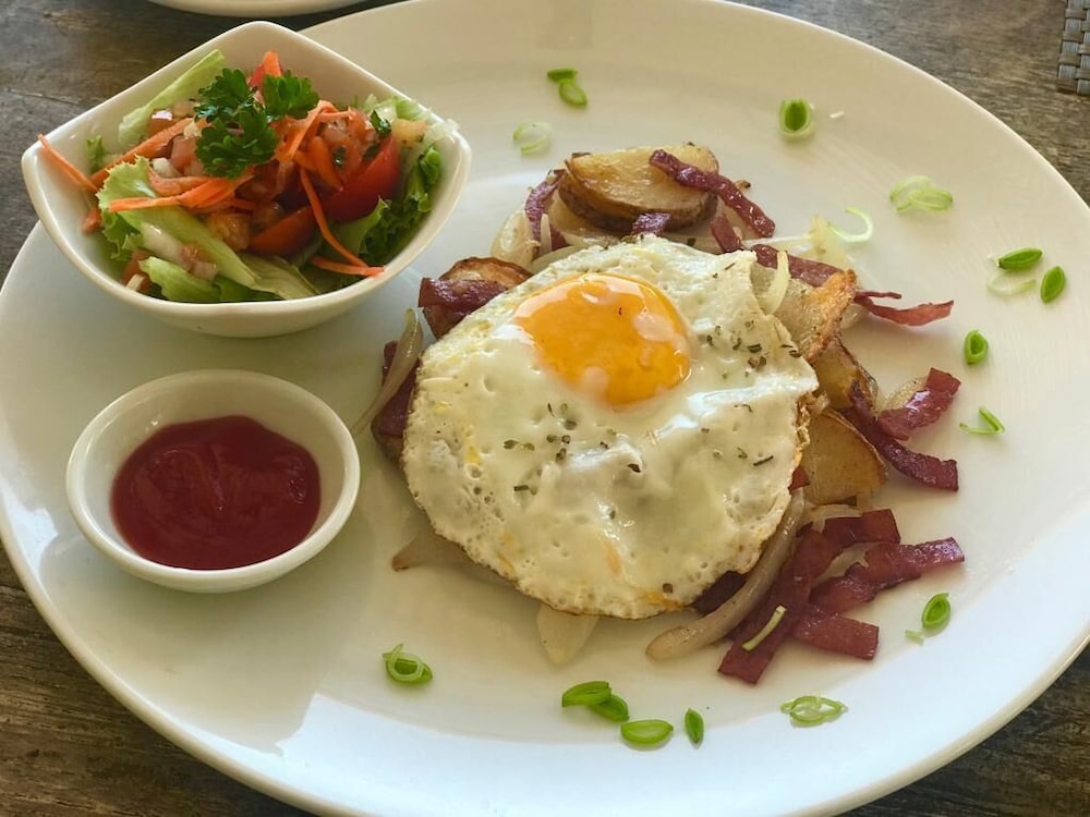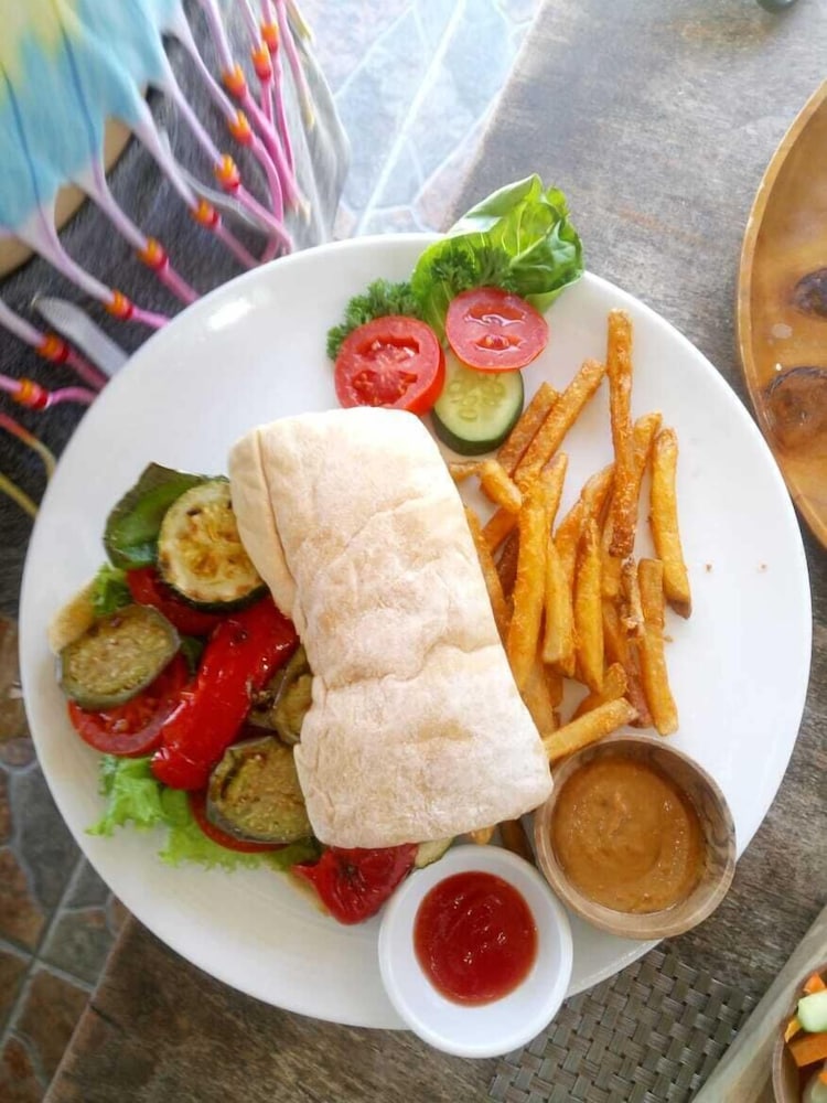 Breakfast is delicious. There are many options and includes a free coffee beverage (options like cappuccino, tea, etc). My favorite breakfasts were the pineapple pancake and the tulamben sunrise breakfast (plate of fruit, two eggs, sausage, bacon, potatoes, mushrooms, tomatoes, bread basket with butter and jams). There were also options like cereal for those pickier eaters. The restaurant also had delicious options for lunch and dinner. We ate at many restaurants in tulamben while we were there, but this resort restaurant was our favorite.