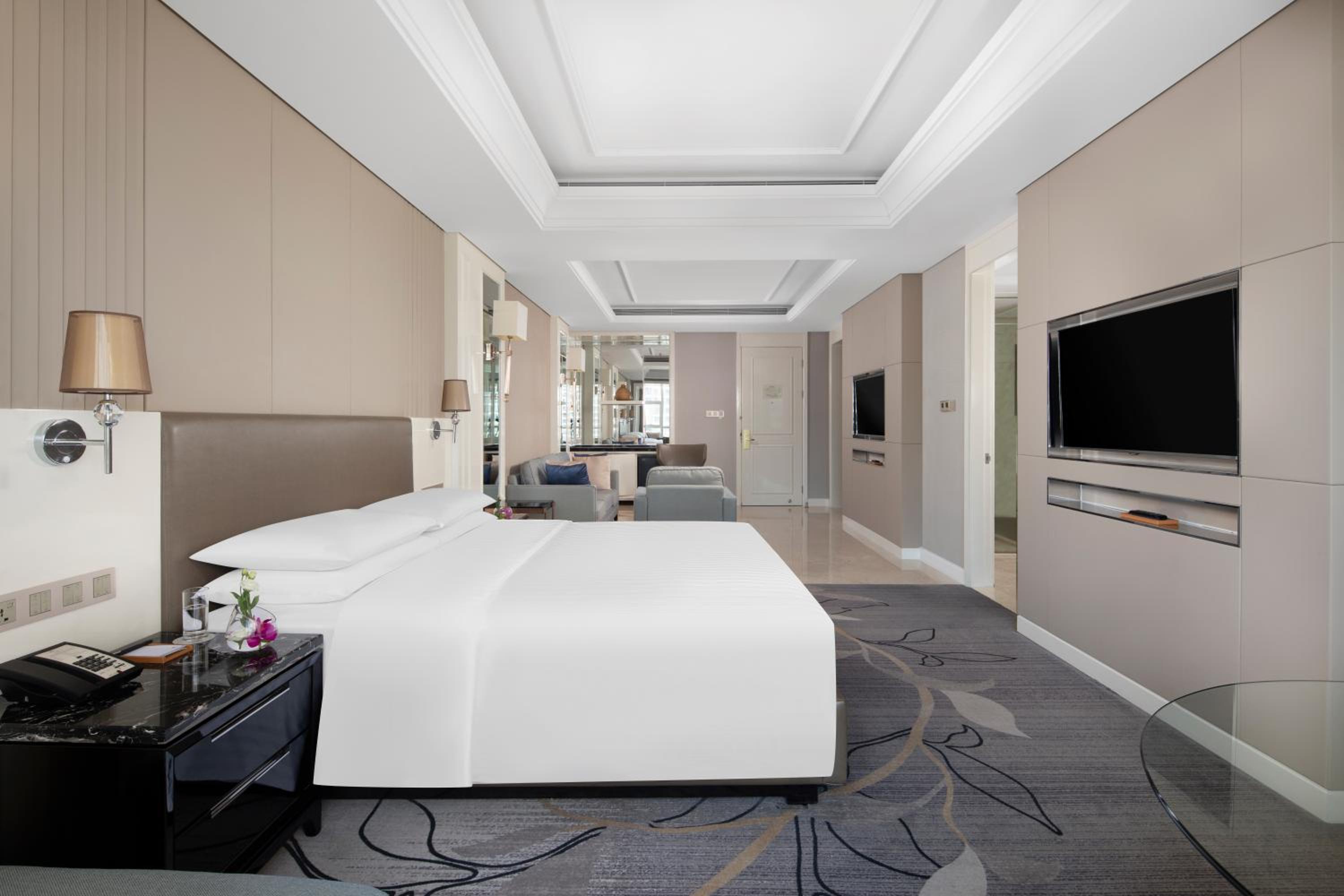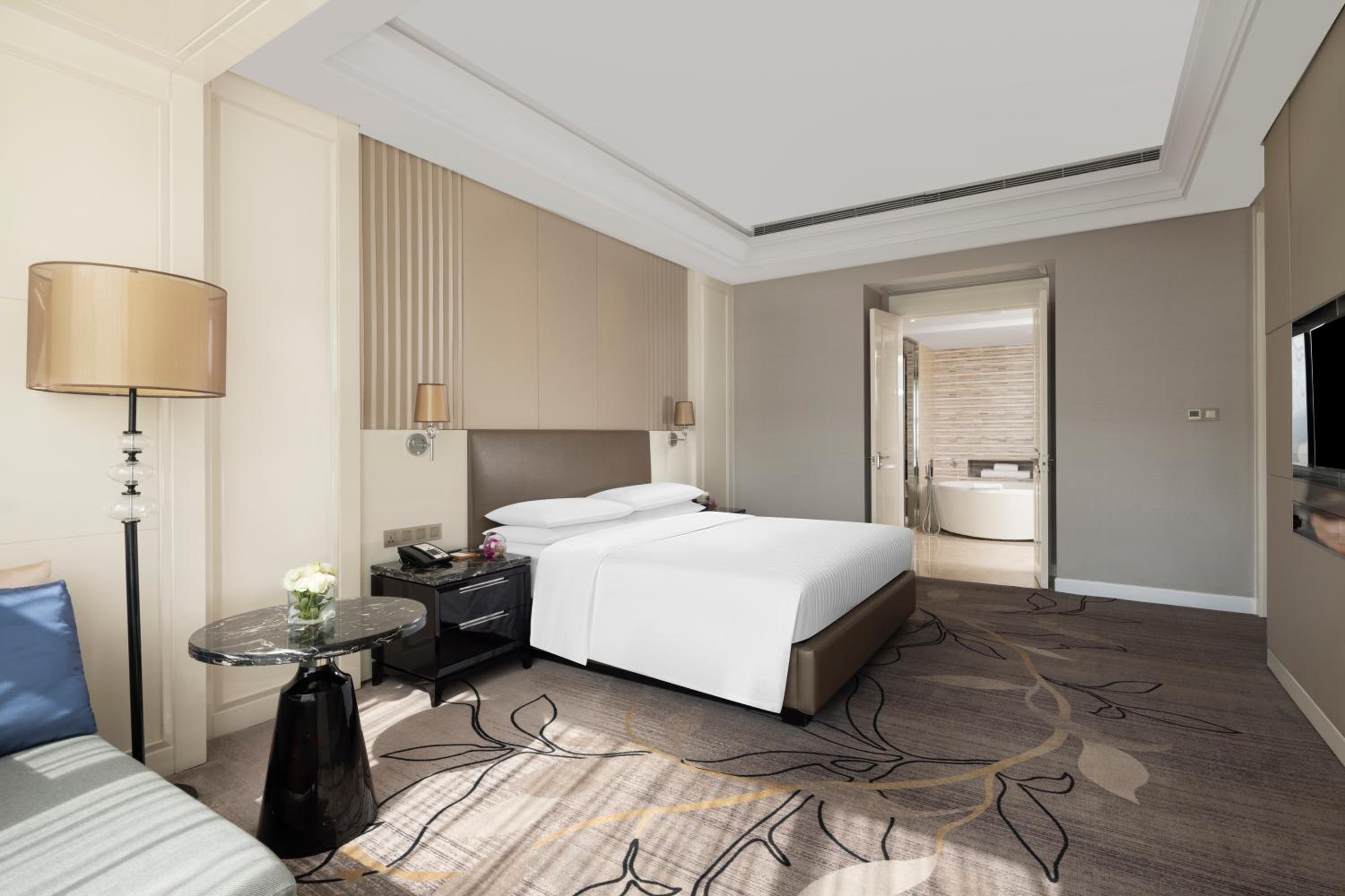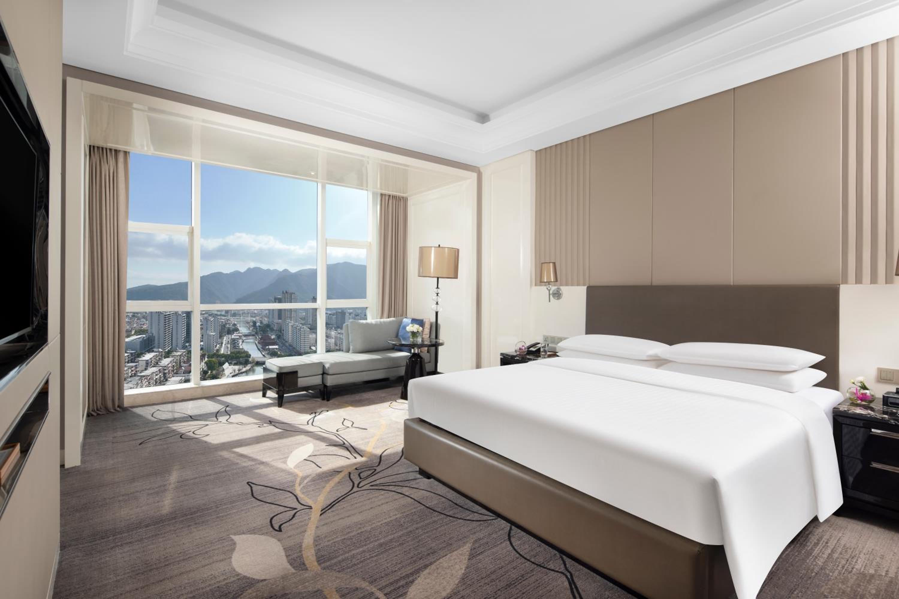 Zhejiang Taizhou Marriott Hotel offers a luxurious stay in Huangyan with beautifully decorated rooms featuring flat-screen TVs, floor-to-ceiling windows, and elegant amenities like bathrobes and free toiletries.