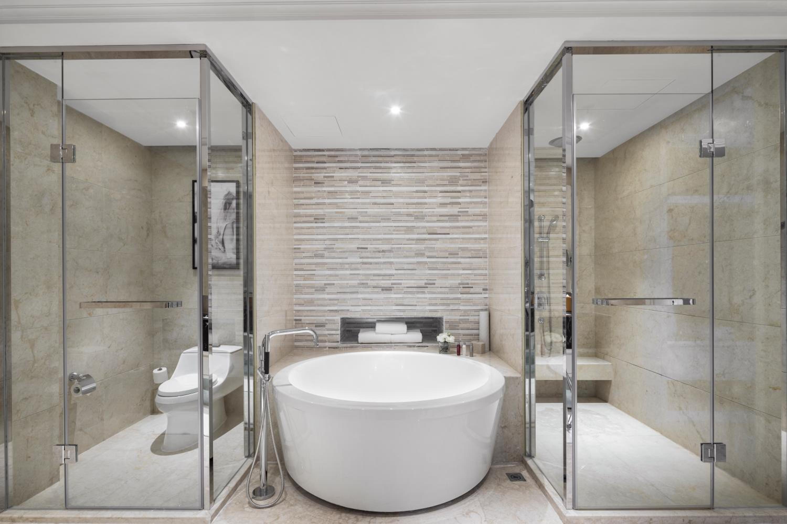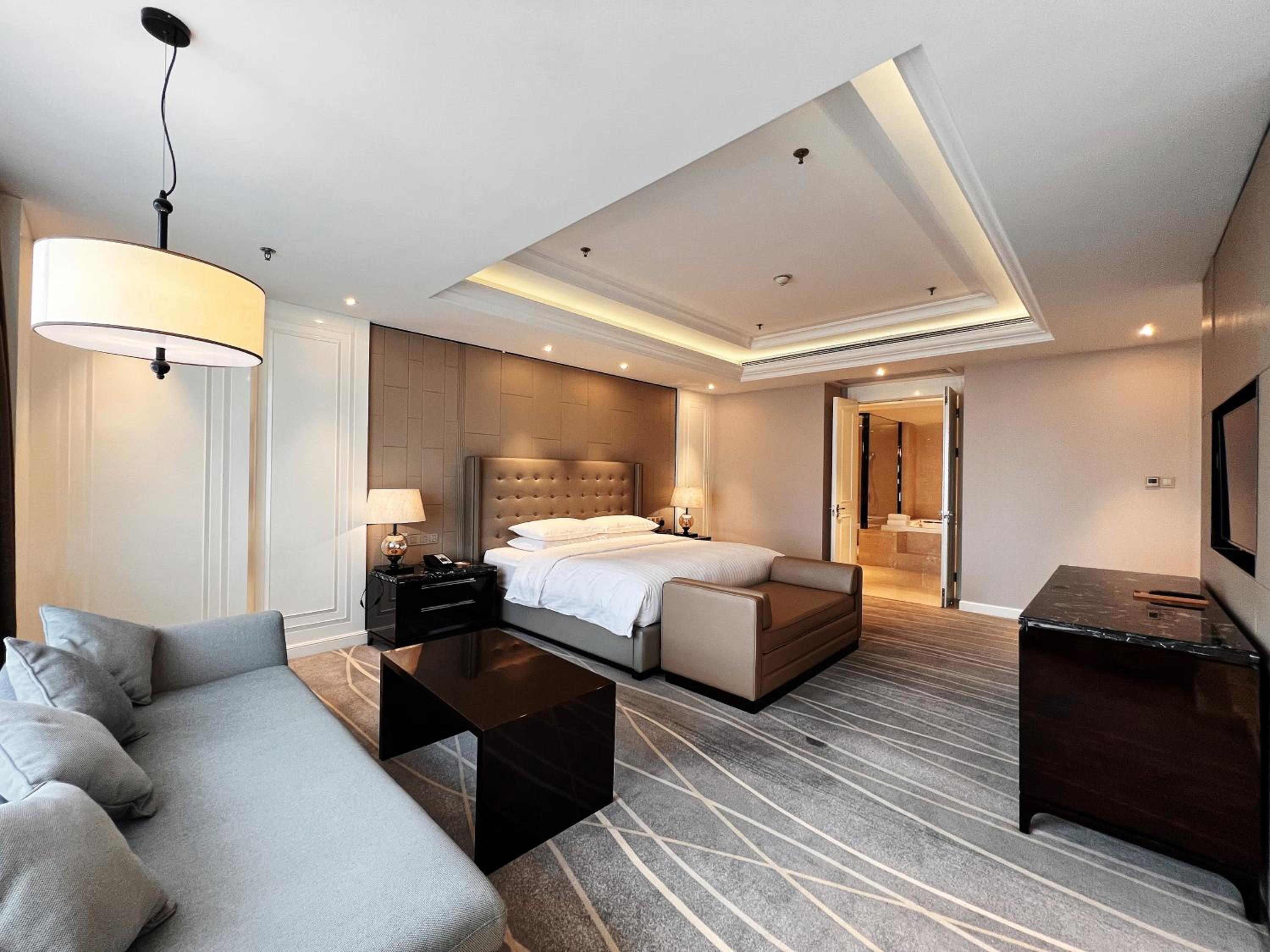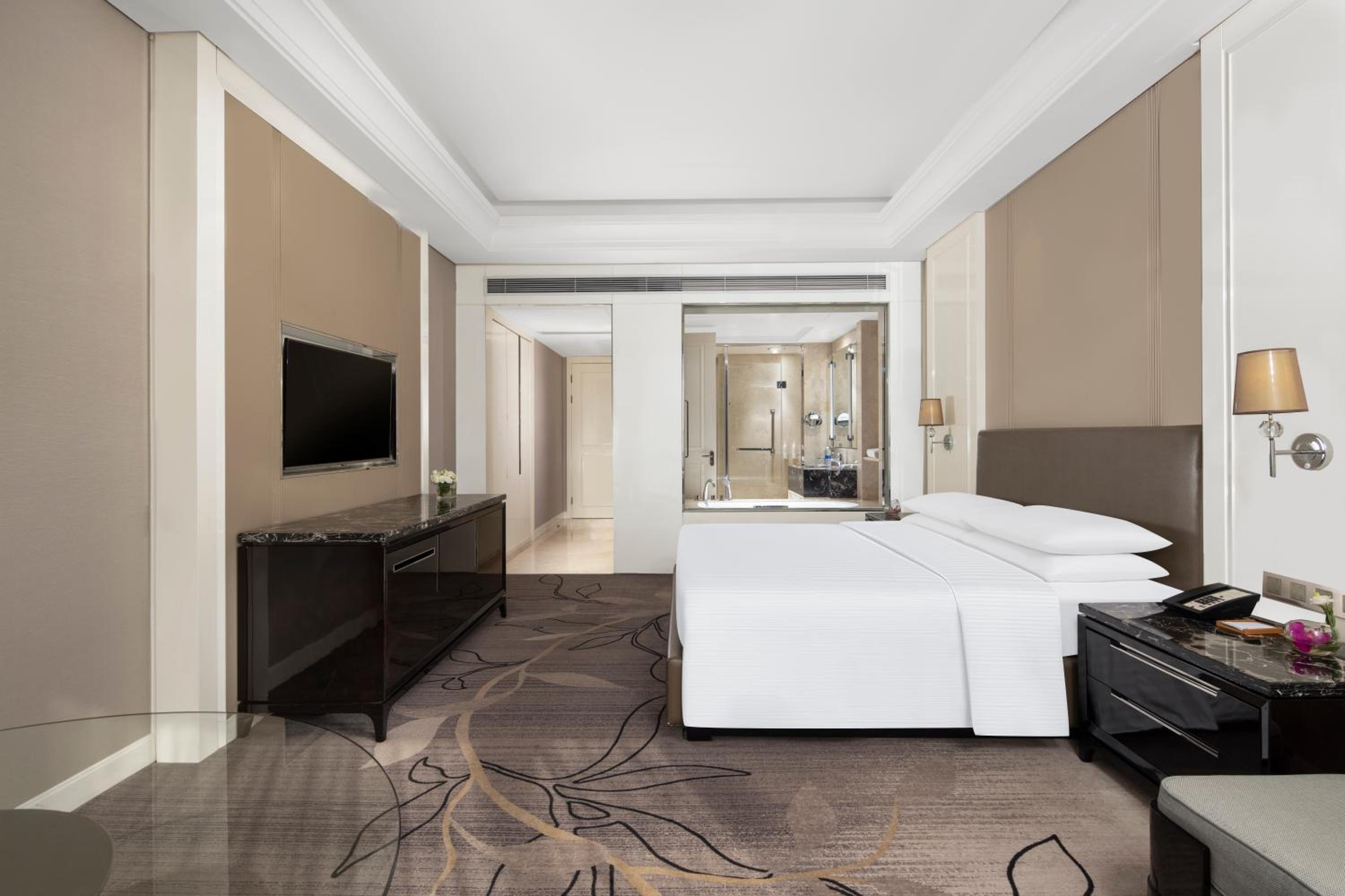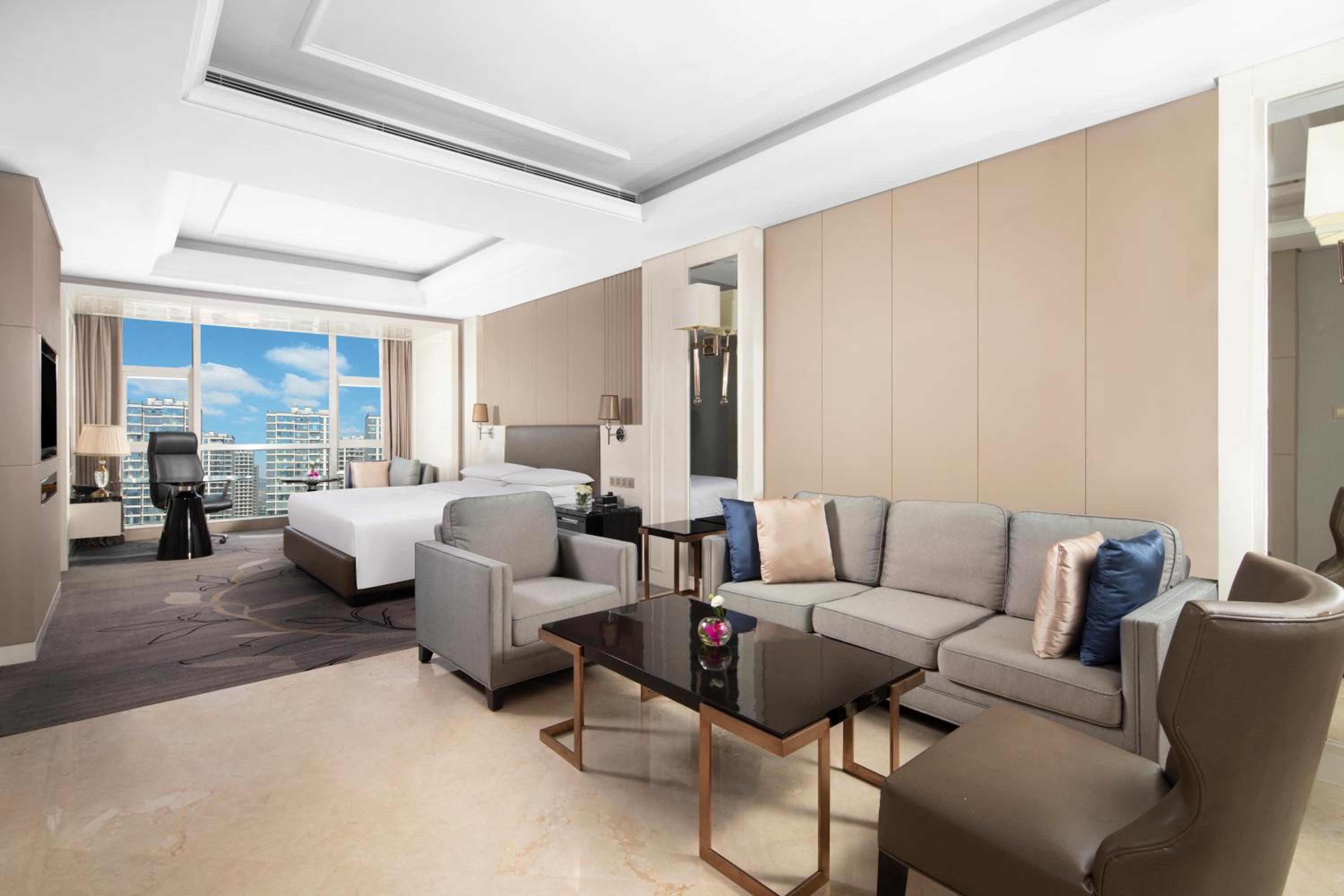Zhejiang Taizhou Marriott Hotel offers a luxurious stay in Huangyan with beautifully decorated rooms featuring flat-screen TVs, floor-to-ceiling windows, and elegant amenities like bathrobes and free toiletries.