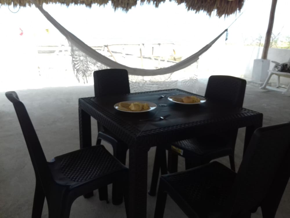 La habitación y el lugar en general son muy agradables, es justo en manzanillo super cerca del lugar donde debiamos, de hecho nos fuimos caminando, es suer cerca a la playa y en la playa. Las personas que atienden son muy amables y cabe destacar que la comida es deliciosa. Desayunamos y almorazamos en el hotel, totalmente recomendado si se quieren relajar en manzanillo. Las sabanas y las almohadas muy comodas, el cuarto tiene baño privado lo que es genial, tiene televisor, closet y aire acondicionado. Lo unico malo es que hay arena por todos los alrededores y cuando uno ingresa a la habitación el piso rapido se ensucia pero pudismos barrer con una escoba que tenian disponible para usar.