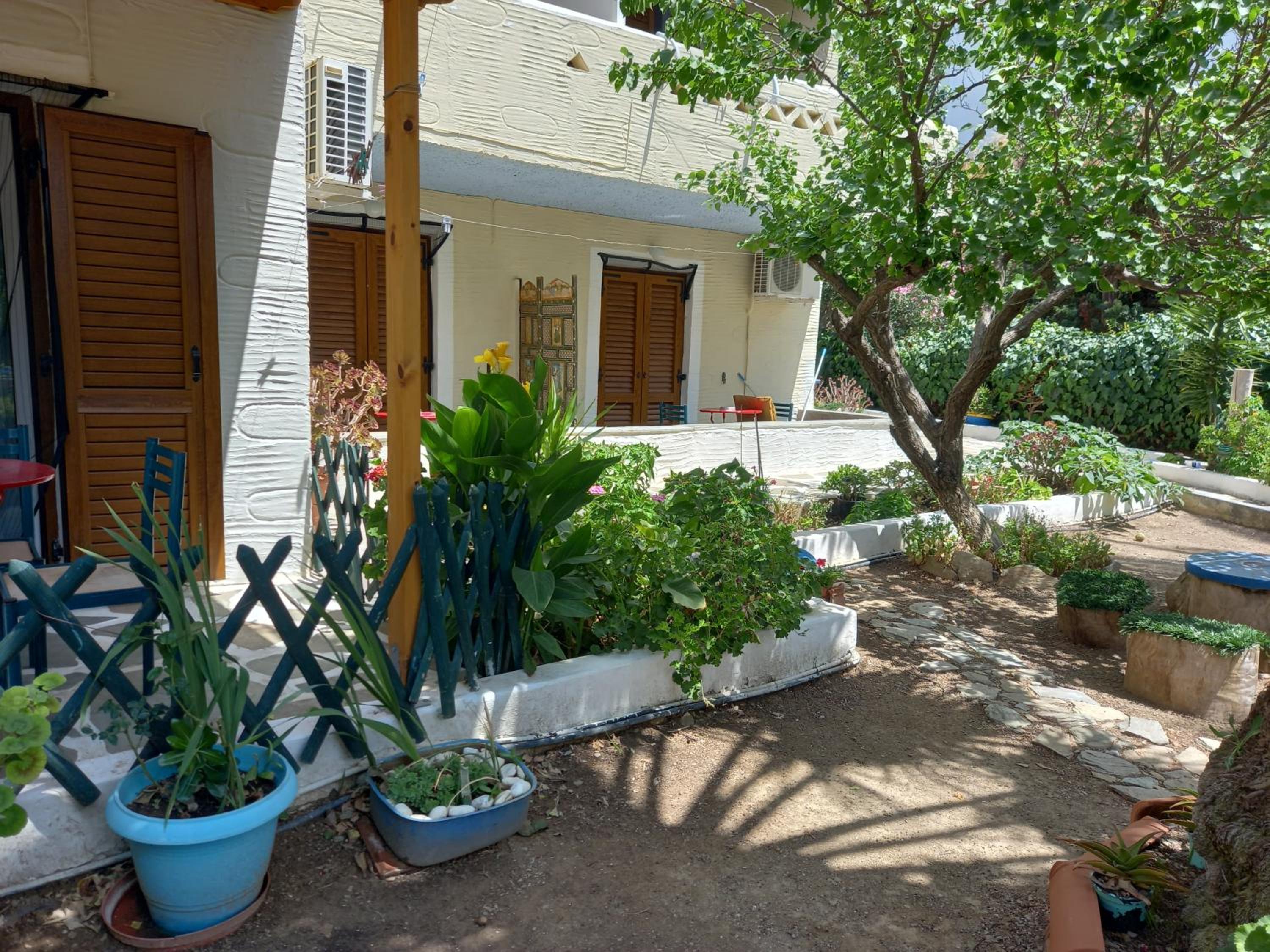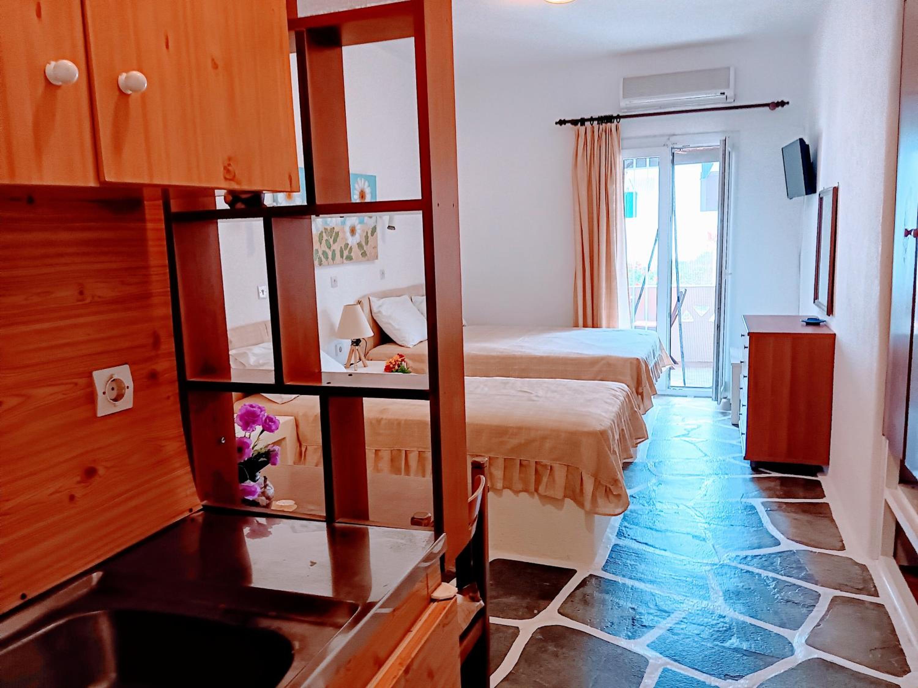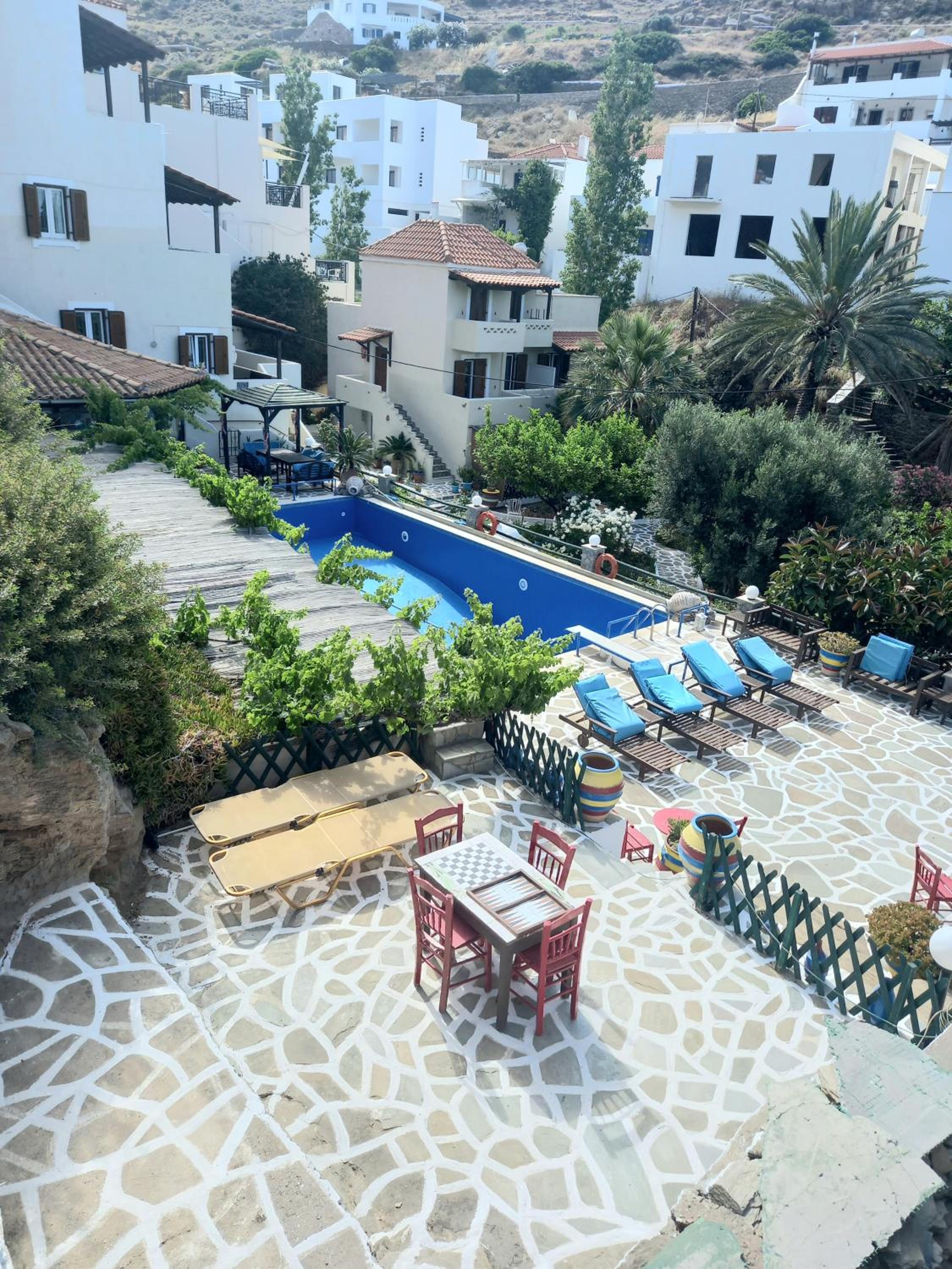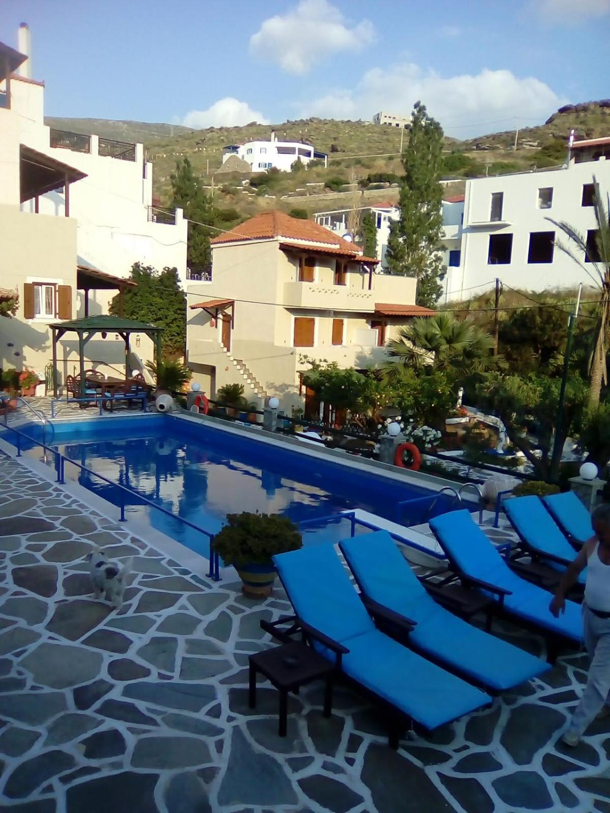 Villa Rena is a home away from home. This beautiful hotel in blue and white feel like a tiny greek village, with garden, flowers and a big lovely pool. Our studio had two nice rooms and three (1) balconies, one with wonderful seaview and one with pool view. Best of all is the hotel owner Rena. This lovely, generous, happy and warm lady does everything to make you feel comfortable. I can give this hotel my very best recommendations. Our seven year old grandchild had the best time of her life :-)
