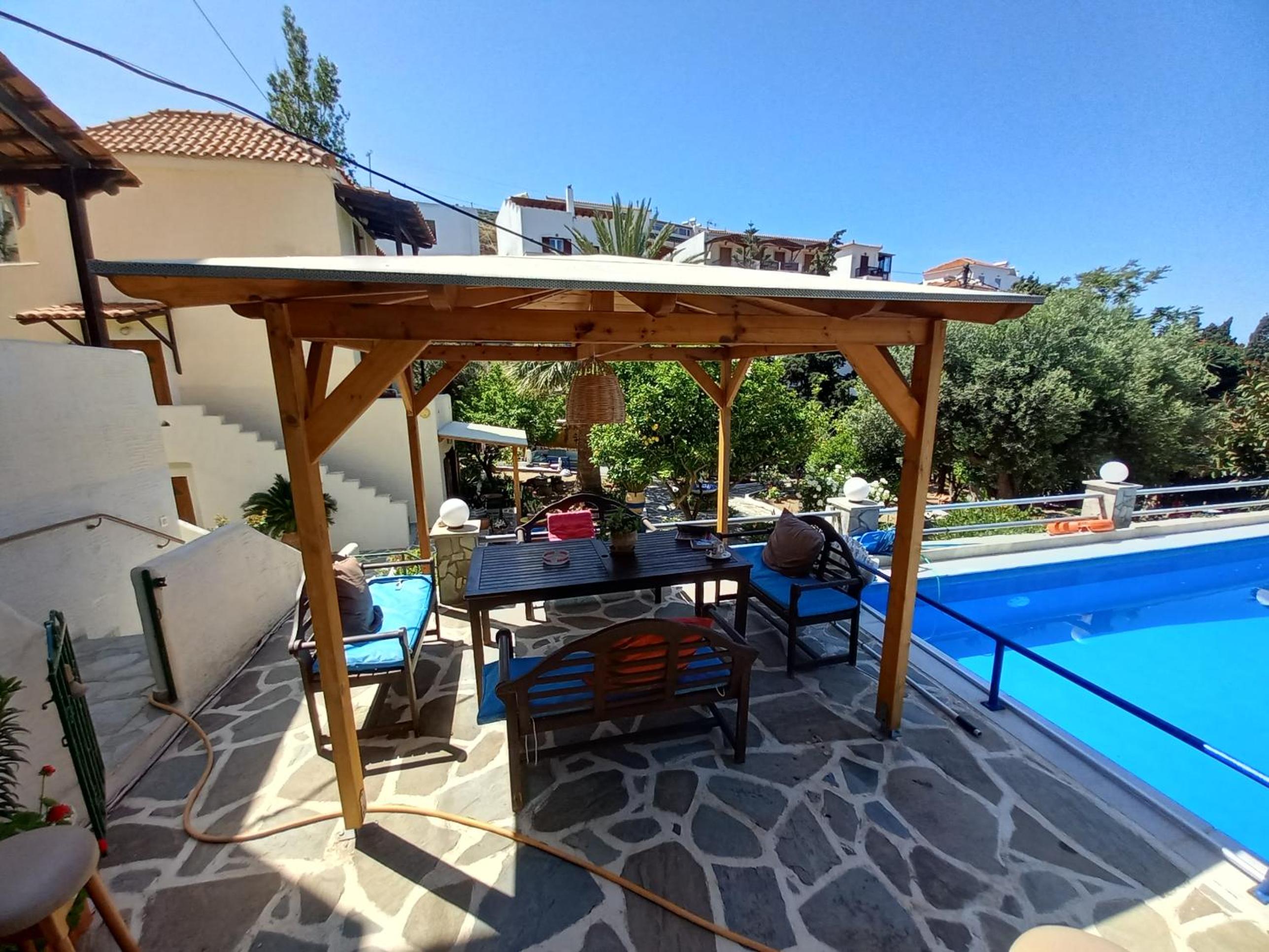 The property is right in the heart of Batsi but up a beautiful little path so it feels so private and secluded! It has a beautiful sparkling pool and nice ocean views!