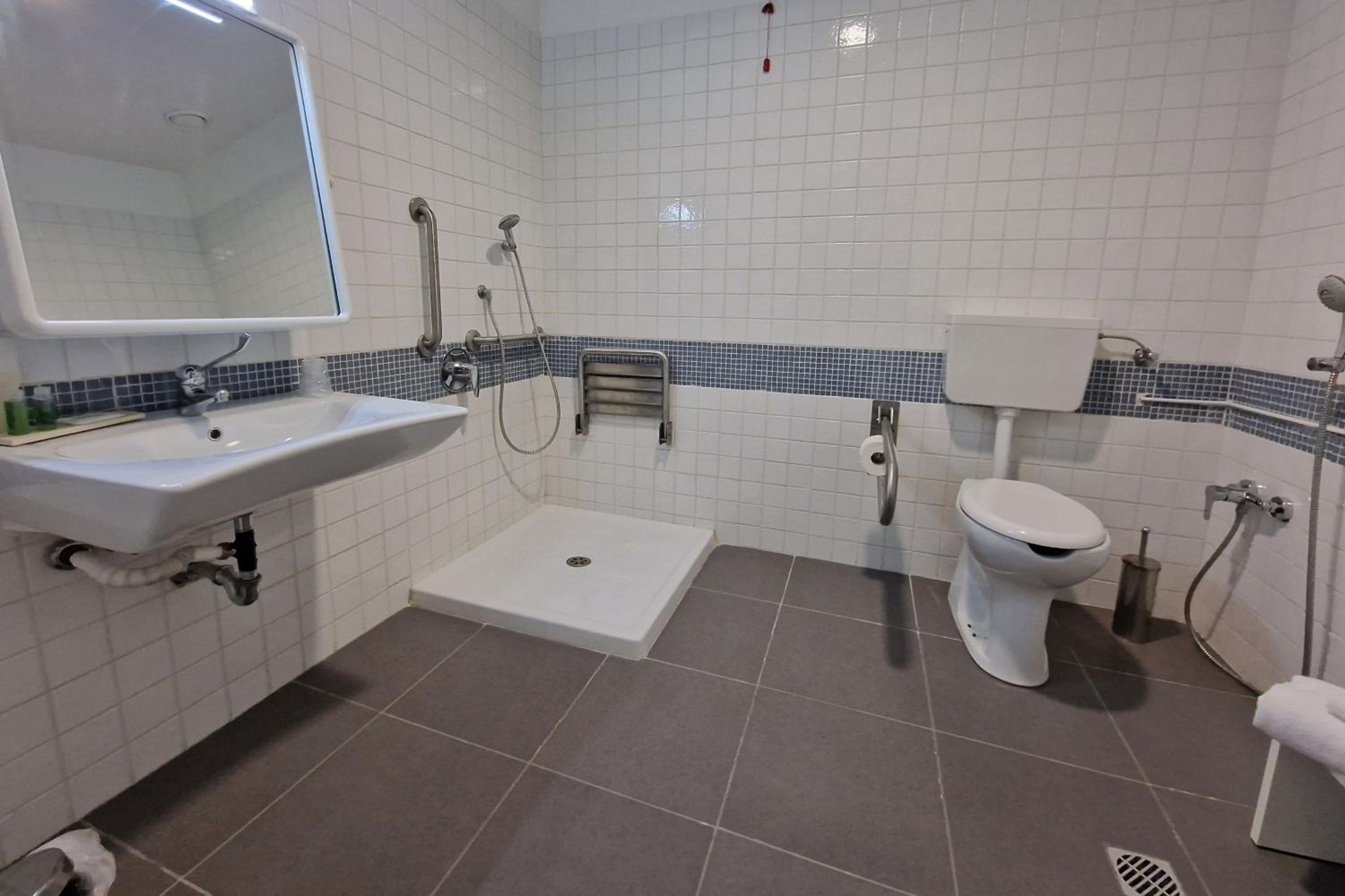 camera molto spaziosa, bagno con doccia e vasca.