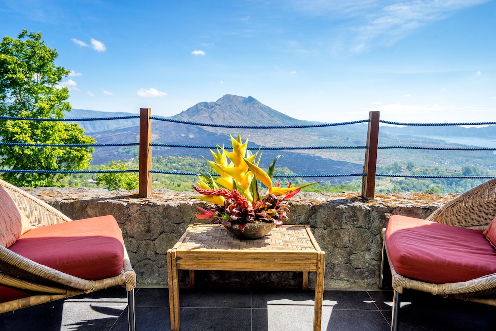 Et utroligt flot beliggende hotel med udsigt direkte over på Mount Batur og Lake Batur liggende nedenfor til højre.
