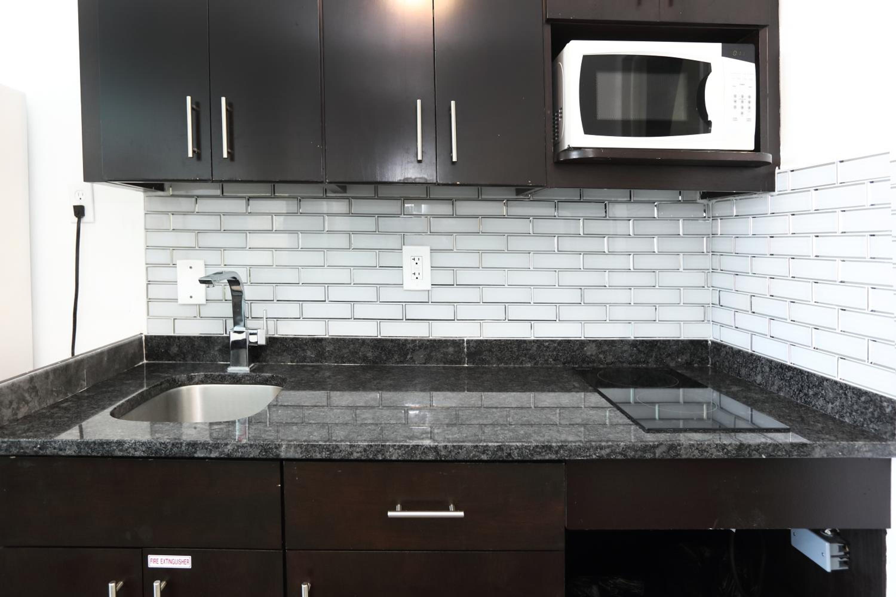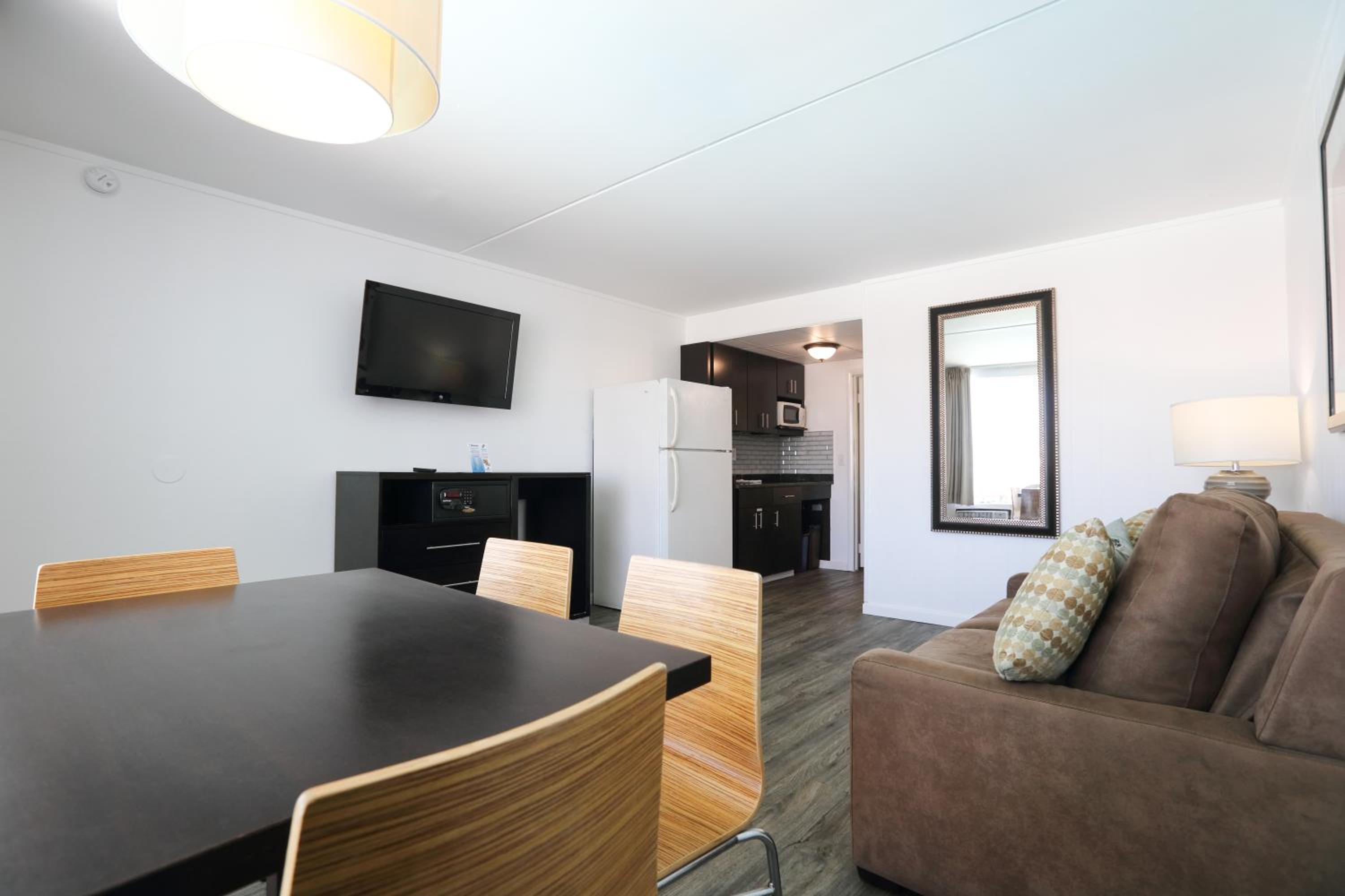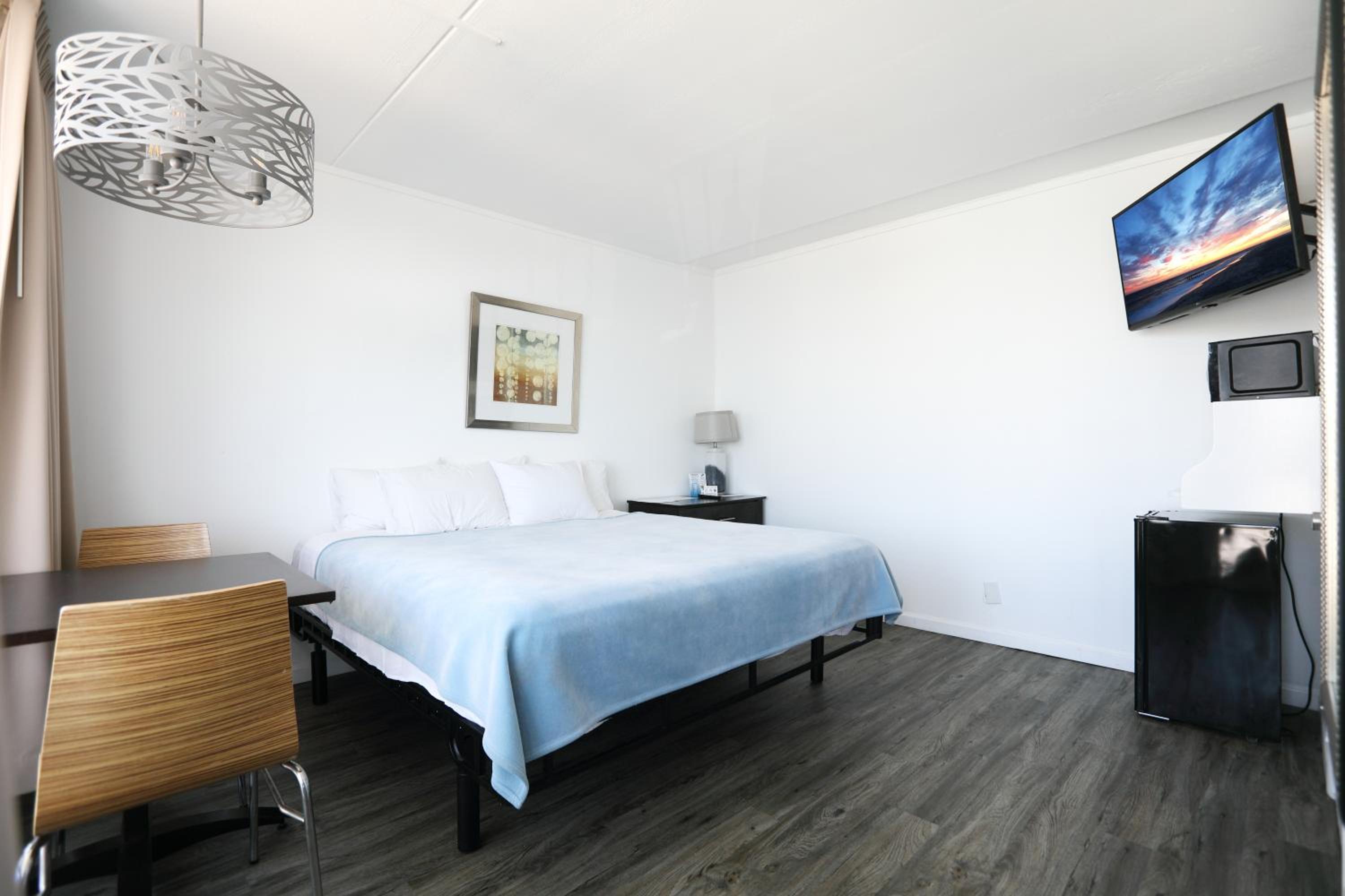 Bathroom was very small. Very few outlets to use for charging phones - phone had to sit on the floor to use the outlet in the room. No freezer in the mini refrigerator - needed it to keep our ice packs frozen for our cooler. Room had a refrigerator, microwave and coffee maker, but no coffee supplies were put in the room. Heating system was a little iffy - had a maximum temp you could set it to and was a little noisy whenever it kicked on. I also didn't like being put in a room overlooking the main street...would have preferred being more in the back towards the ocean.