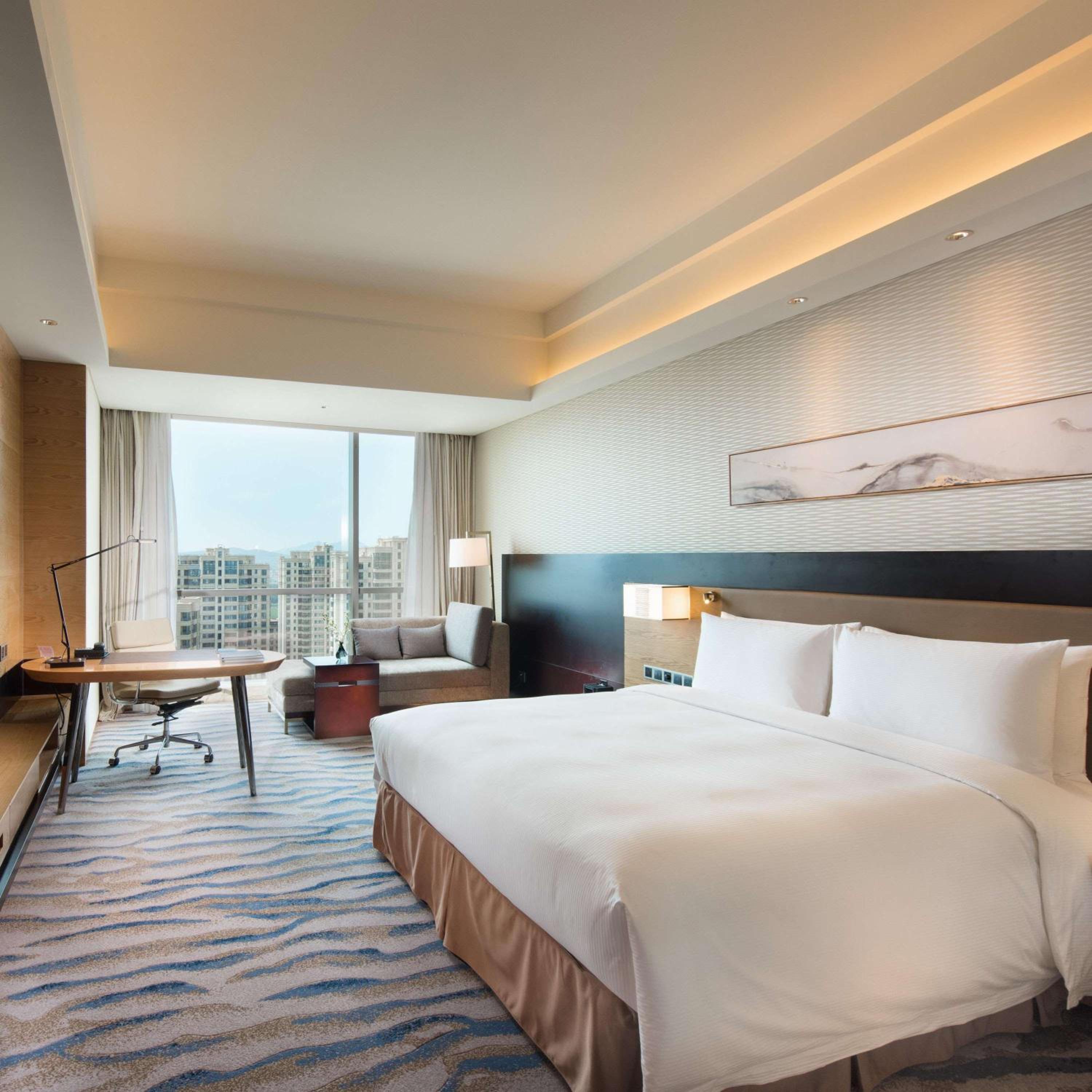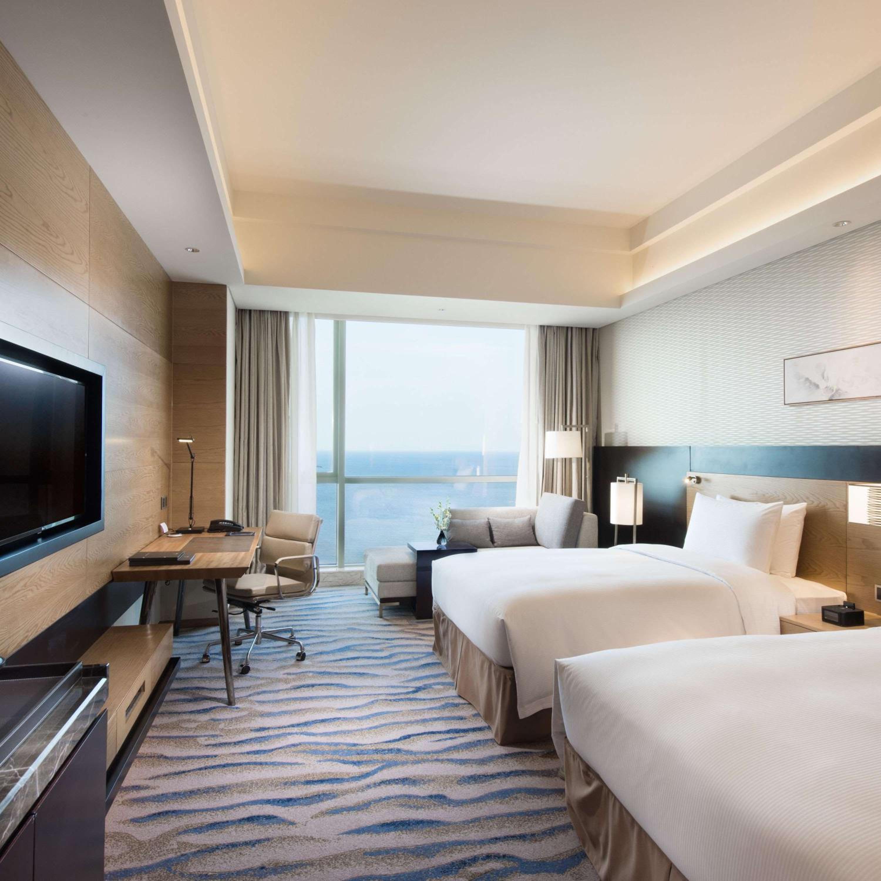 The Hilton Yantai Golden Coast offers spacious and stylish guest rooms with modern amenities and stunning sea or city views, ensuring a comfortable and relaxing stay for all guests.