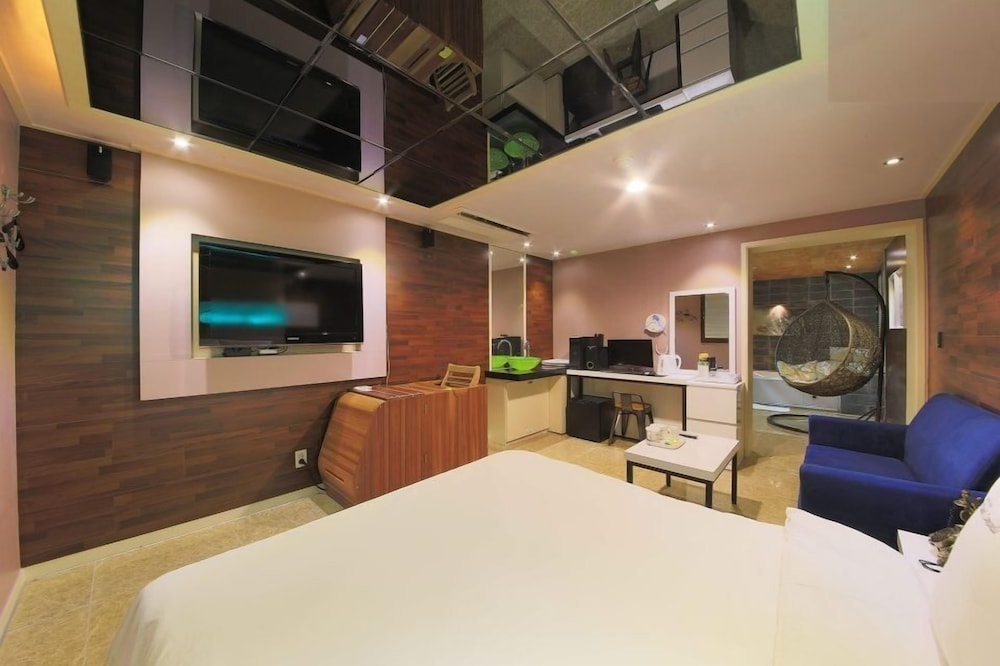At first when we arrived, we did think the picture frame on top of our bed was a bit weird, I don't really know if this is considered a love hotel haha but it didn't really matter to us you dont really pay much attention to it. All the staff at the front desk were so nice and very helpful! They always greeted us as we left the hotel as well as when we got back. They even let us borrow umbrellas when it was raining, so nice! The room was spacious enough for my sister and I, we're both small so the basic room was just right for us. They had someone clean the room everyday which was very nice when you get back after having a long day. The shower was nice as well, very clean. The area where you sleep is also really quiet you don't hear noise from cars or anything. Since this hotel is in between an alley there are people smoking at day and night so I wouldn't recommend for children to stay. This hotel is super convenient when getting on the subway in less than 5 minutes. It does take some time to get to main areas but honestly it wasn't that bad time goes quickly and the subway is very efficient. The limousine bus is also a perk when it comes to this hotel. You get dropped off close to exit 3 of the subway and then going back to incheon airport is exit 2 of the subway so it was super convenient. There was plenty of convenience stores, cafes, pharmacies, food places around the area which was really good. I would totally recommend this place and would love to stay here again!