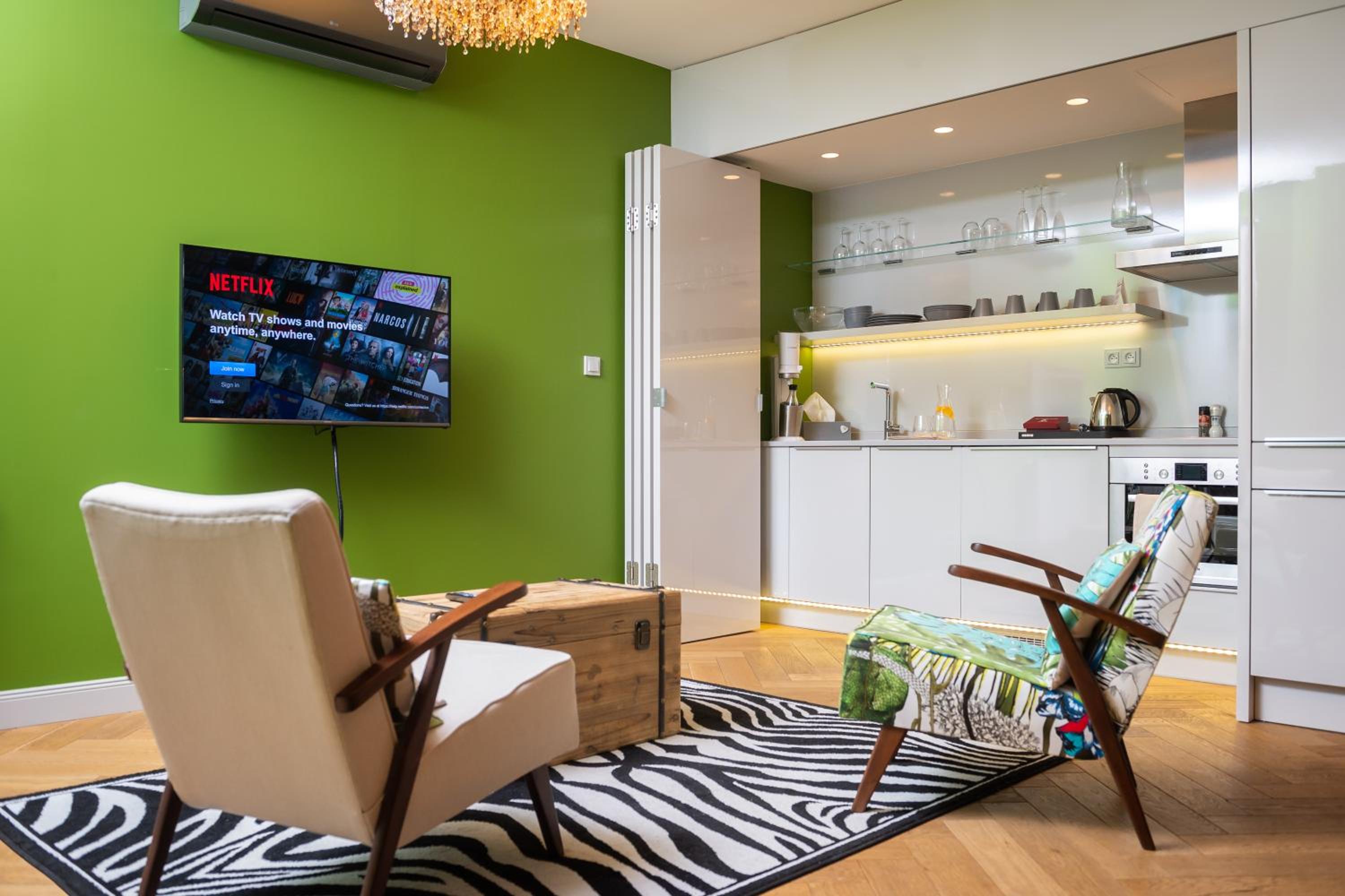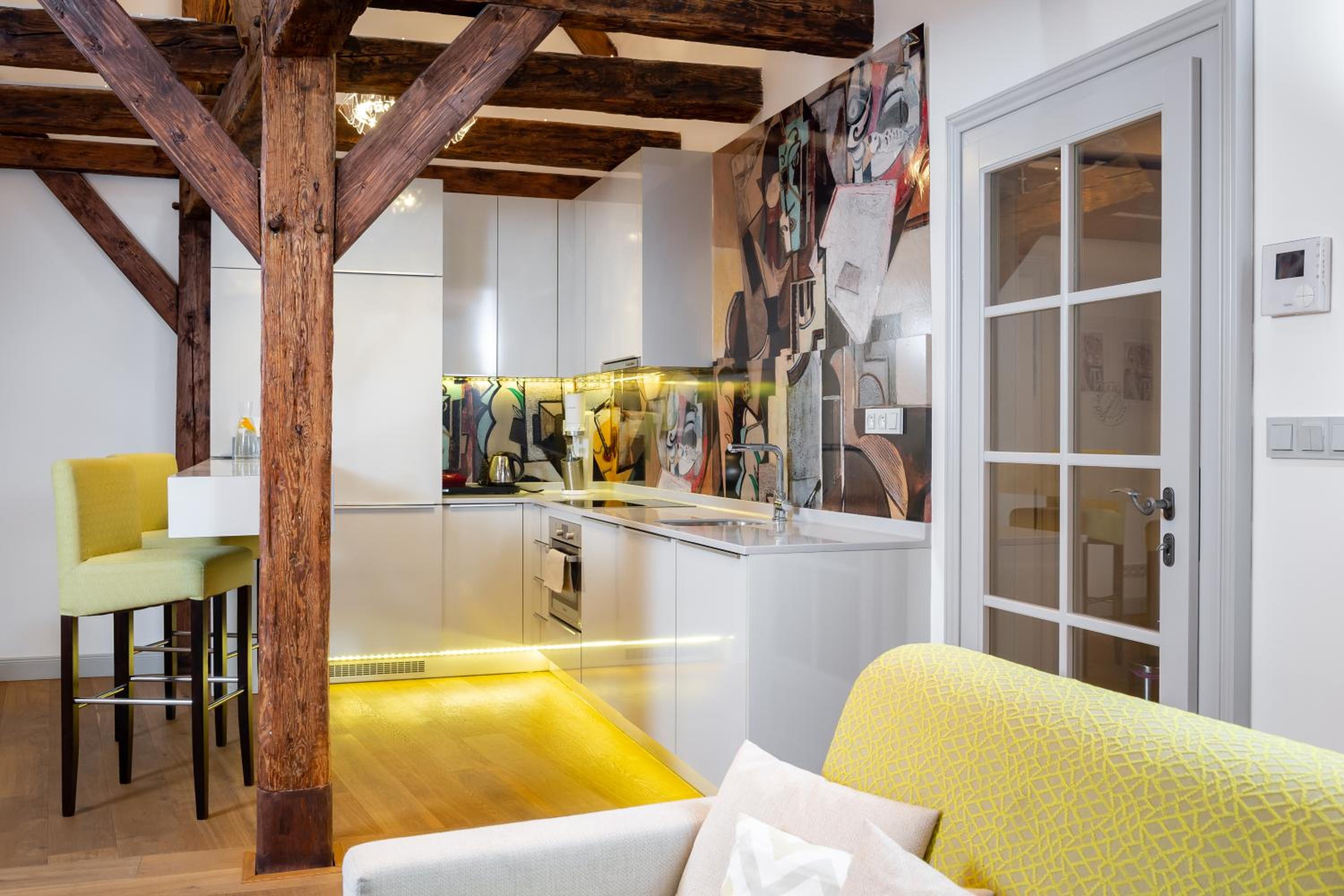 De locatie is op loopafstand van de Karlsbrug en het centrum. In de buurt voldoende gelegenheid voor heerlijk ontbijt en lunch. De kamer ws erg schoon en supergeschikt voor een gezin. Wij hadden in de woonkamer een klein 2 persoonsbed en een slaapbank, dus onze kids hebben beide in een eigen royaal bed geslapen. Geen overlast van geluid op straat.