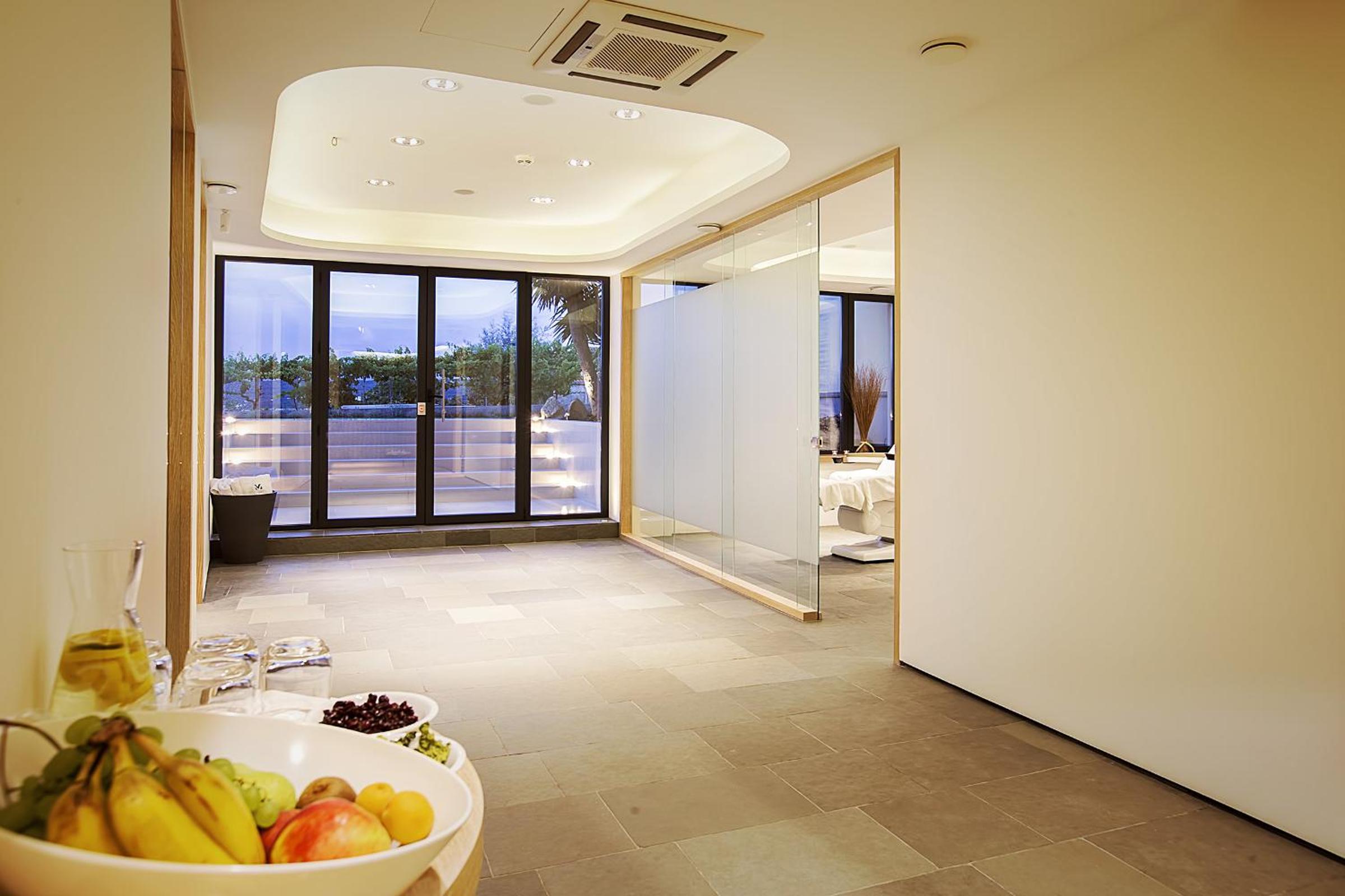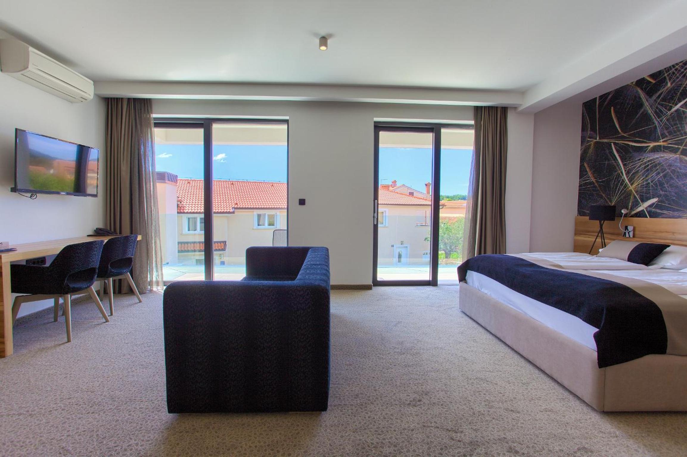 The room sizes are generous; those facing the sea are slightly larger, but the ones to the side are still way above average. Personally, I liked the side view better – apart from looking over a nice old olive grove, they also provide more views onto the Istrian mainland coast (instead of Malinska and the marina, which the full sea view rooms look onto).