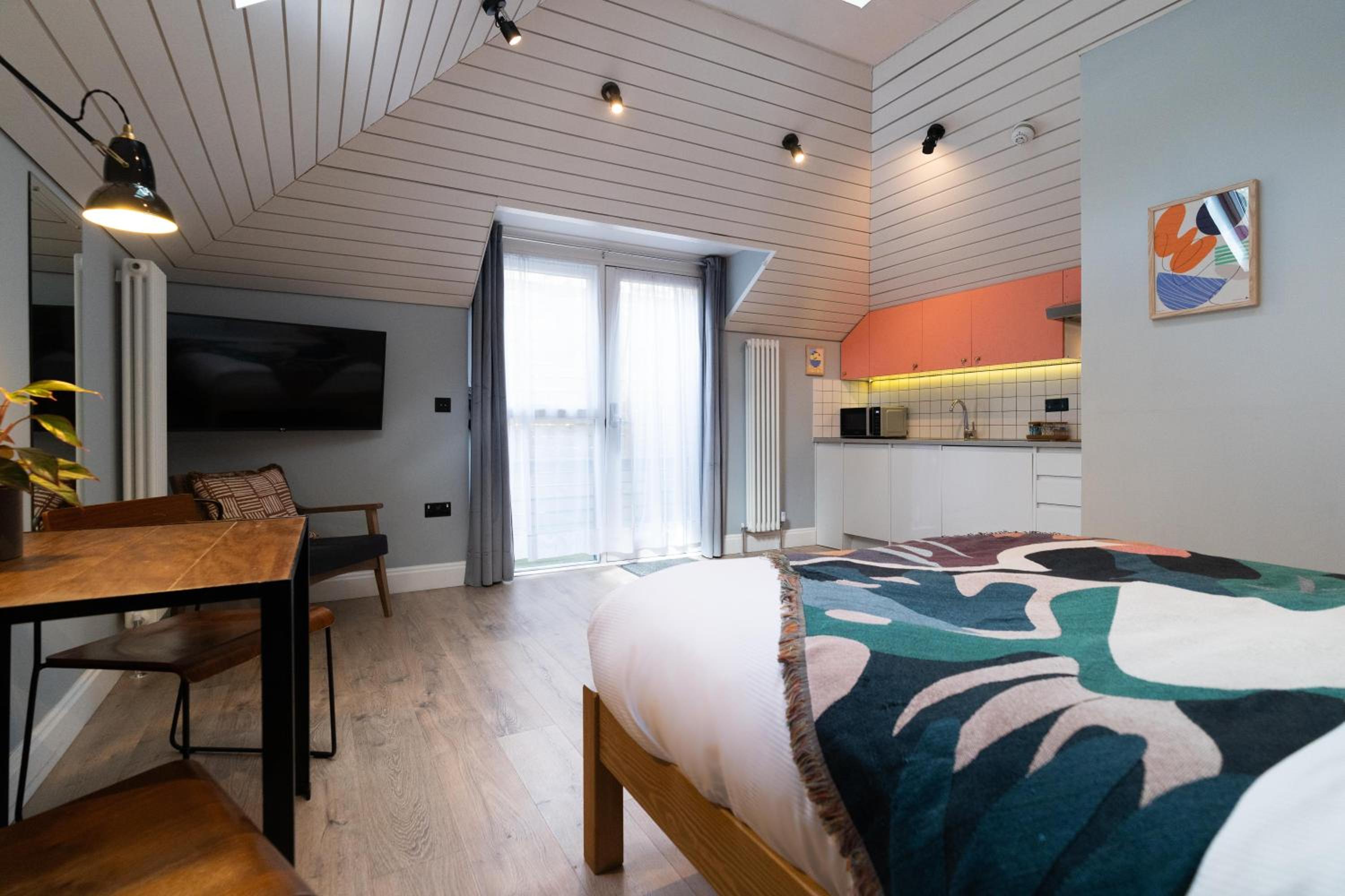 Very clean pleasant room, modern style with smart kitchen area and modern clean shower room.