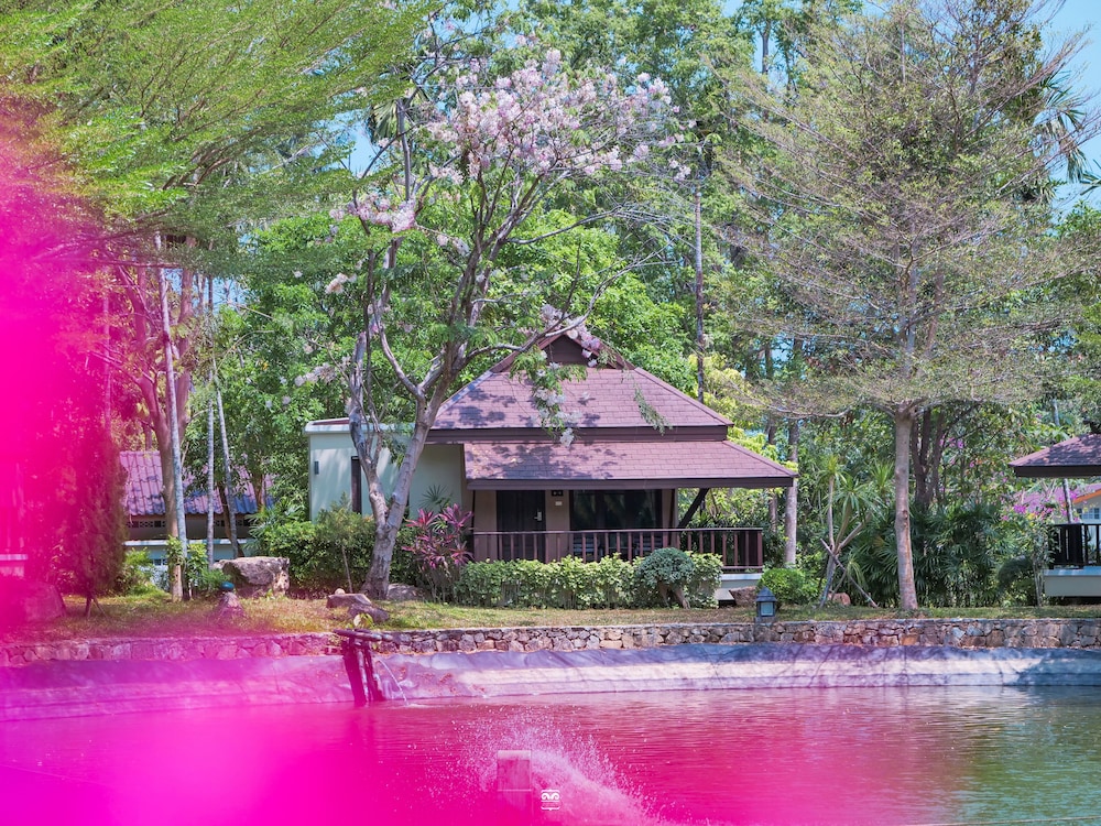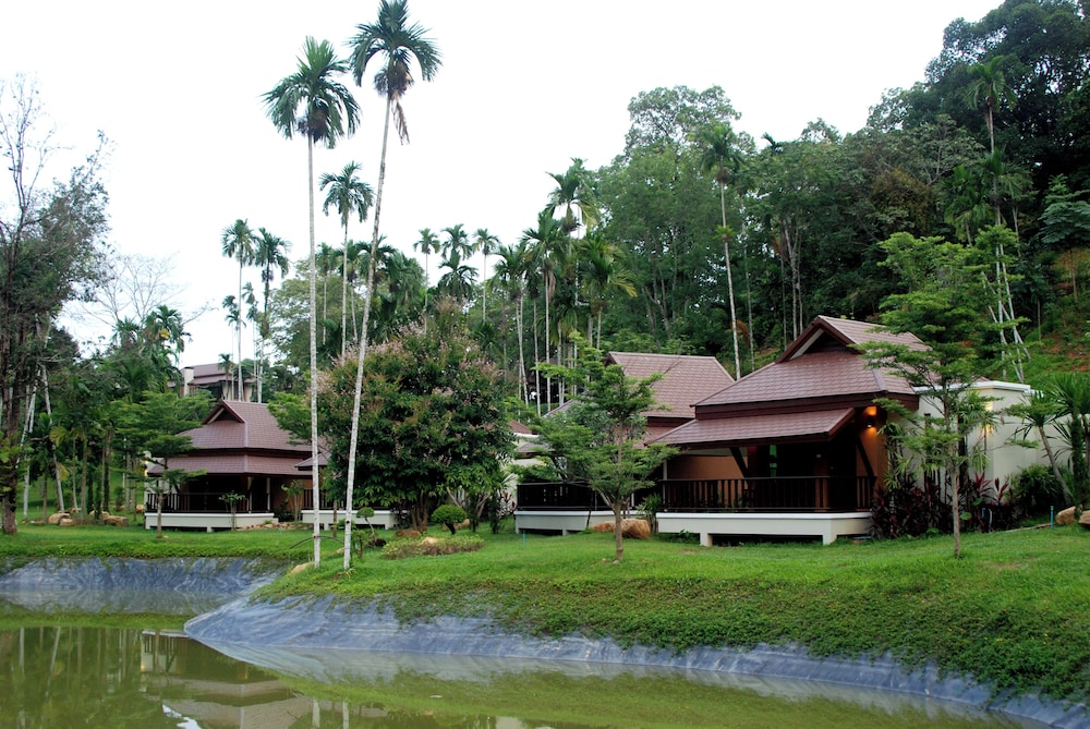 Great view of Andaman sea from dining area, pond in center with visitors (swans), good walking trail