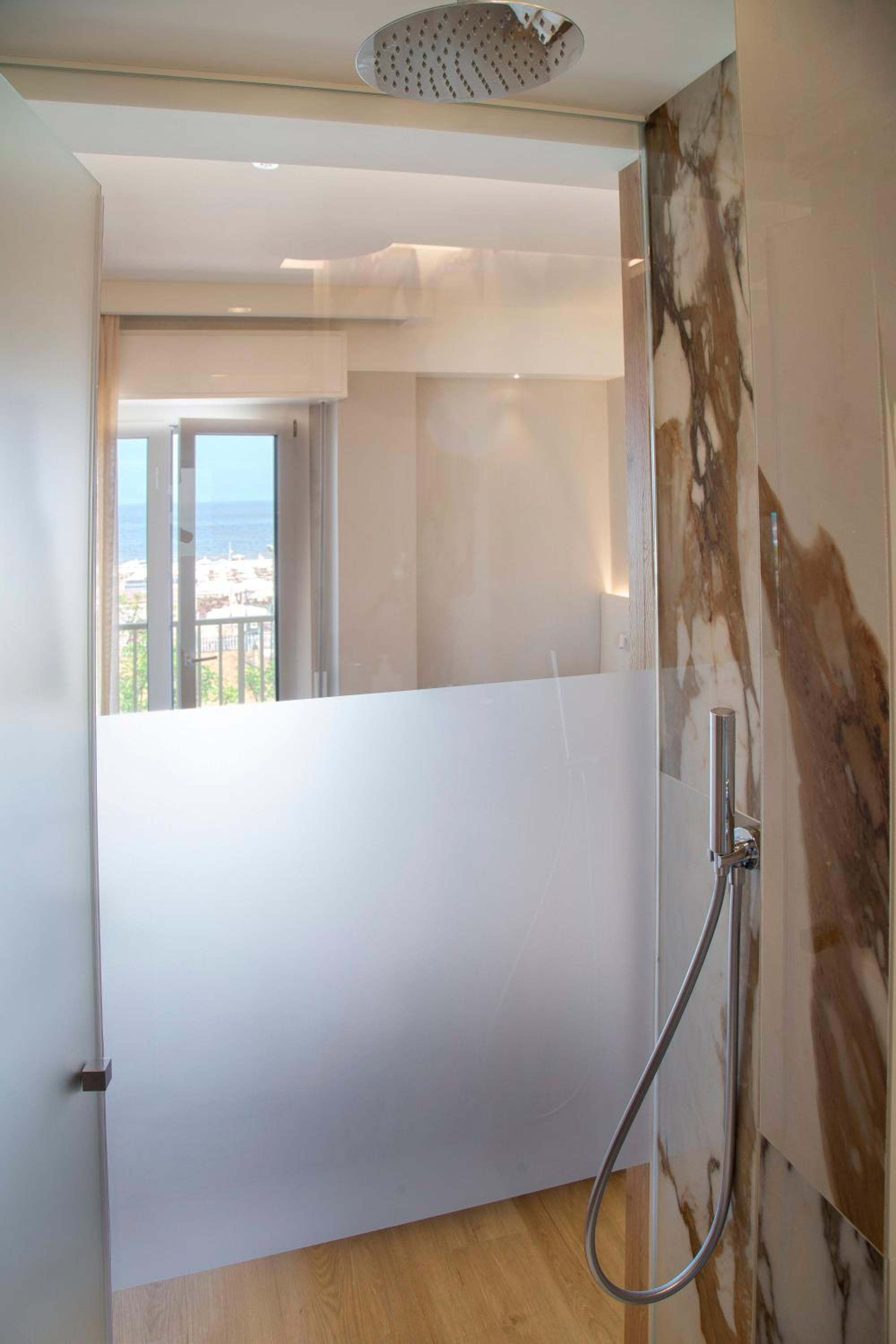 La camera vista mare e la doccia a vista sulla camera da letto molto bella.