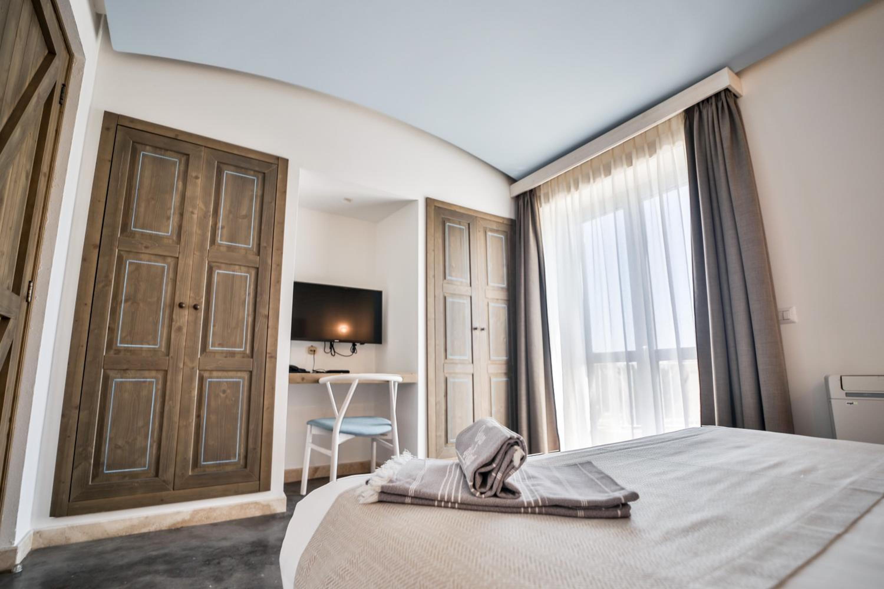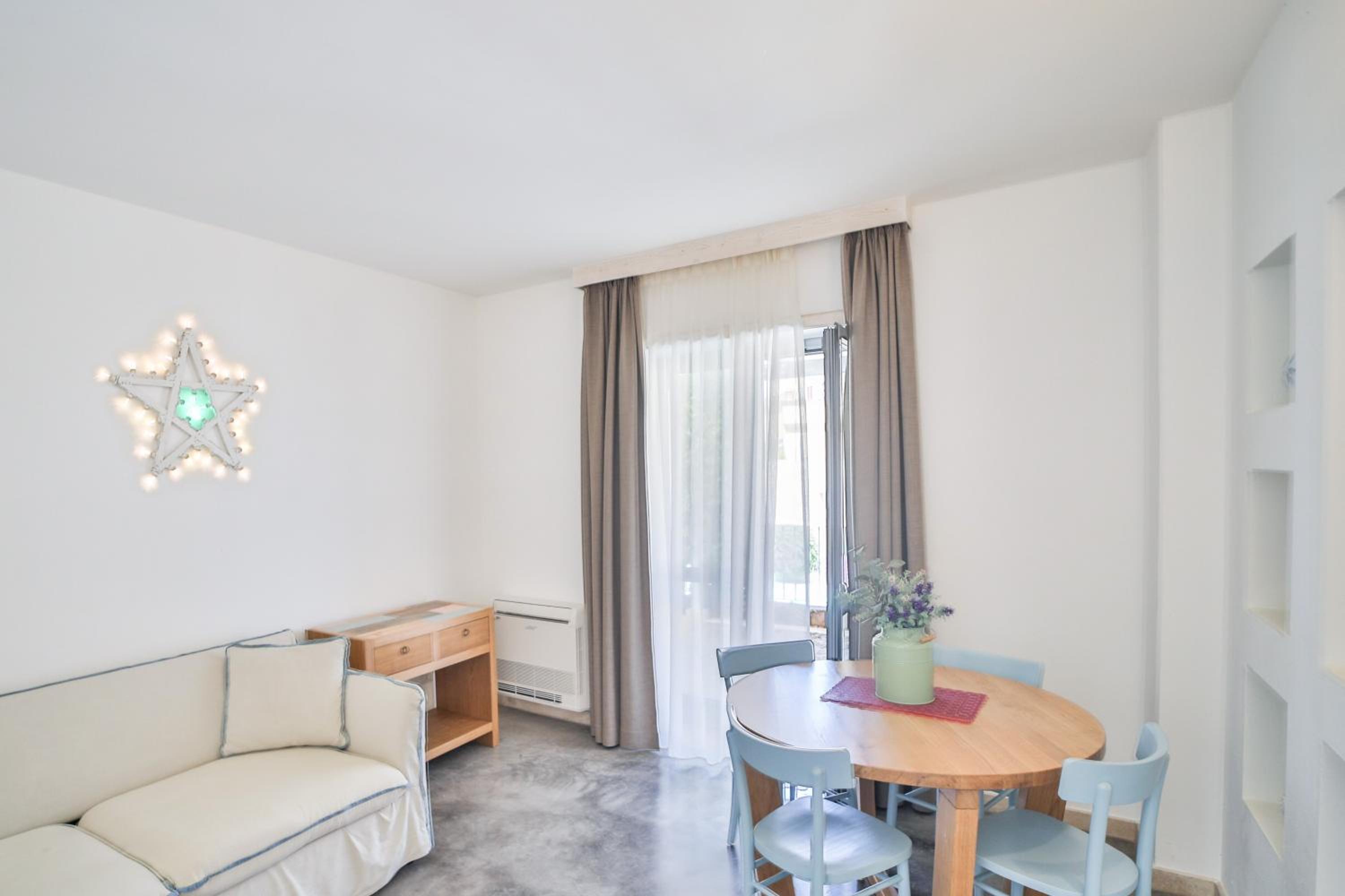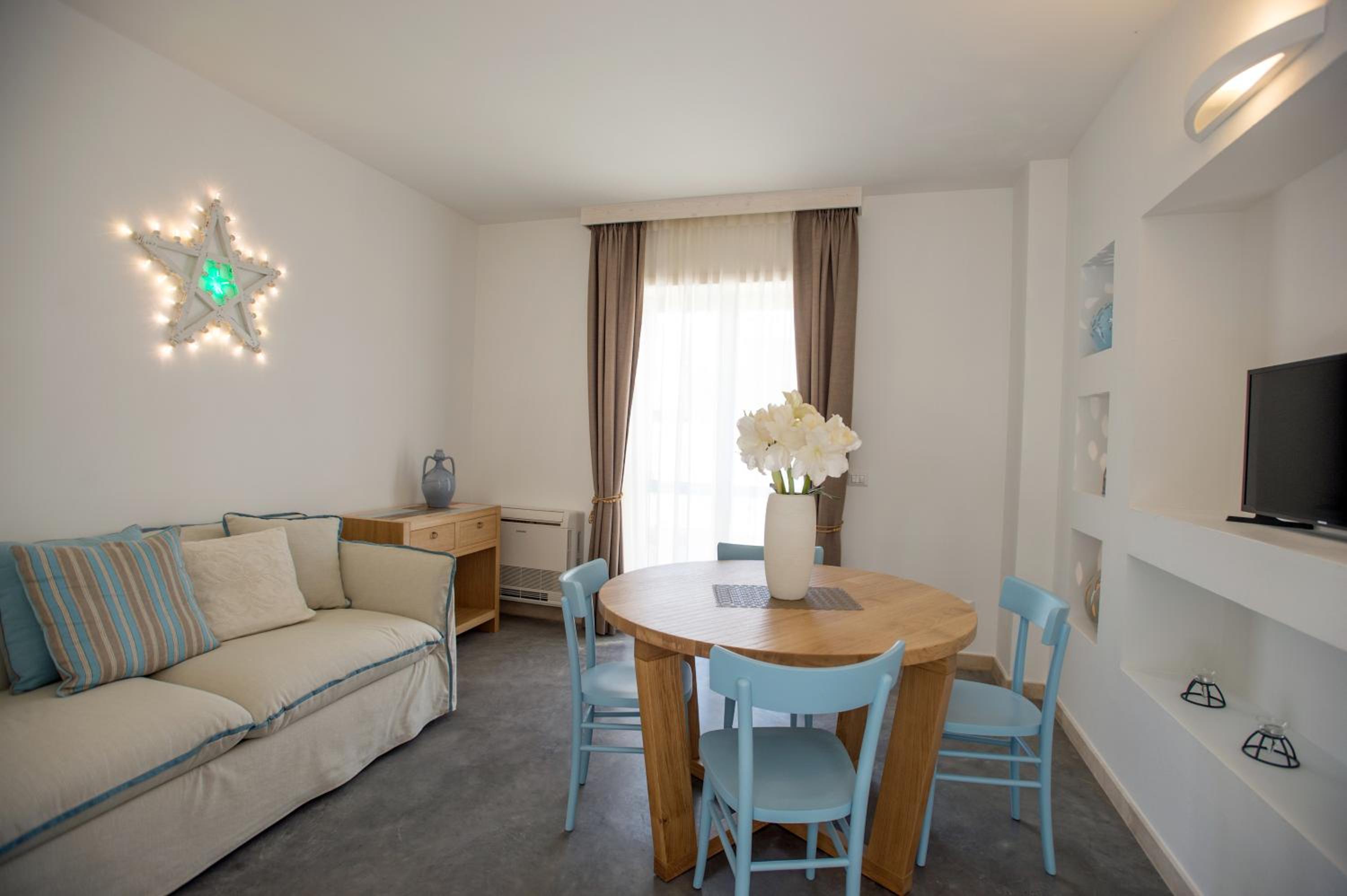 Comfortable Apartments: The apartments and studios feature balconies, kitchen/kitchenette, private bathrooms, and cozy seating areas with flat-screen TVs.