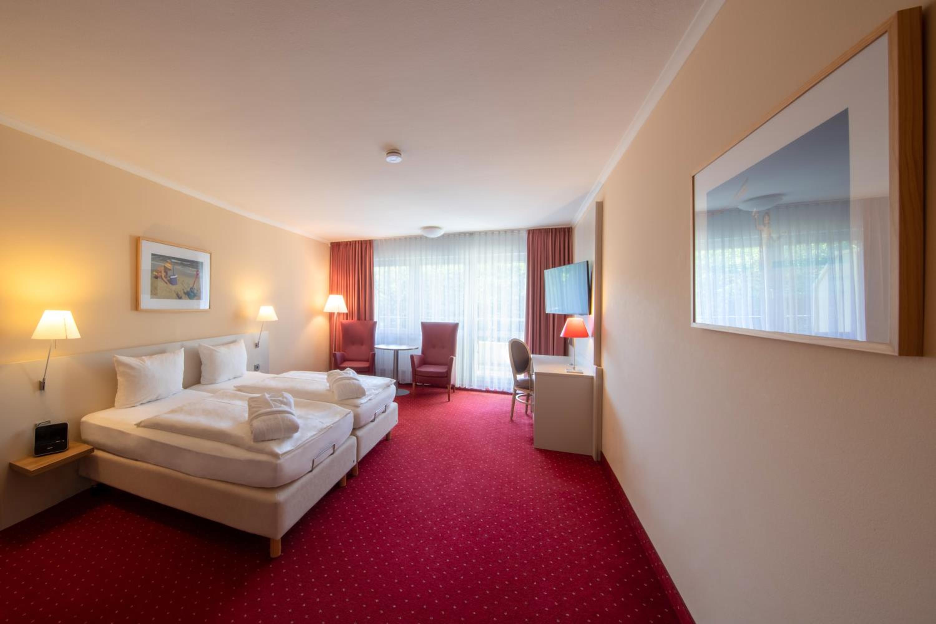 Experience a tranquil stay at Michels Hanseatic Hotel Norderney, located just a short stroll from the beach. Enjoy the comfort of bright, spacious rooms adorned with floor-to-ceiling windows offering breathtaking views of the island. The warm red and cream interiors create a cozy ambiance for relaxation.