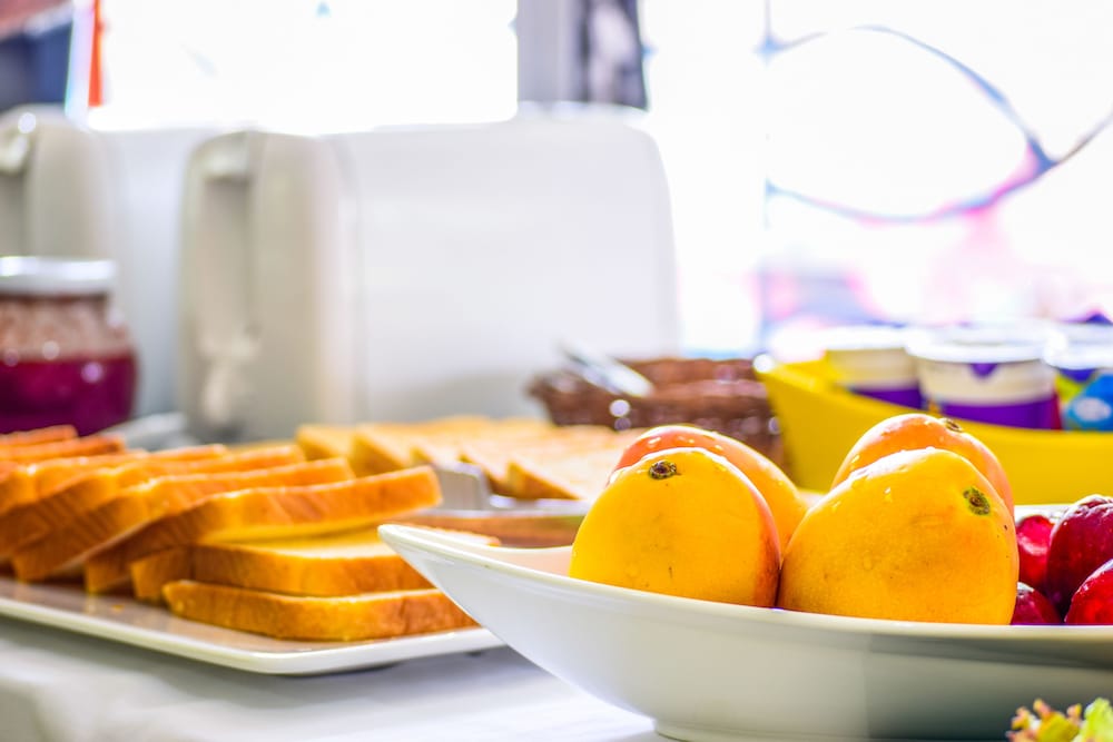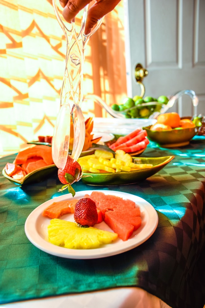 el desayuno es lo que ellos llaman ligero ( frutas, rebanadas de pan, cereales y un vaso de jugo ) si se desea algo fuera de lo que colocan en el meson, debe de ser cancelado por aparte.