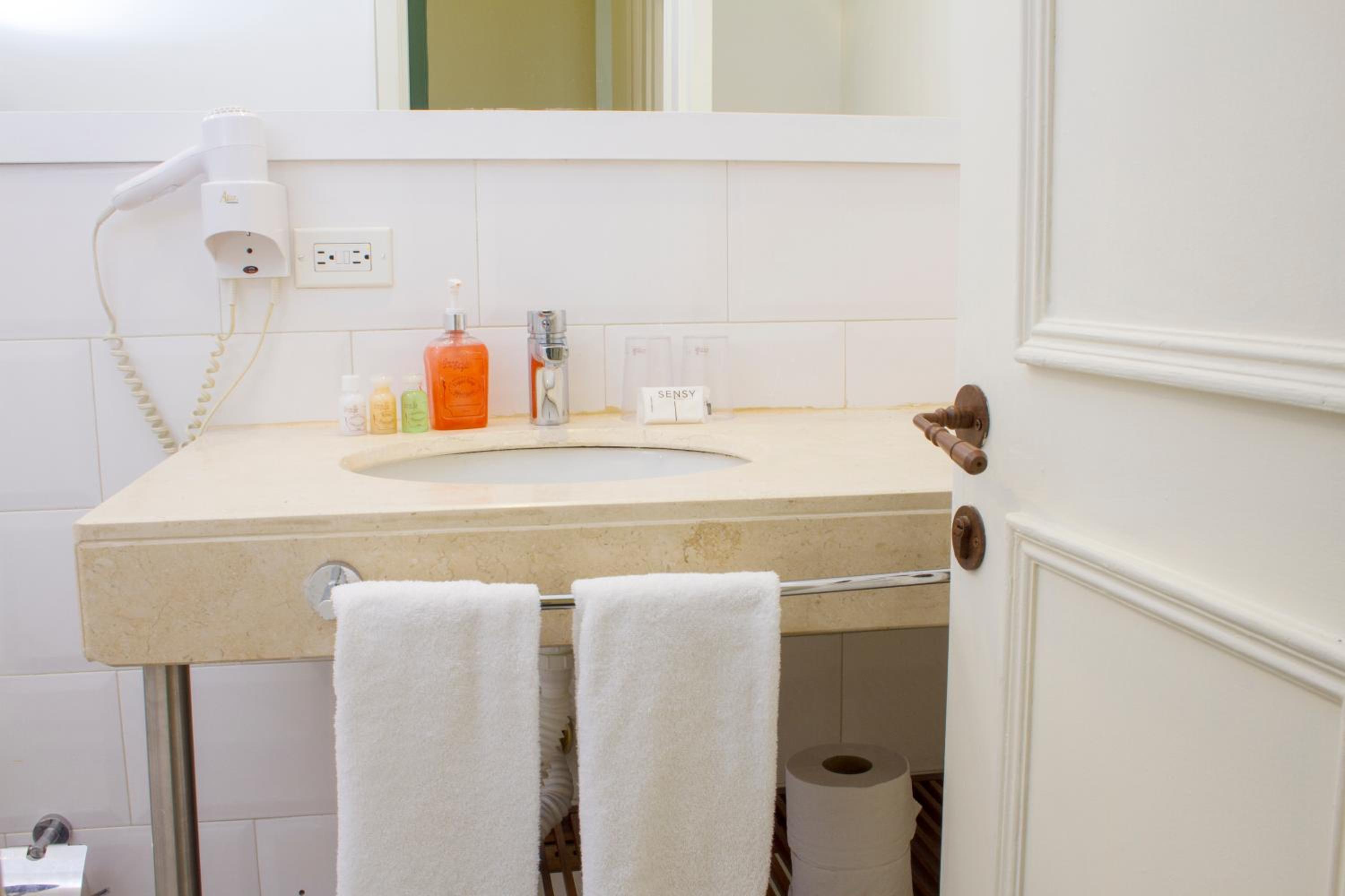 Me gustó que la habitación era muy luminosa, ya que había unos ventanales igualmente muy altos, y la decoración del techo con estuco. Había el mobiliario suficiente, con unas mesitas de noche y una mesa redonda con dos sillones, además de TV de pantalla plana y banqueta para poner la maleta. La habitación contaba con un vestíbulo en el que había un escritorio, un sofá y estaba también el armario, con varias perchas. El cuarto de baño era con ducha y de productos de higiene había unos botes de gel, champú y acondicionador para el pelo en la ducha y un bote de jabón líquido en el lavabo.