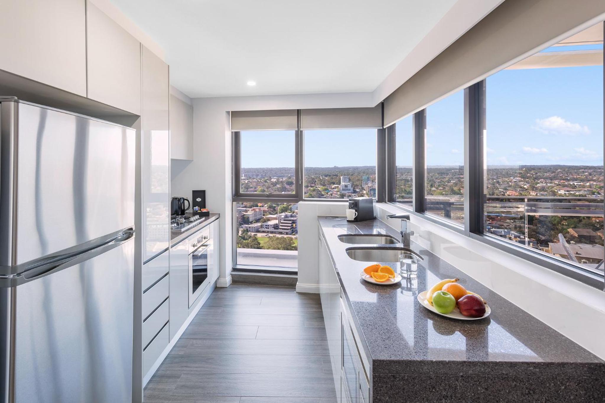 Guests can unwind in style with access to indoor and outdoor swimming pools, a 24-hour fitness center, and complimentary high-speed WiFi. The property also provides convenient onsite parking and is just a short stroll from Parramatta Station for easy transportation.