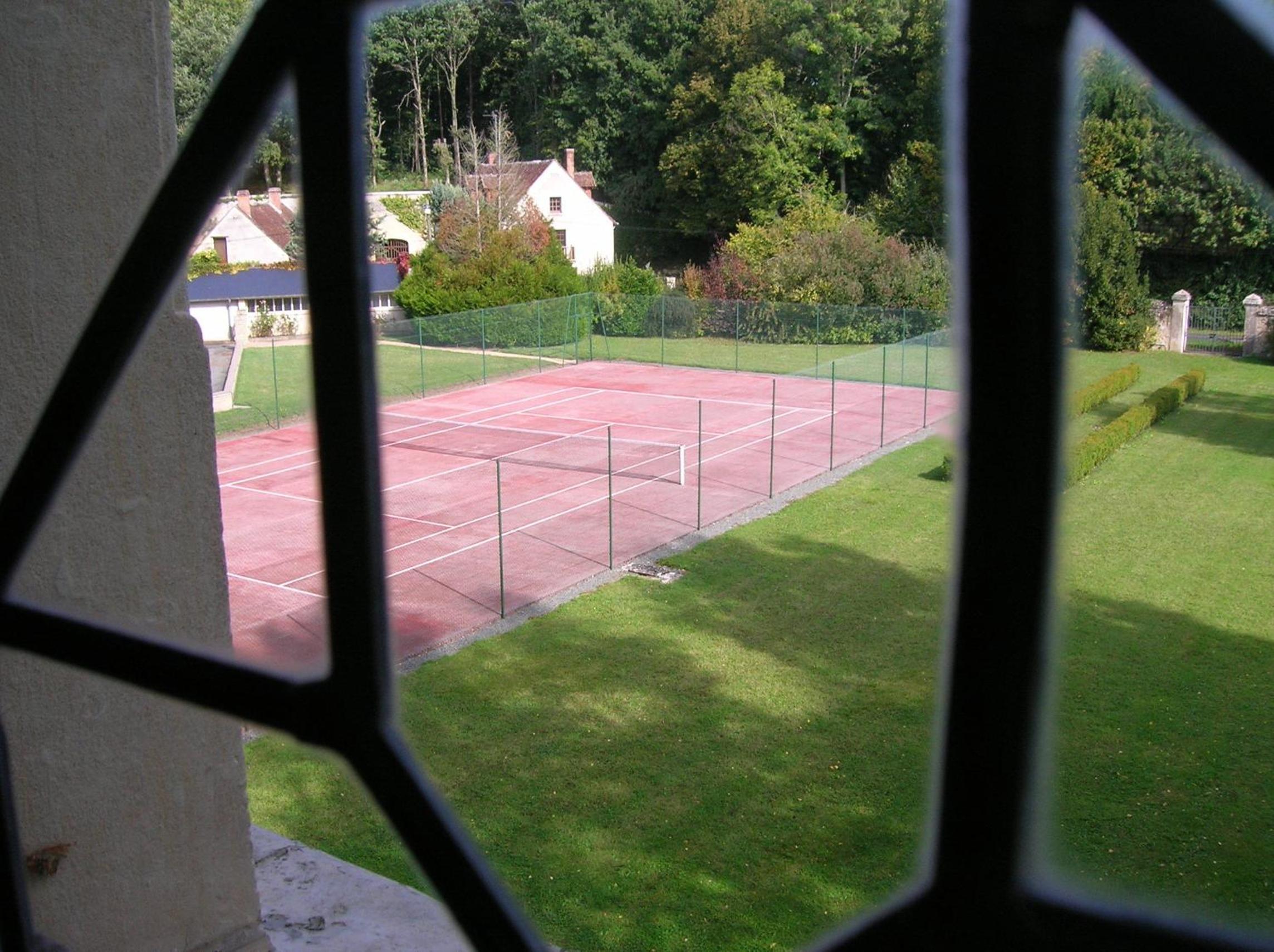 Terrain de tennis vieillot, à refaire (filet et surface du sol)