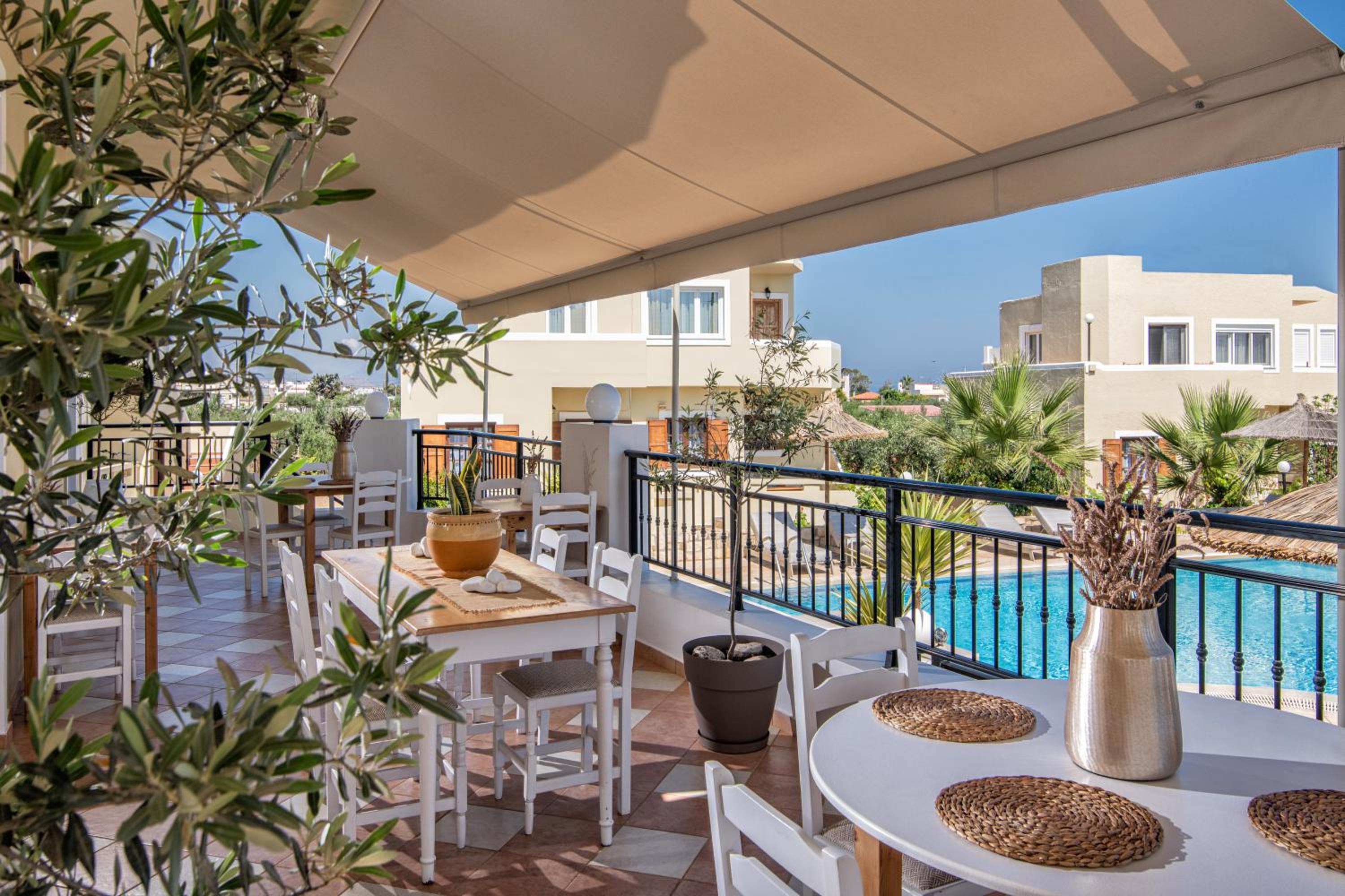 Elea Suites & Residences offers a luxurious stay just 500 meters from the beach. Each suite boasts a well-equipped kitchenette, spacious living area, and a private balcony overlooking the pool and gardens. Enjoy modern amenities such as flat screen TVs, king-size beds, and free Wi-Fi.
