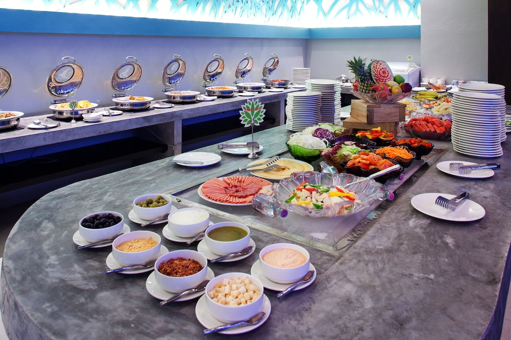 From reception it's 5 min walk to the beach which we loved, day and night. At the hotel the buffet restaurant charges £17 per head. At the beach we spent 2-3 hours over food and cocktails for approx £20 for both of us. If it hadn't been for the beach area I think we'd have been really disappointed and bored with our week here. Breakfast is a good selection but busy and noisy due to all the kids. Why not serve breakfast for adults only in the sky bar/restaurant?