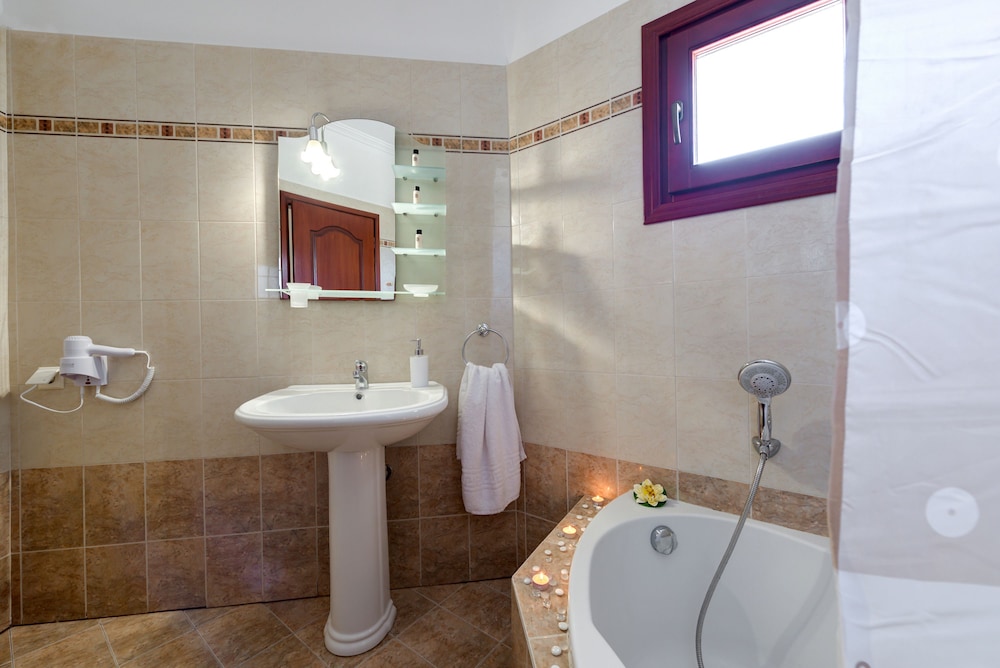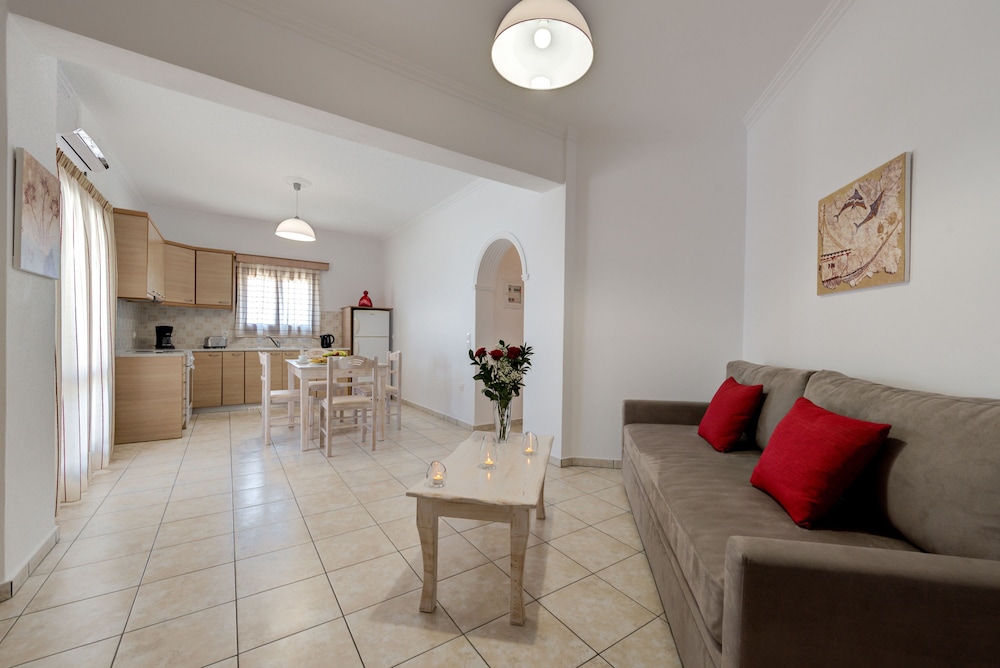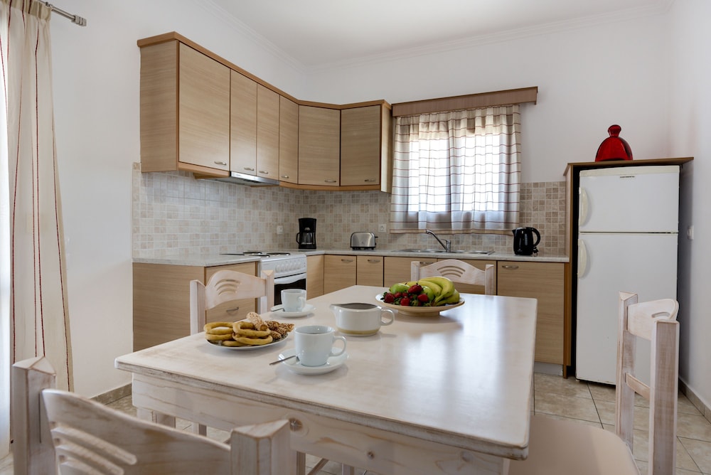 We stayed for 3 nights. Was a very pleasent experience. Room was clean. Kitchen, and lounge area was comfortable. Bedroom was nice. Bathroom had a small bath with shower. Dimitra was very hospitable, always on hand for any queries, and room service was very good with fridge being filled. Free Parking was available for our car. The shared large balcony had lovely views of the island and sea.
