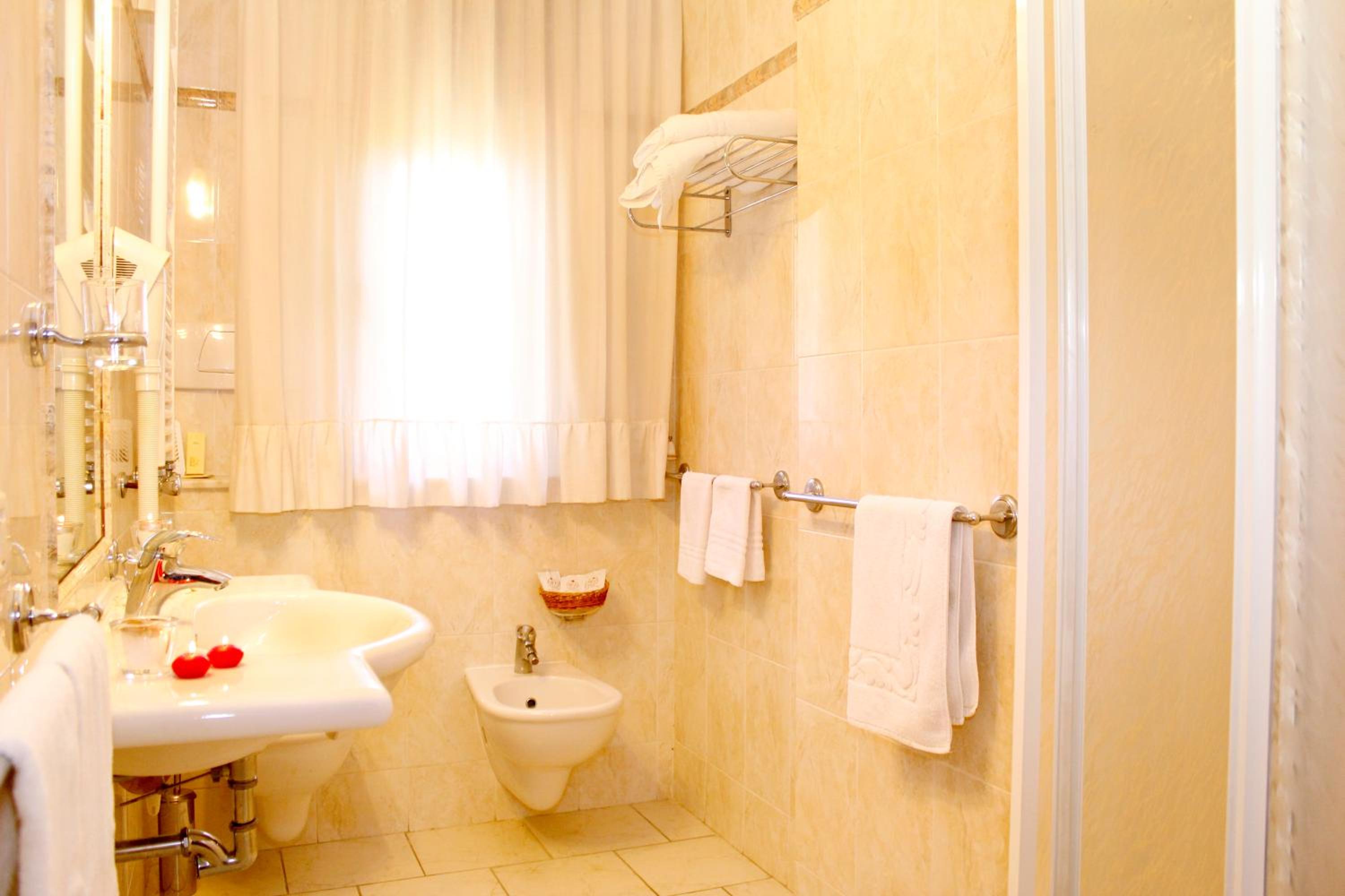 The air-conditioned rooms at Hotel Ariston are well-equipped with modern amenities including a safe, flat-screen TV, and a private bathroom with complimentary toiletries.