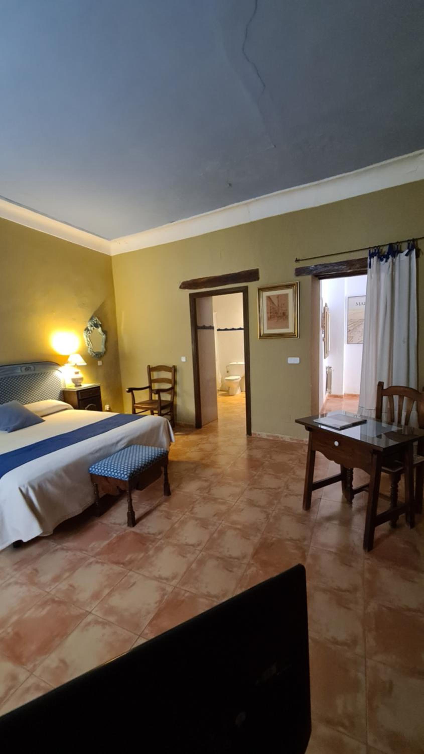 En pleno invierno la calefacción estaba apagada. La habitación congelada. Nos llevo 3 horas contactar con alguien para que la encendiera. Y por la mañana estaba otra vez apagada. Nunca hemos pasado tanto frio. En recepción nunca hay nadie. Para el check-in te recibe la señora de la limpieza con bastantes malos modos y, por supuesto, no se hace cargo de nada. El Wifi no funcionaba. El televisor no tenia mando a distancia. El colchón incomodísimo. Poquísima luz en la habitación. 4 lámparas canijas para iluminar una habitación enorme. Dos no funcionaban. Los pocos enchufes de la habitación están todos ocupados. Si desenchufas una lampara para cargar el móvil, te quedas a oscuras. Lo dicho. Una lastima, porque el palacio realmente merece la pena.