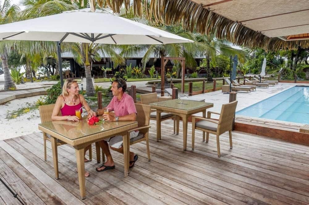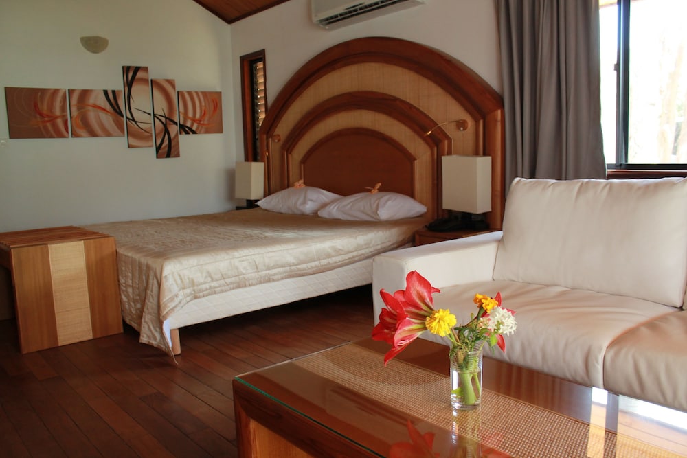 J'ai adoré le cadre, la gentillesse du personnel toujours souriant, le super confort de la literie et la vue du bungalow sur le lagon MAGNIFIQUE, la super bonne connexion wifi. Je n'ai par contre pas aimé certains détails qui pêchent pour un standing haut de gamme (vu le prix du bungalow on s'attend à beaucoup mieux ) comme par exemple les taches en pagaille sur les canapés de l'accueil, les taches sur le canapé et la chaise dans le bungalow, le tuyau de la douche qui commence à être usé et qui se coince dans certaines positions du pommeau, pas de peignoirs dans la salle de bain alors que sur le site c'est indiqué qu'il y en a, le store à lattes de la salle de bain qui ne fonctionne pas (on peut pas le lever, ni l'orienter), rien pour poser son savon dans la douche, rabattant des WC jauni par le temps et l'usure, machine à café expresso qui ne fonctionne pas, spa sans notice de fonctionnement pour pouvoir l'utiliser quand on le souhaite et pas que en fin d'après-midi, et SURTOUT le temps d'attente aux repas qui était entre 40 mn et une heure après la prise de la commande avec des cuissons de viande qui n'étaient pas les bonnes (je voulais du bleu j'ai eu du bien cuit) !!!! Je sais combien c'était difficile avec un chef cuisinier en arrêt maladie et un pauvre chef pâtissier qui a dû prendre le relais seul face à 30/40 couverts mais pour le client qui vient ici pour du haut de gamme c'est un peu inadmissible.....Tout cela a été dit au personnel et écrit puis donné à l'accueil.