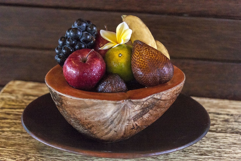 B. We booked our rooms with breakfast. Breakfast consisted of 3 options only: western; Nasi Goreng (chicken fried rice with egg on top); mi Goreng (chicken fried noodles). Vegetarian substitute can be done. It comes with fresh made juice, fruit plate, coffee/tea and water. The first day we didn't get fruits. The third and fourth day we didn't get water. A bit odd there but could be due to whomever were on duty.