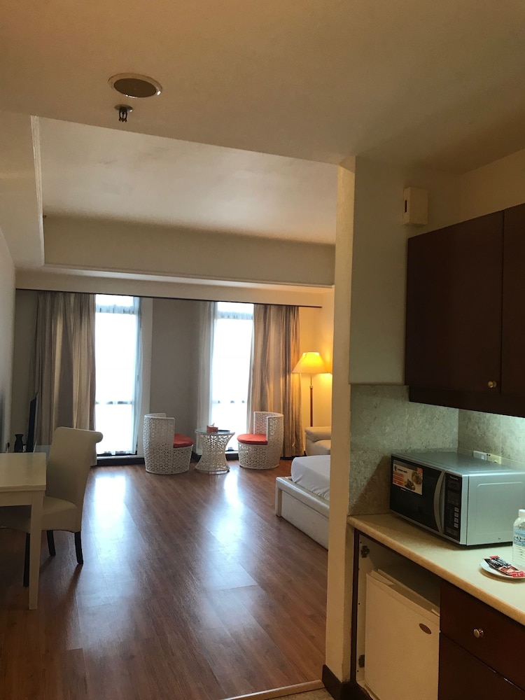 The apartment is on the east side of Times Square. There is no reception as it works like private leasing. We had to call the no. listed on the confirmation to get someone to check us in and when checking out. The deposit of RM200 must be in cash. The 3 of us booked a Superior Suite (Premier) and were given a queen size bed and a single bed that was placed in the living room. The living room has a coffee table and a 3-seats sofa with a TV that didn't work during our 1 night stay. The bathroom is inside the bedroom and linked to the toilet which can also be accessed from the door beside the small kitchen. A microwave oven and electric kettle were in the kitchen but we didn't use any of them. Besides the bar soaps, there was shampoo and 2 toothbrush sets and 2 bath towels for the 3 of us. It was convenient for us to stay here as our coach dropped us in front of Times Square at around 5 am. However, this stay is an experience that we will not repeat.