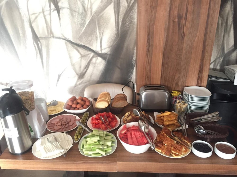Very easy to find when coming from the north, which is the side of Burgas where the airport is located. Modest forecourt and frontage to the road, with a larger cleared area next door for extra parking.. Reception was welcoming with very good English. Rooms are located over two floors with no lift. The front looks across the road to a park area, the rear is rather more built up. The room itself was of good size with two large twin mattresses on a queen size base. Pillows were a little wanting if you need greater support. Breakfast was functional, peach juice would appear to be more in vogue than orange juice in Bulgaria. The hot food servings could be a little slow to be replenished but were freshly cooked. Overall a very good experience at a good price.