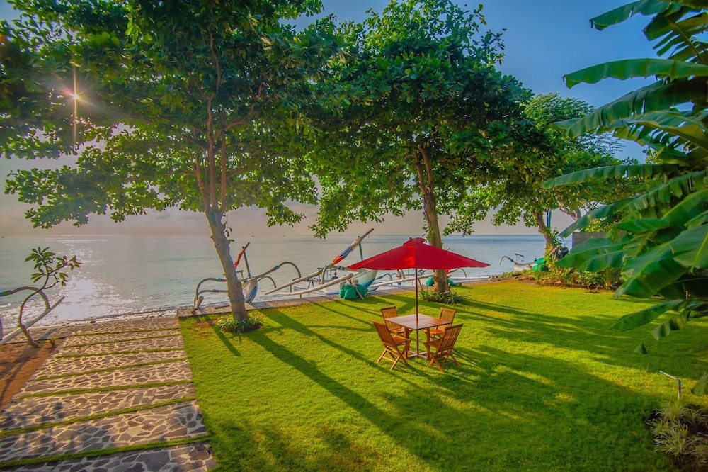 The resort is set on a hill with dramatic views of the sea. It has it's own beach, with good snorkelling. It is quiet, which is welcome compared to the crowded beached in Amed town. Great rooms and service. Highly recommend!