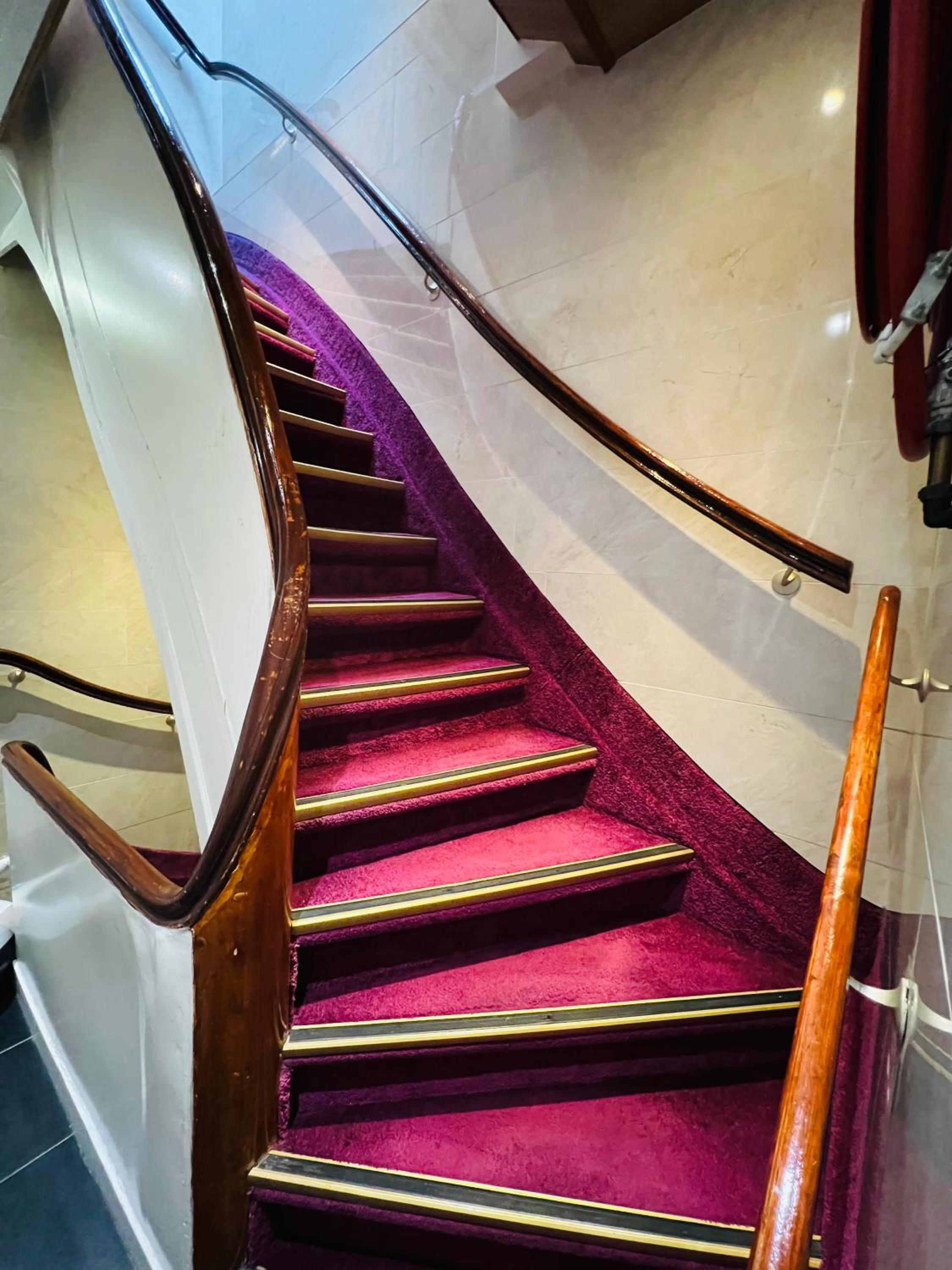 A steep, narrow staircase.
