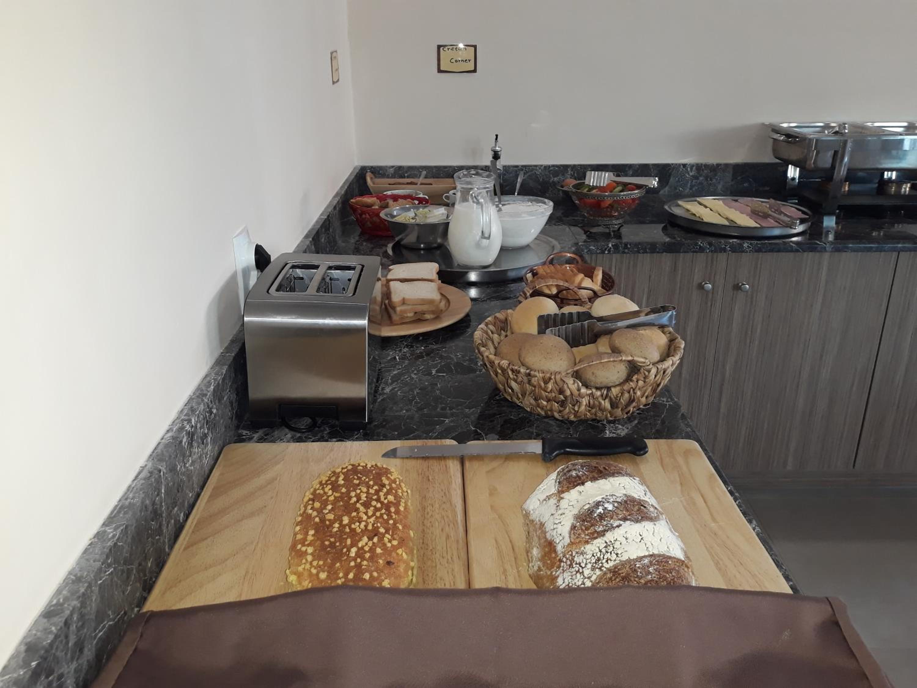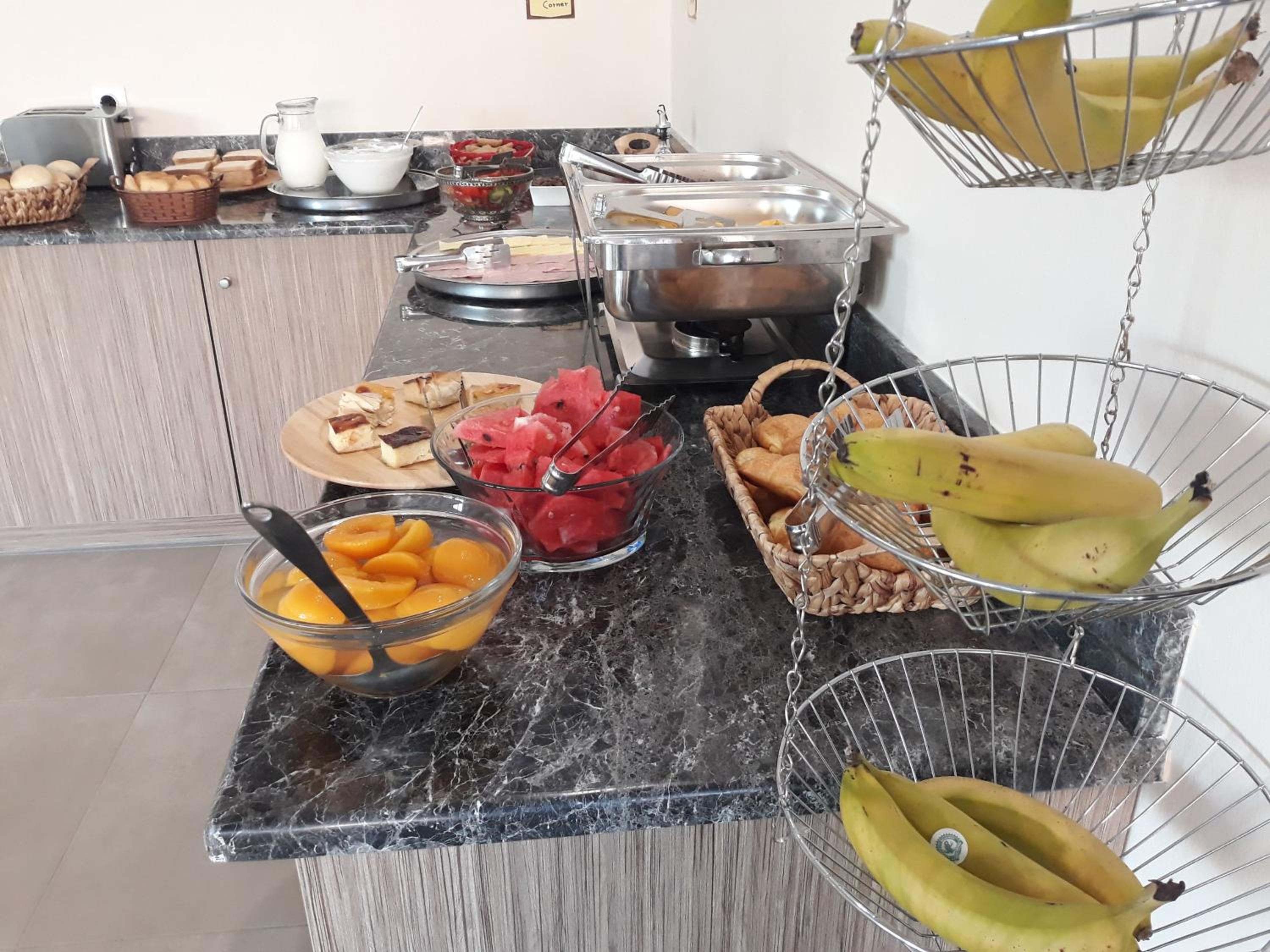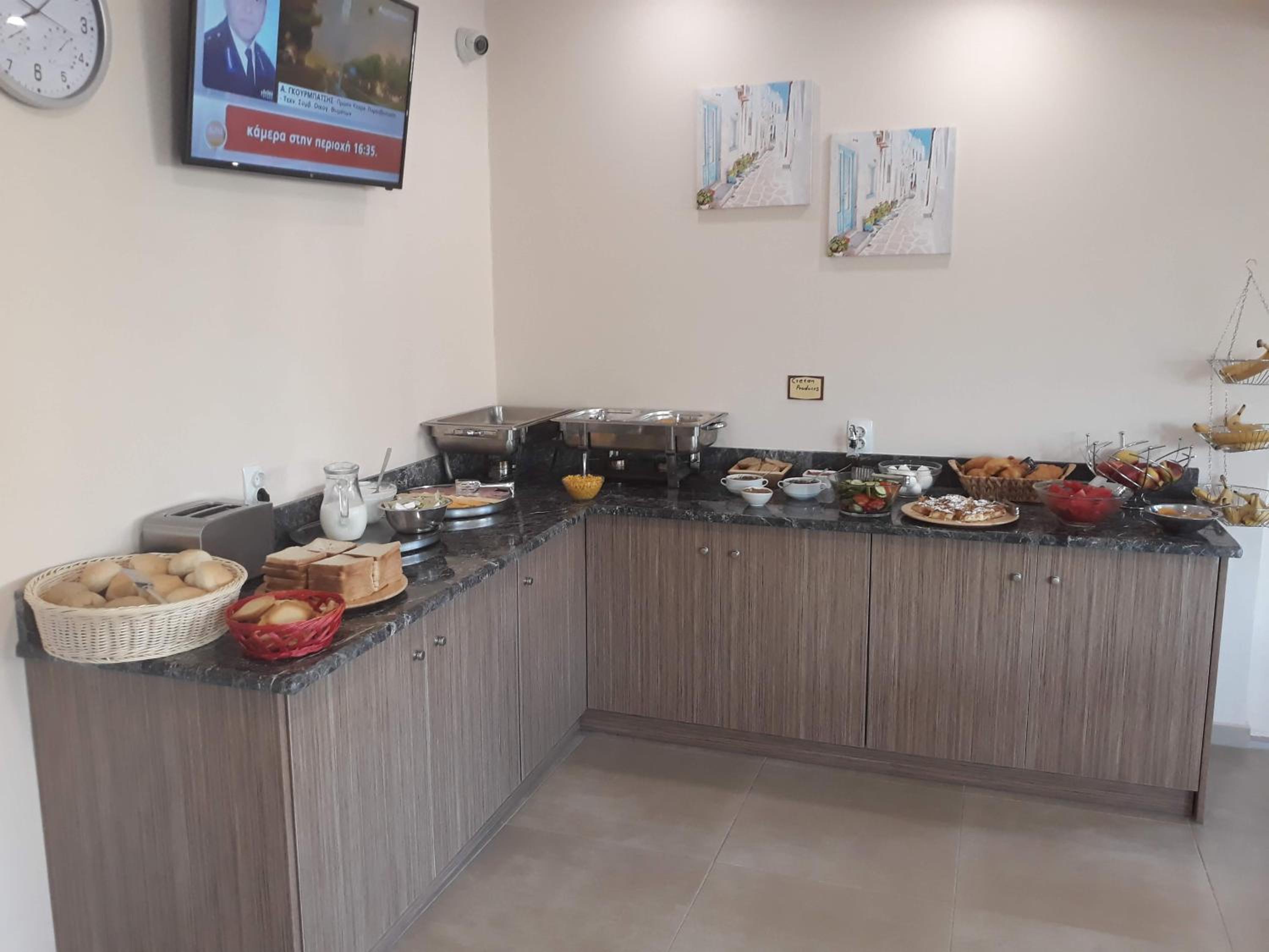 Der Frühstücksraum war sehr ungemütlich. Obwohl es bis 10 Uhr Frühstück geben sollte war bei unserem 2 tägigen Aufenthalt das Buffet kurz nach 9 Uhr gut geleert, besonders die griechische Spezialitäten. Auch nach Nachfrage wurde es nicht aufgefüllt. Dieses kannten wir von anderen Unterkünften nicht.