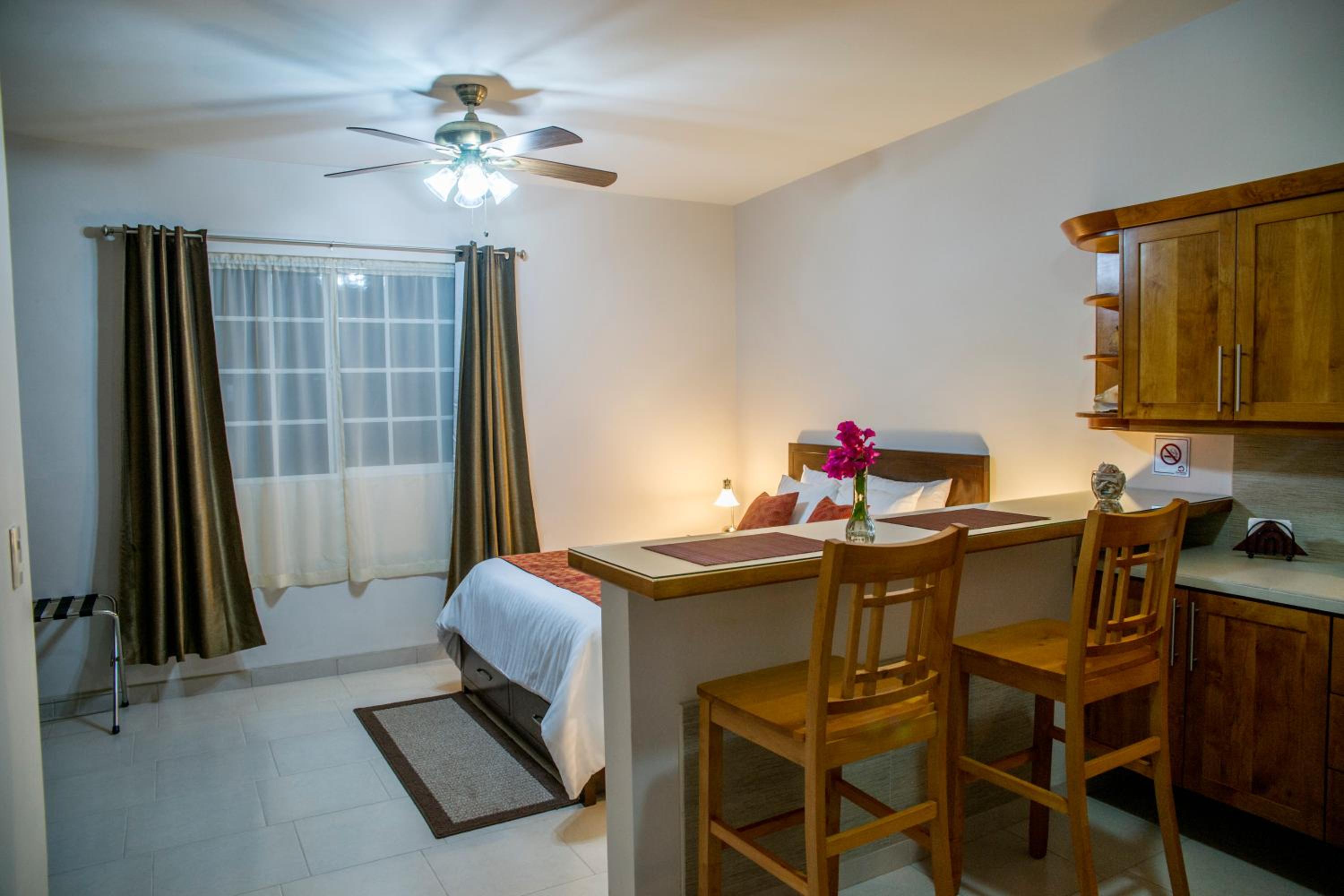 We were very impressed with Bugambilias Suites and hope to stay here again! It is a courtyard building tucked away behind an unassuming street frontage. It seems to be a smaller hotel than I had guessed from the photos, which makes it feel even more private and peaceful. The room we stayed in was like a studio apartment. Spotlessly clean and comfortable, with a good-sized kitchen, powerful A/C and lots of storage space for personal items and food. There is a supply of drinking water down the hall, which we really appreciate.