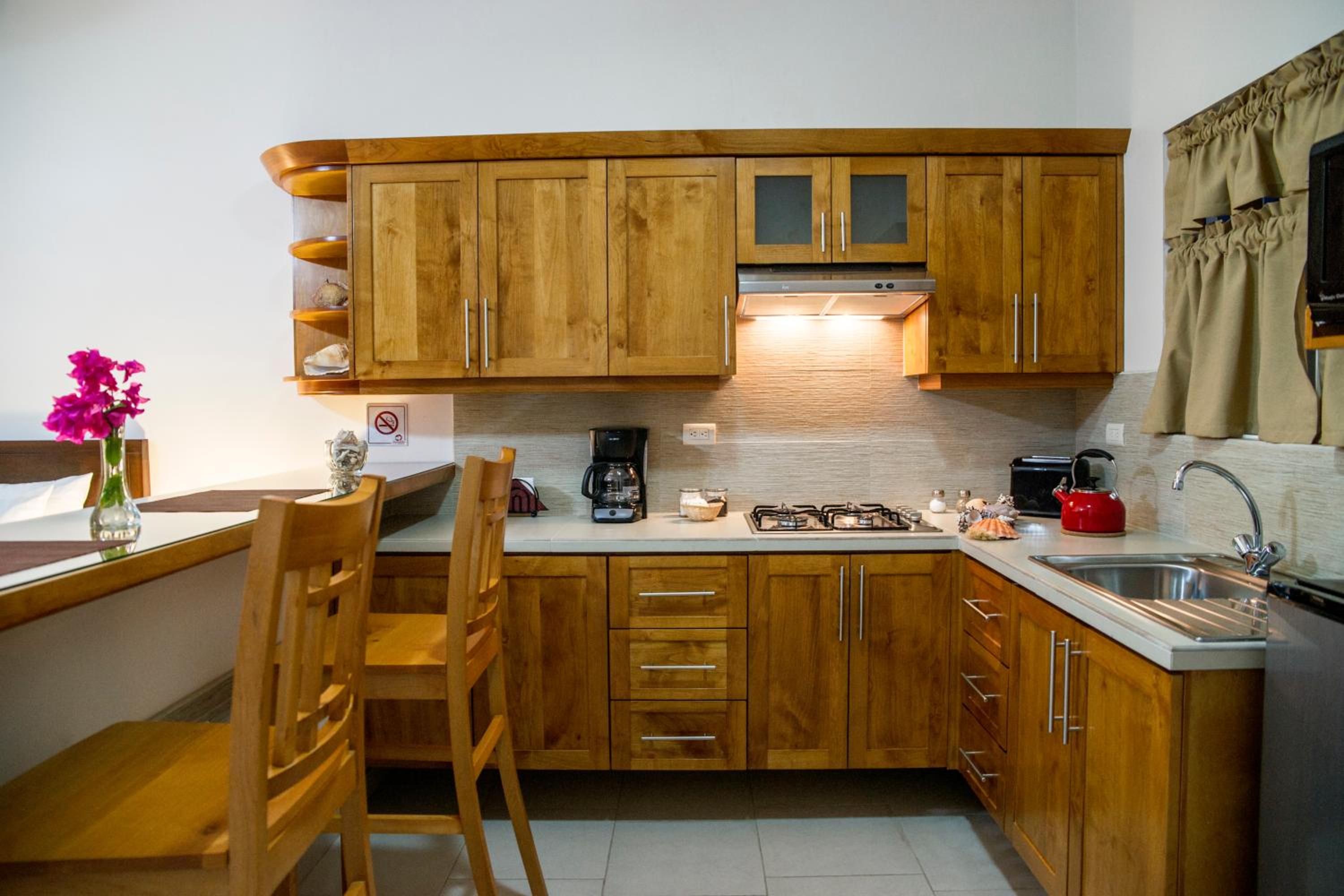 This small hotel is top notch. Staff is friendly and helpful, and the facilities are well maintained and clean. The kitchen has the needed utensils for cooking. The bed is very comfortable. The terrace on the top floor is a bonus relaxing. You won't regret a stay here.