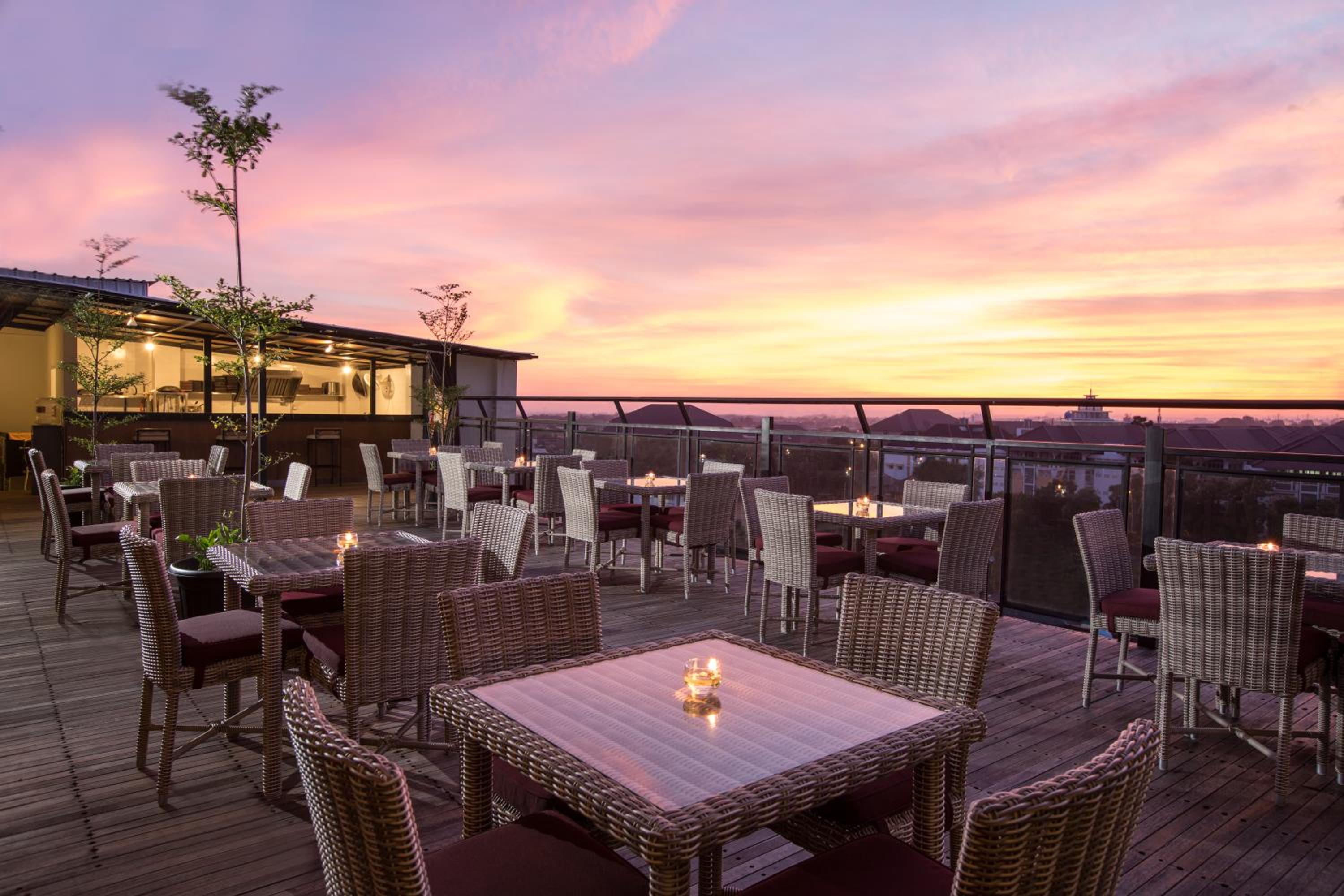 Experience breathtaking views of Yogyakarta from our rooftop terrace at Yellow Star Ambarukmo Hotel. Enjoy the serene beauty of the city while sipping on your favorite drink.
