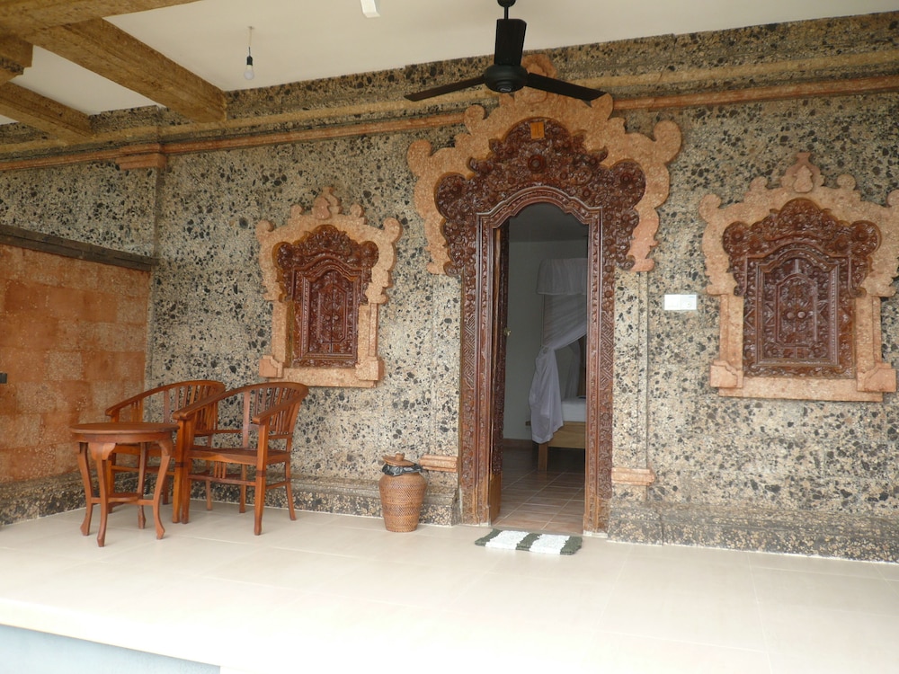 Het hotel is niet schoon, erg vieze ramen en een waterfles waar het mos bijna opgroeide en je in t restaurant kon hervullen.. hadden kamer 4 in het bijgebouw. Wel lekkere sofa op de patio. Toch geeft het direct geen veilig anti-Balibelly-gevoel. De kamer zelf is comfortabel. Goede airco, fijn bed. Klamboe. Het mooiste van t hotel is de tuin en vooral de ligging. Je loopt zo de zee in om direct te snorkelen, het rif ligt nog op geen 3 meter de zee in. Dus locatie top, maar hotel mag echt wat doen aan hygiëne.