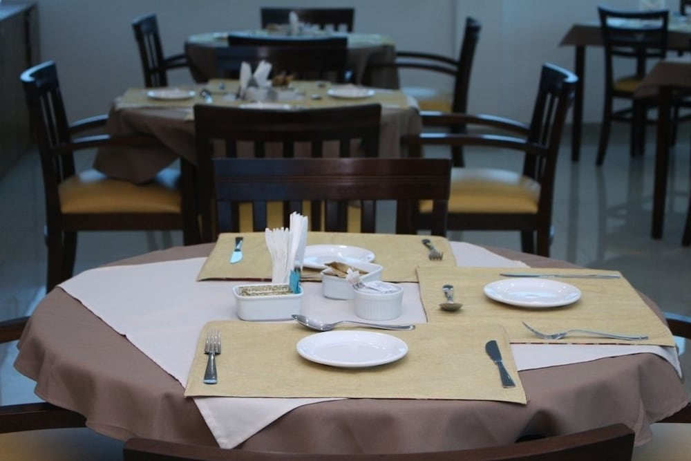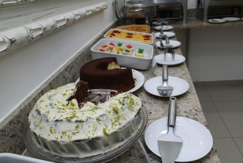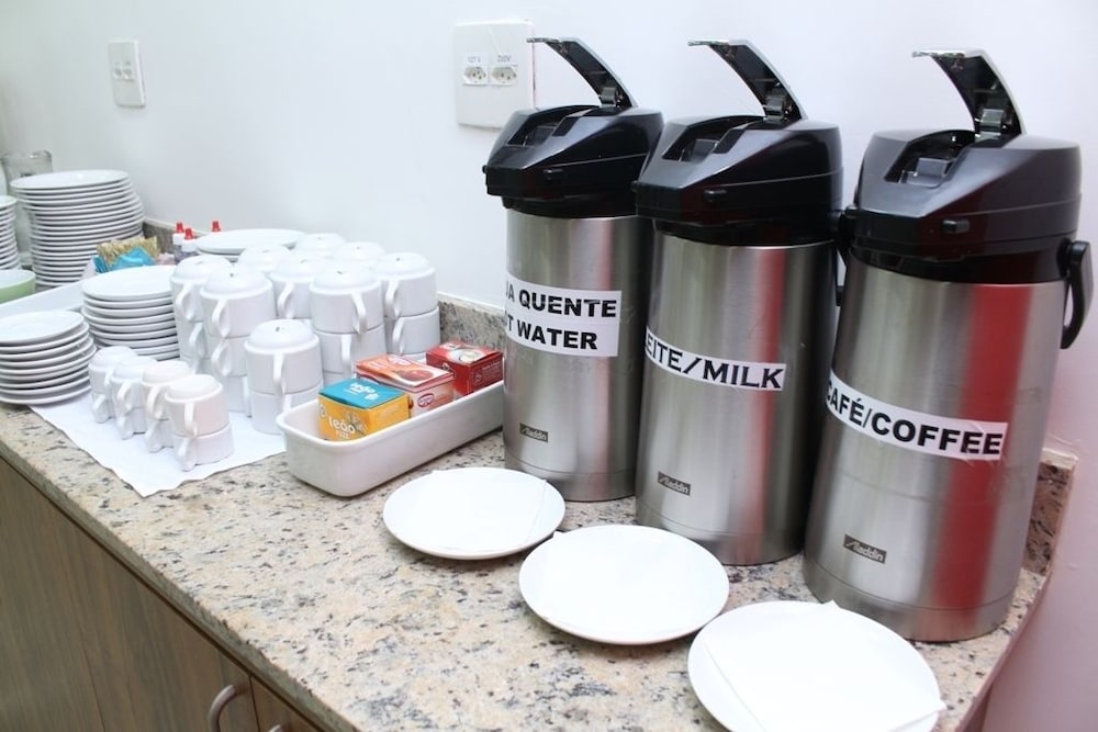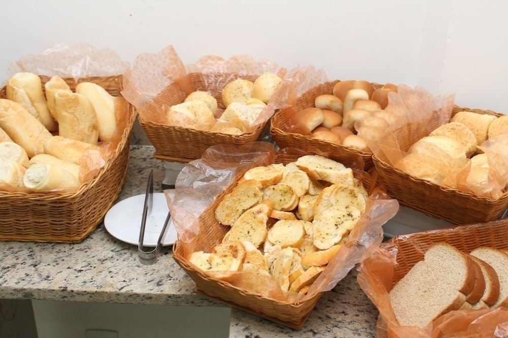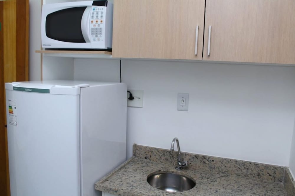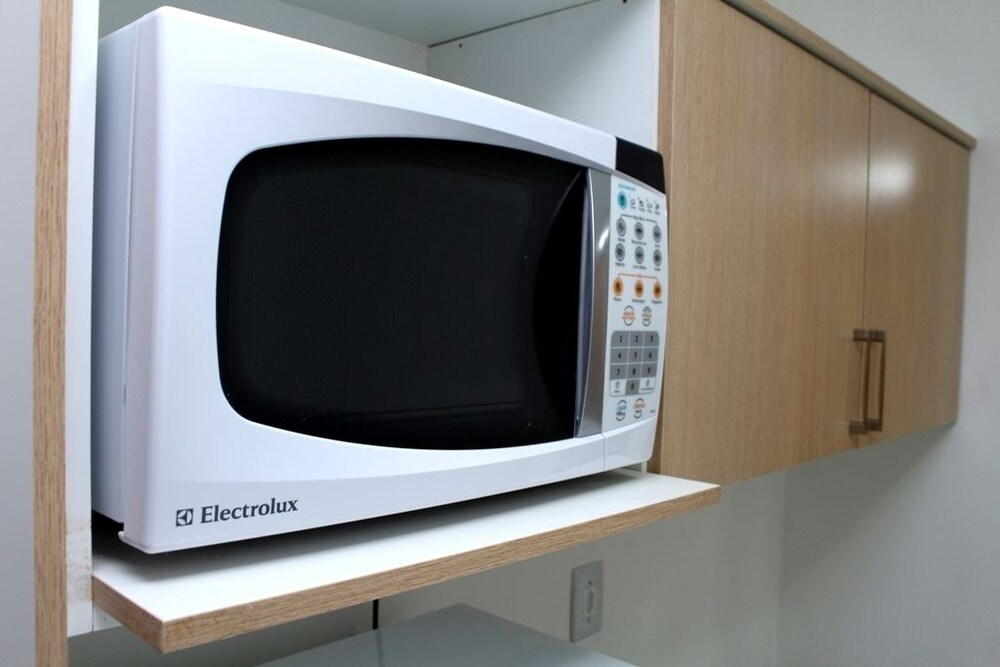 Quartos simples com geladeira e micro-ondas, mas sem talheres e utensílios. Café da manhã básico e garagem coberta no subsolo. Banho com chuveiro elétrico.