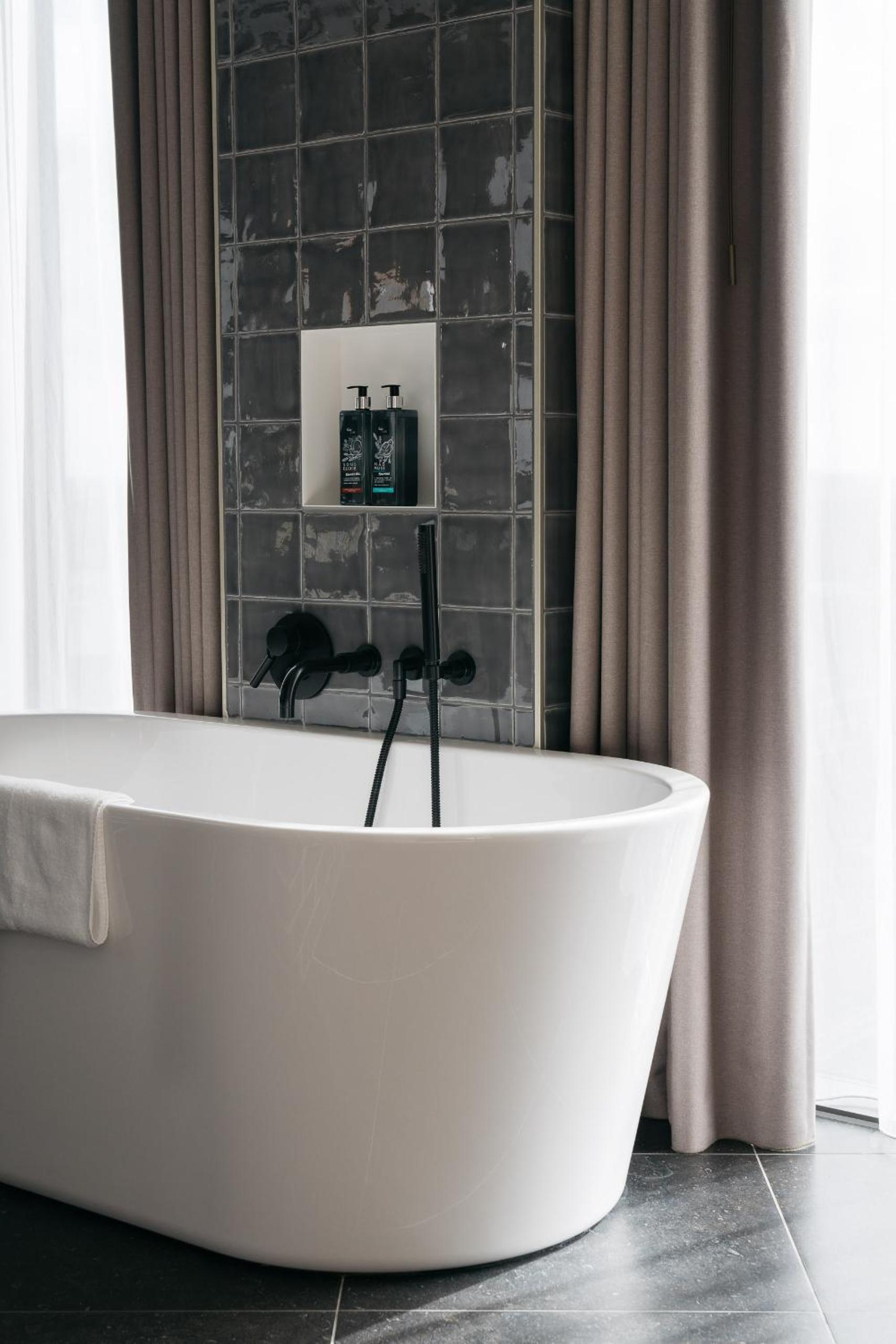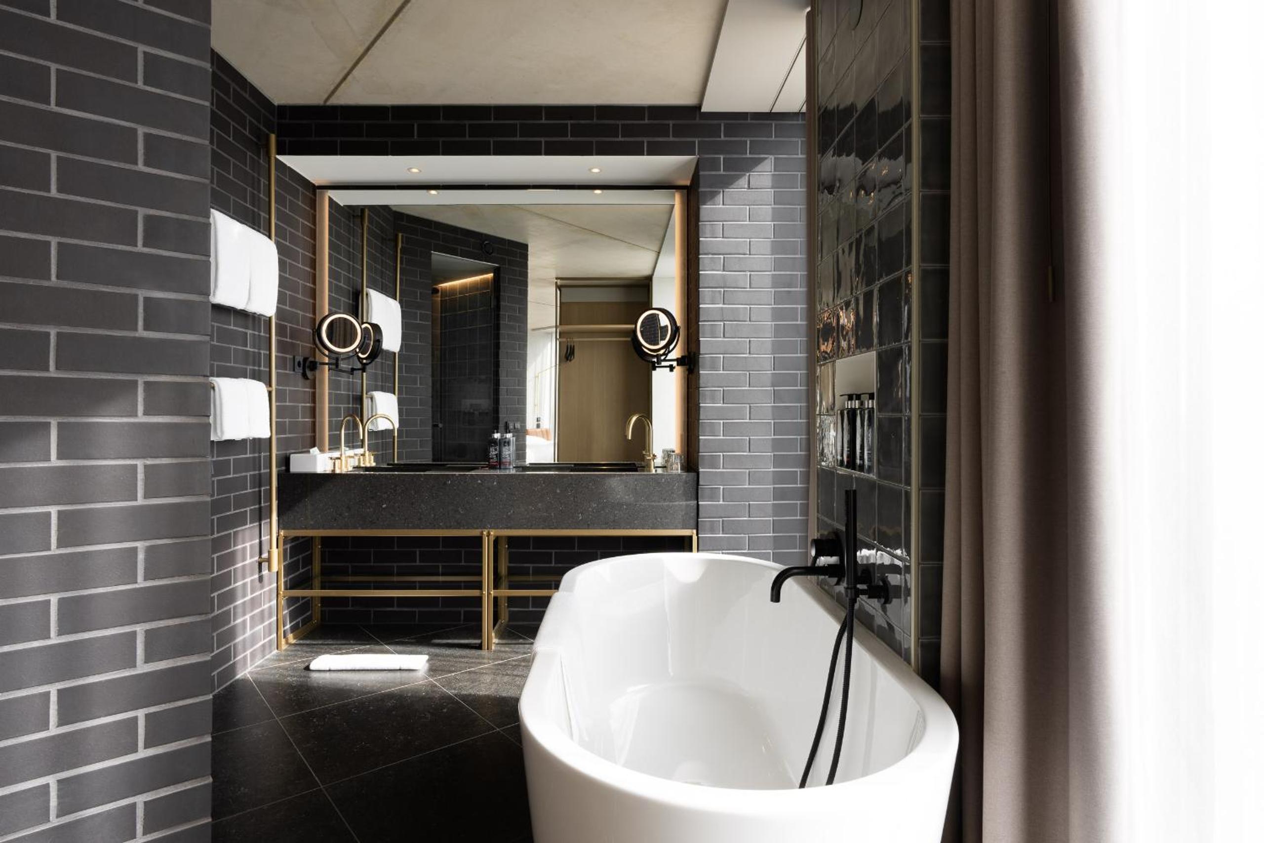The Ruby Emma Hotel Amsterdam offers a unique blend of luxury, technology, and sustainability. With floor-to-ceiling windows in all rooms, guests can enjoy stunning views of the Amstel river. The hotel's cutting-edge technology includes an iPad for controlling lighting and heating, as well as a flat-screen TV with AirPlay. The private bathrooms feature high-quality Ruby Care products for a touch of indulgence.
