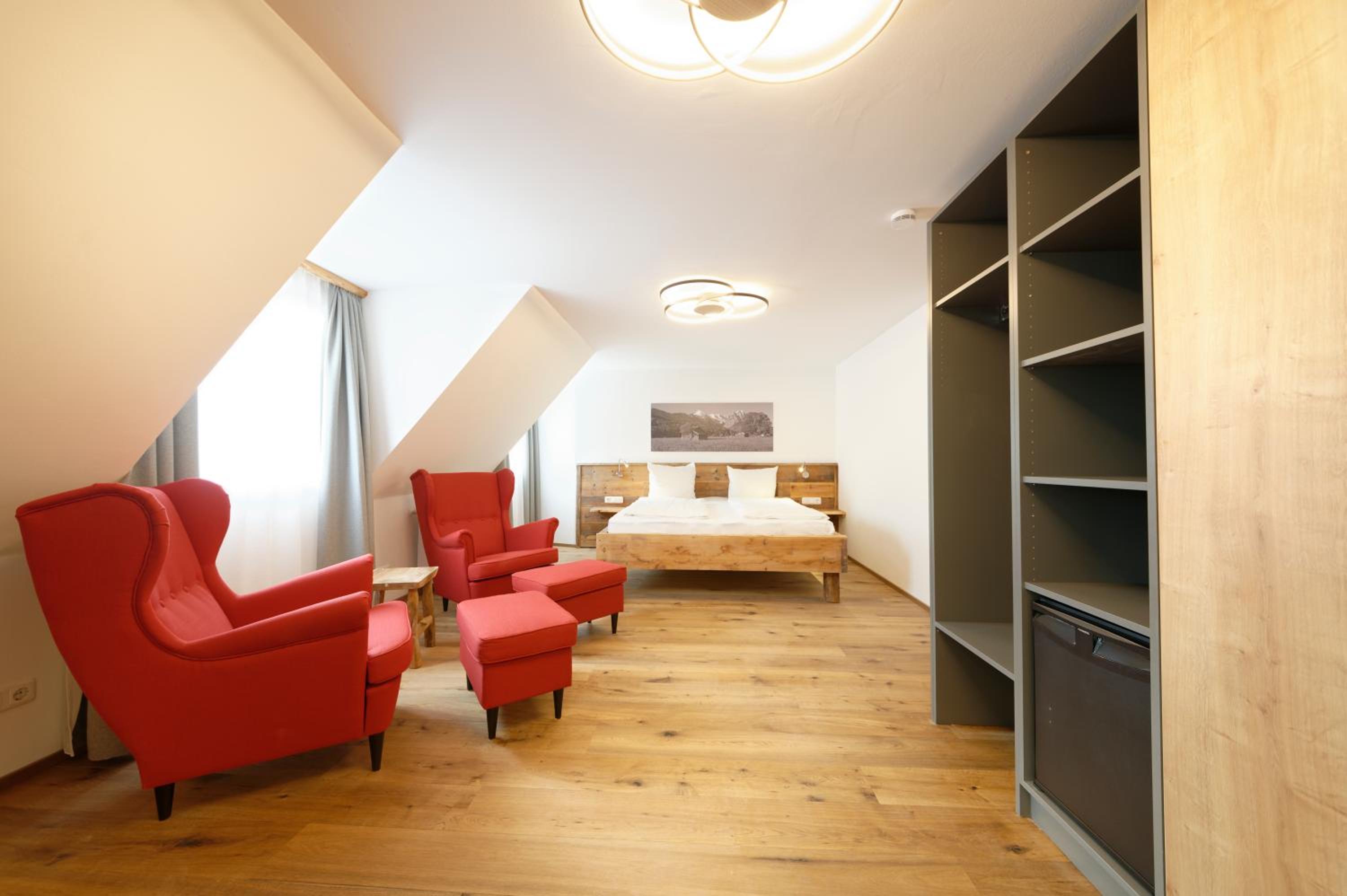 Single room for 3 people was surprisingly comfortable. One large bed for two people and a single bed for the third. Breakfast was impressive and readily available. Location is superb for Garmisch activities. 5 minutes to Zugspitze cable car and main train station. Cheapest option I could find, but felt genuine and had everything we needed. Excellent value.