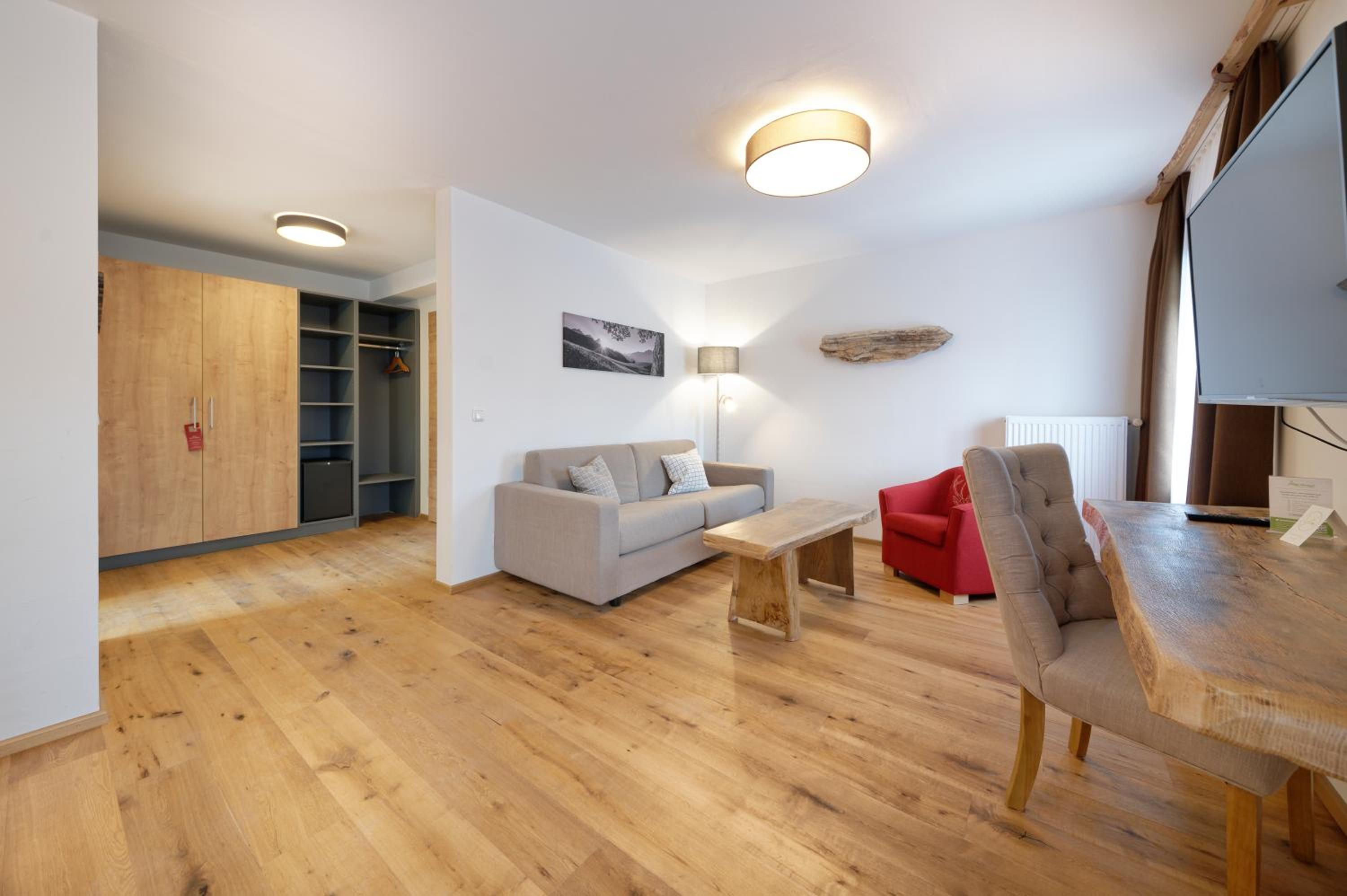Charming Accommodation: The classically decorated rooms at Hotel Alpengruss feature bright colors, wooden floors, and furnishings, providing a cozy retreat after a day of outdoor activities.