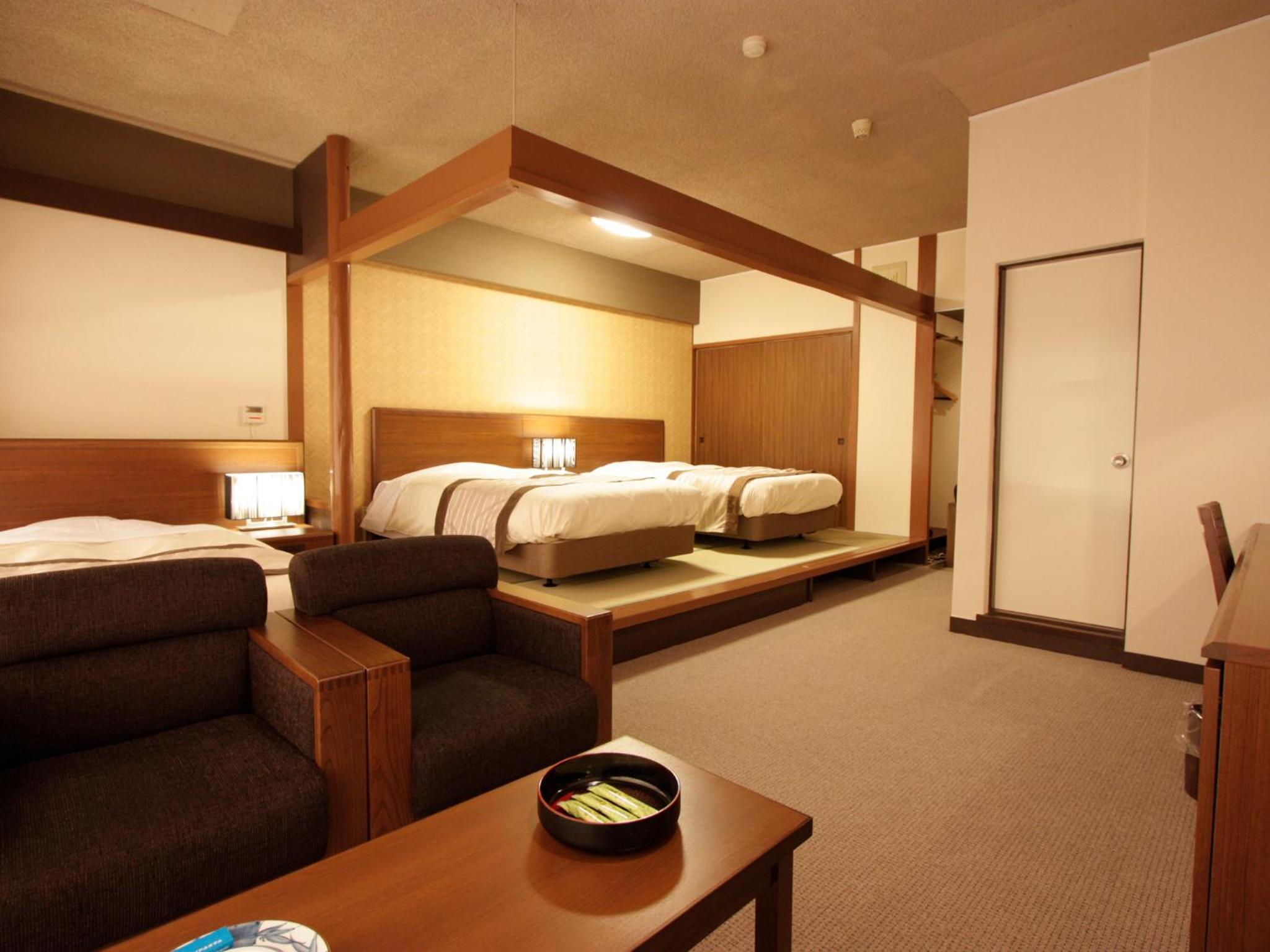 Charming Accommodations: Enjoy the blend of Western beds and traditional tatami flooring in the air-conditioned rooms, complete with modern amenities like a tea maker and flat-screen TV.